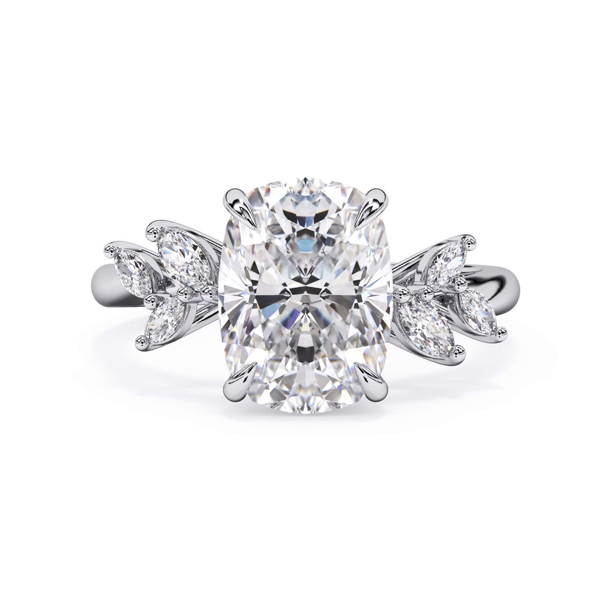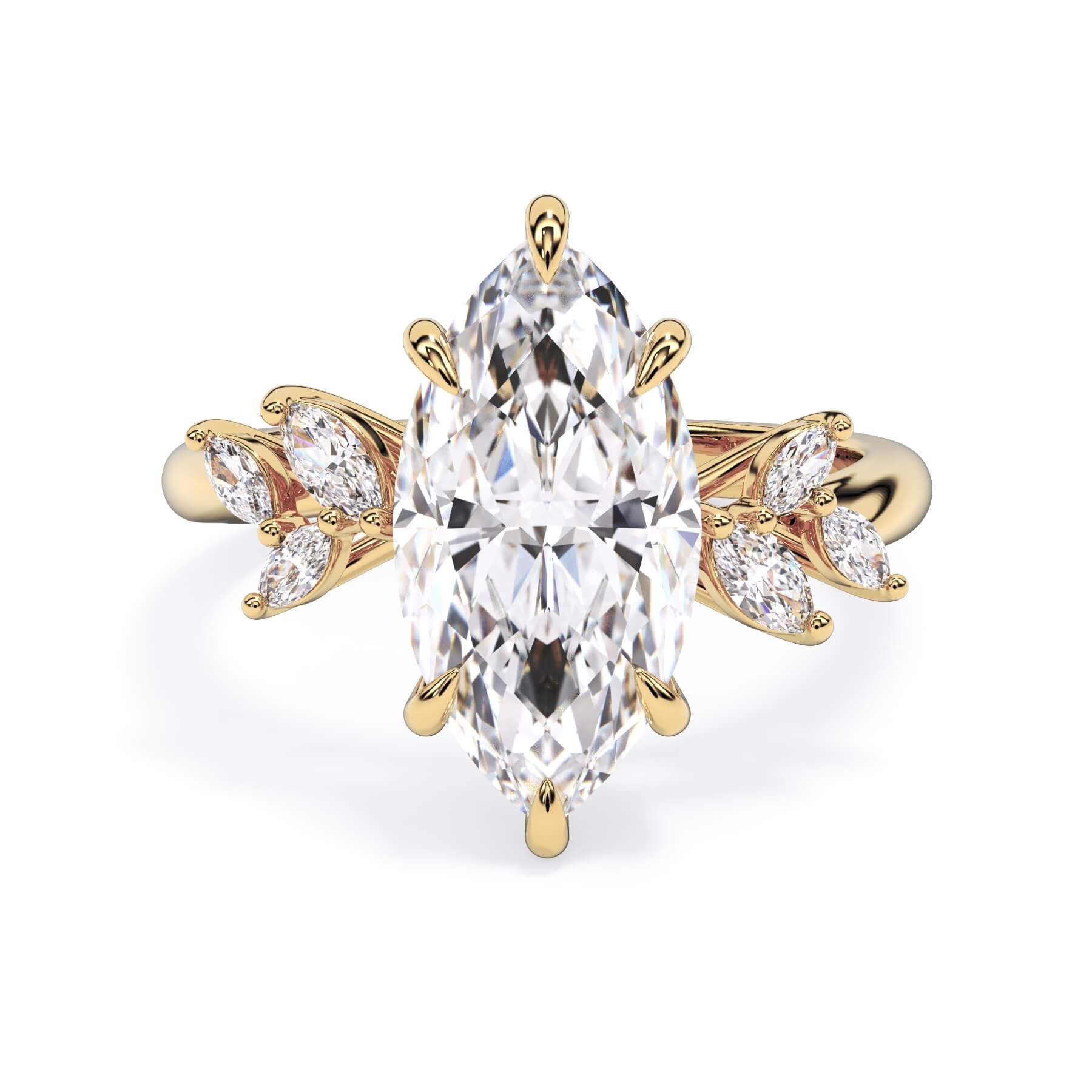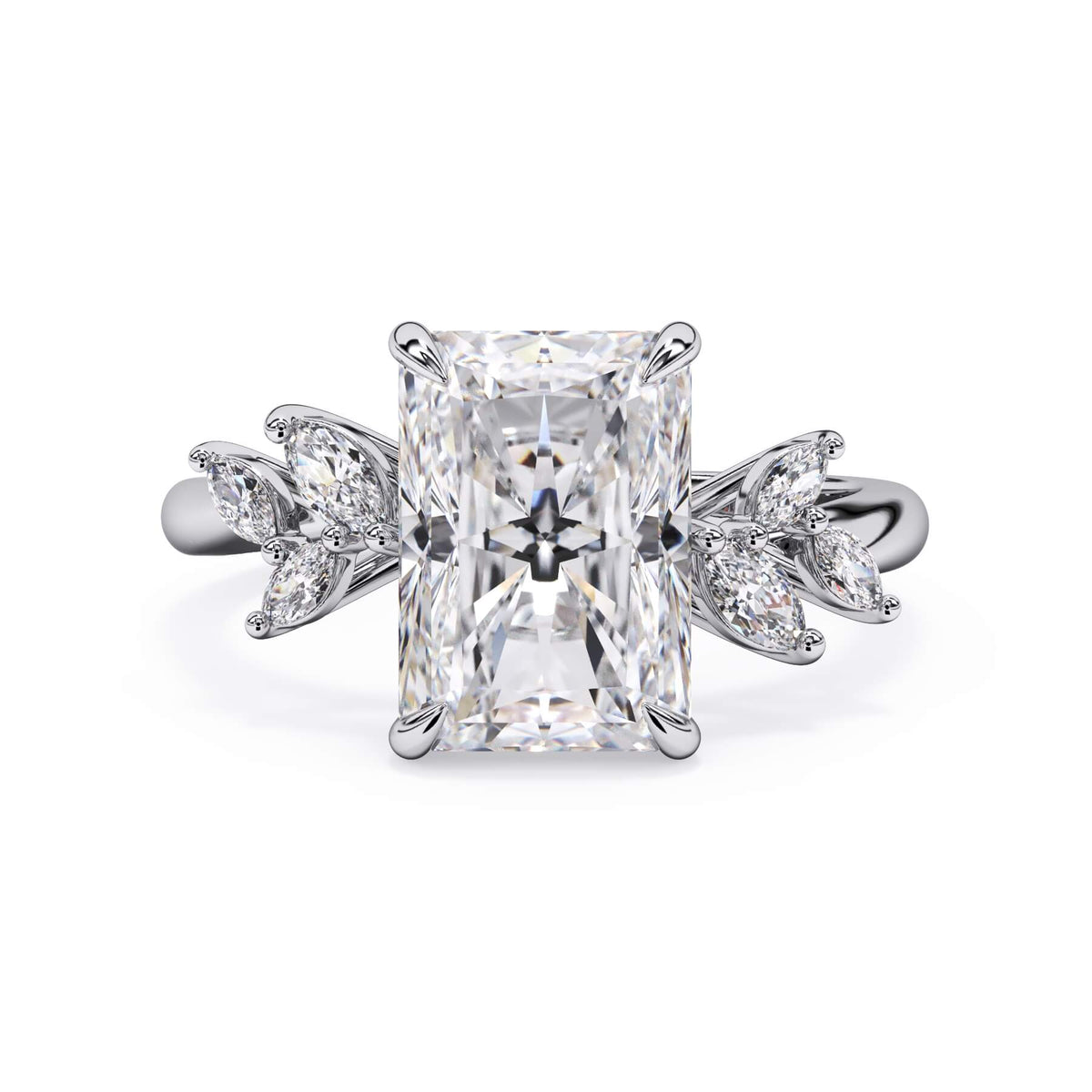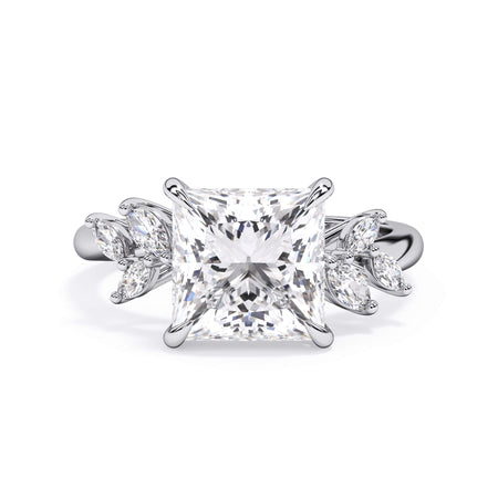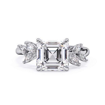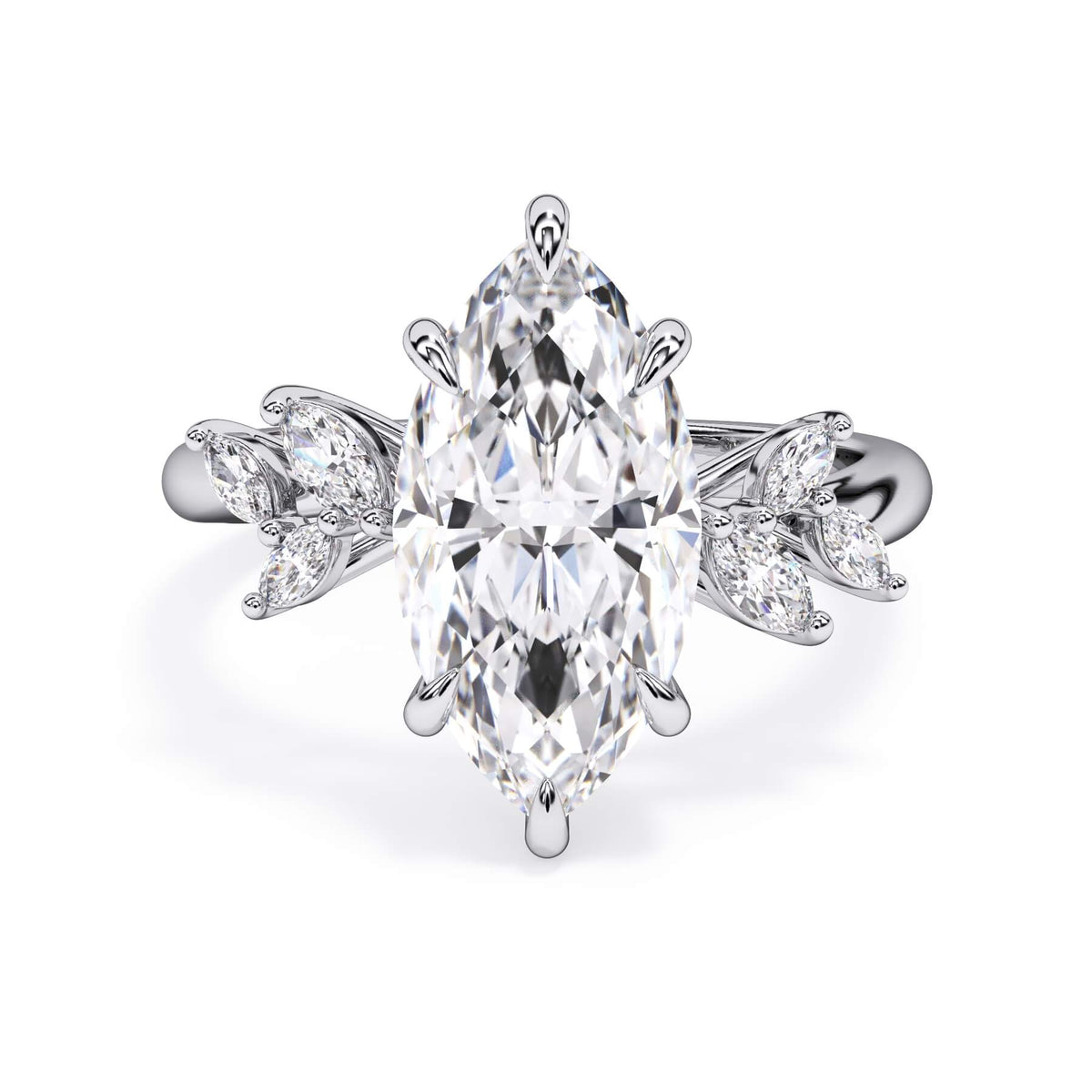An offset shank serves as the "vine" for this organic styled, flower inspired engagement ring with six "leaves" set with marquise diamonds.