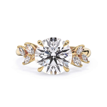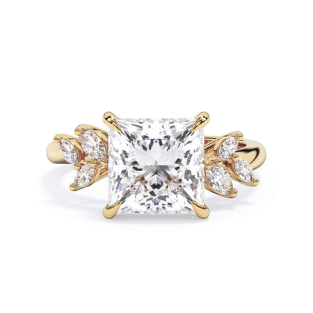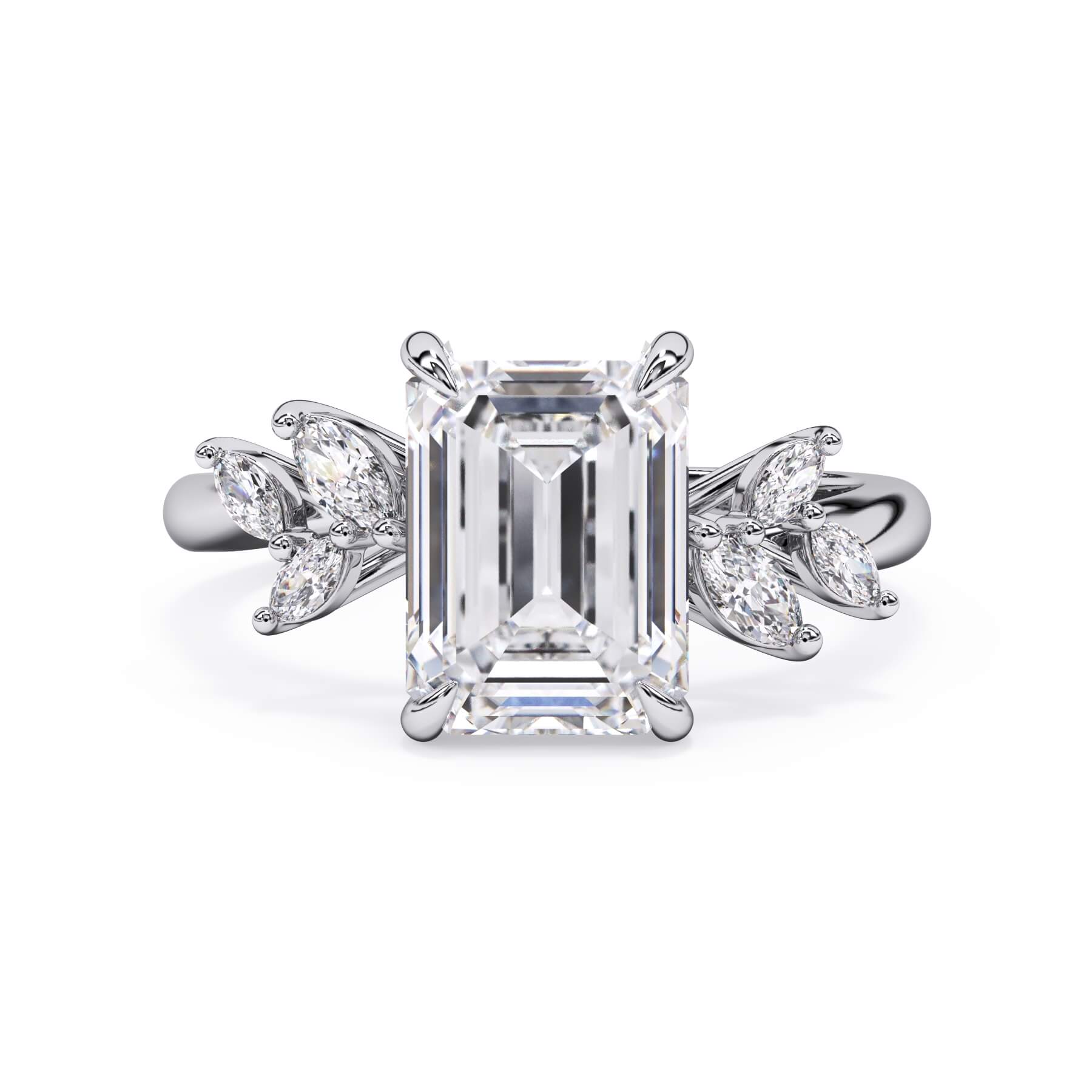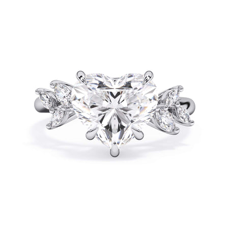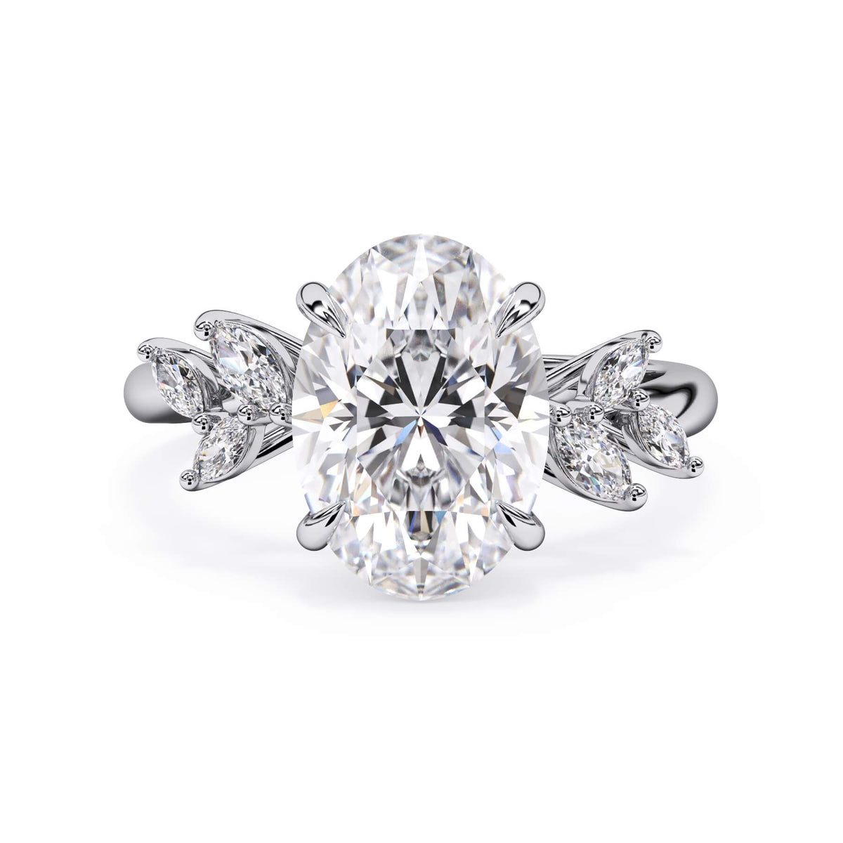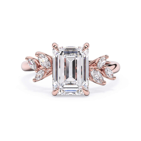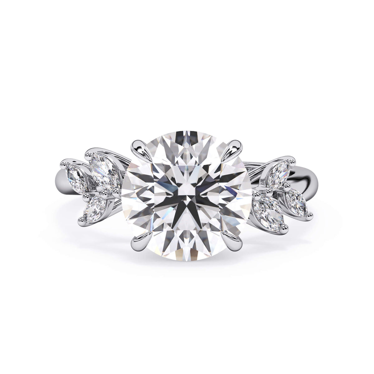 An offset shank serves as the "vine" for this organic styled, flower inspired engagement ring with six "leaves" set with marquise diamonds.