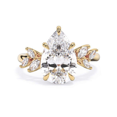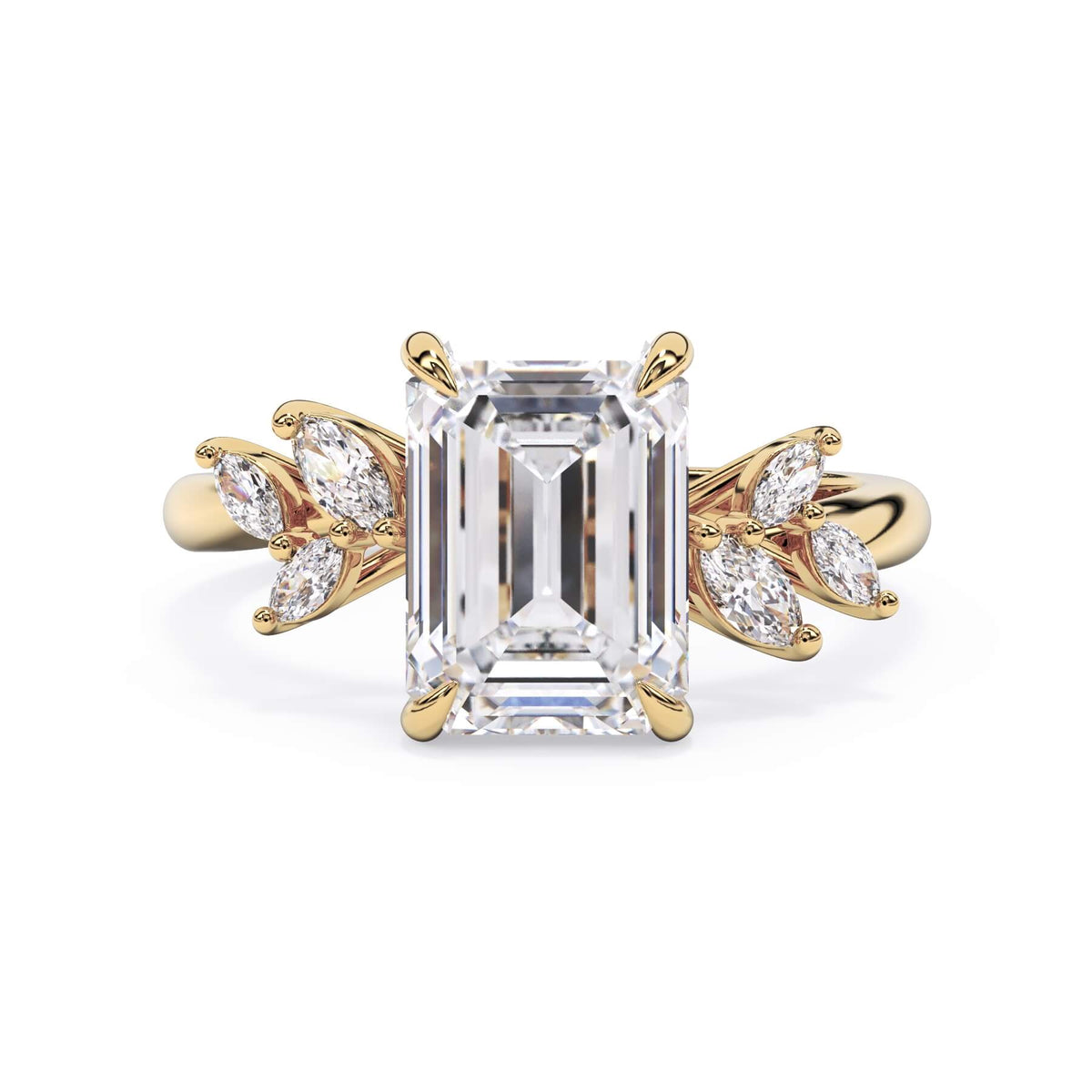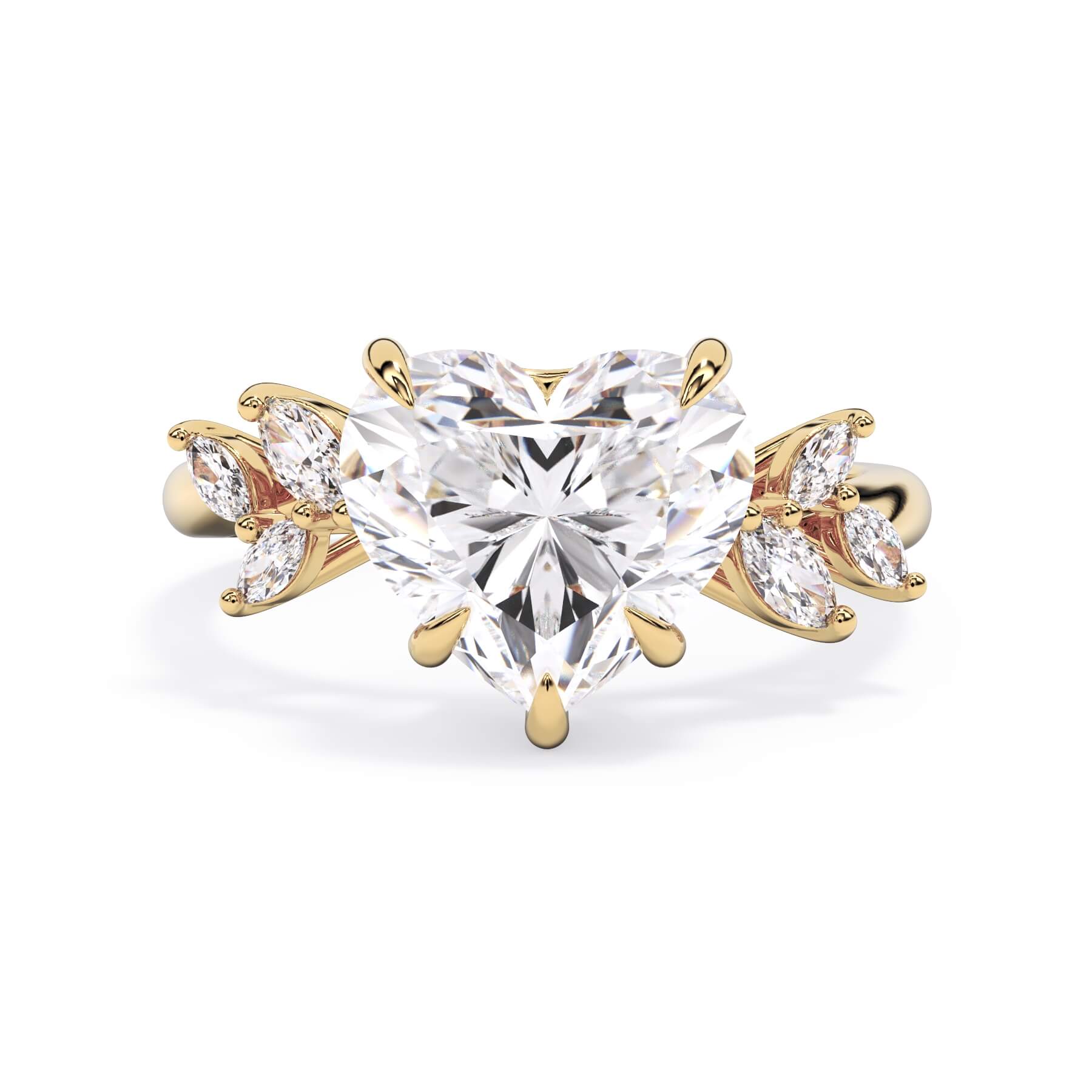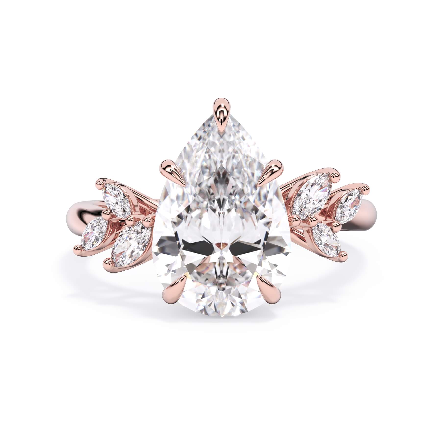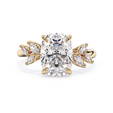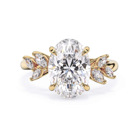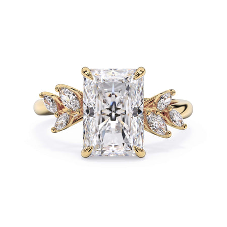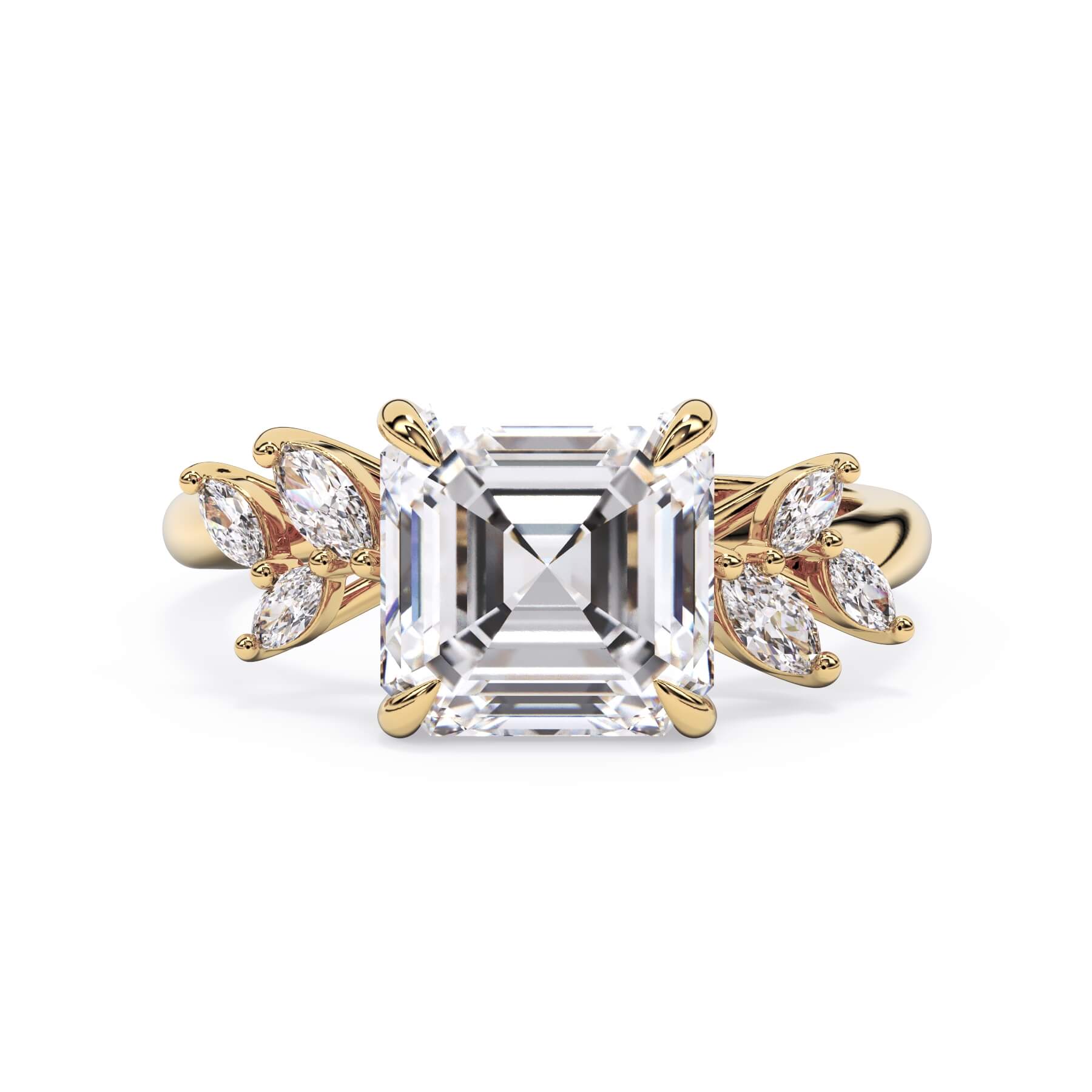An offset shank serves as the "vine" for this organic styled, flower inspired engagement ring with six "leaves" set with marquise diamonds.