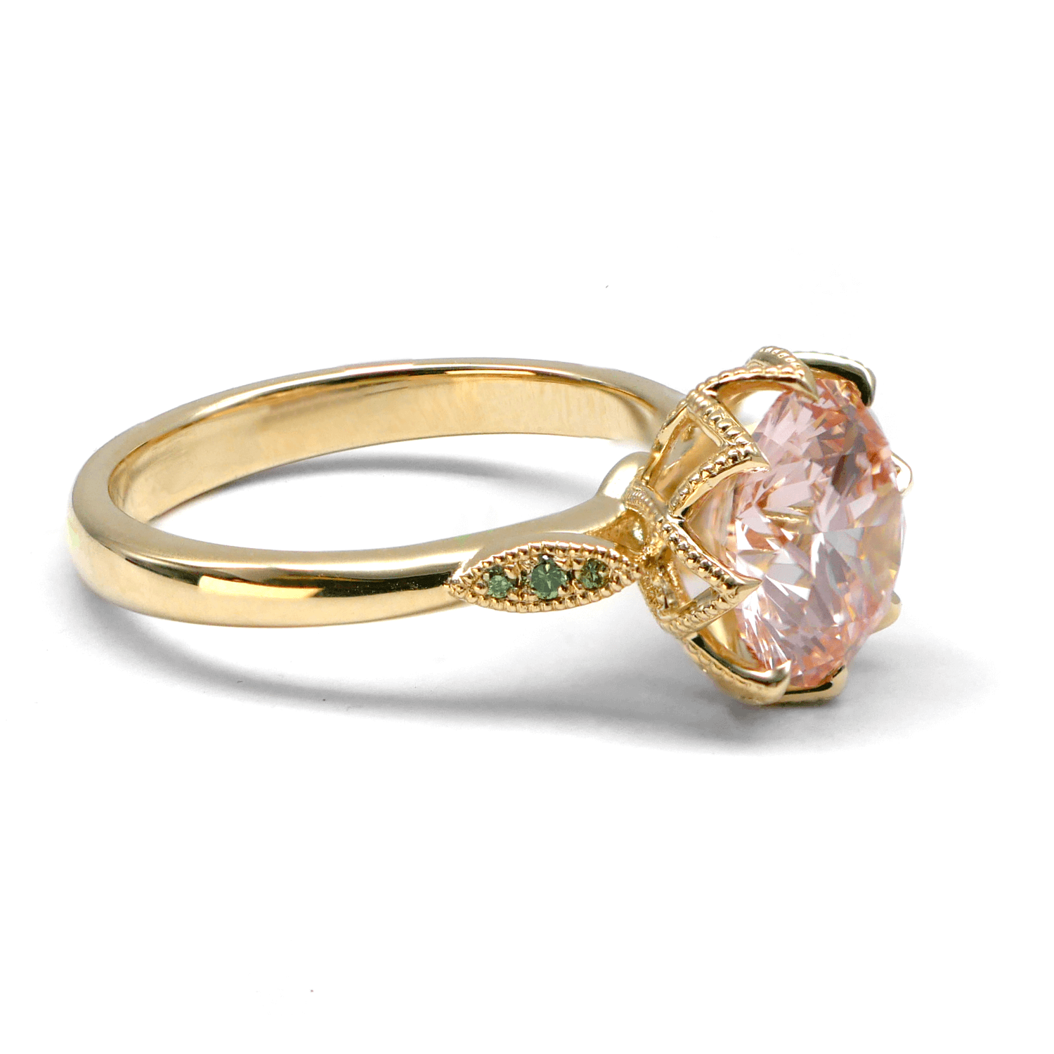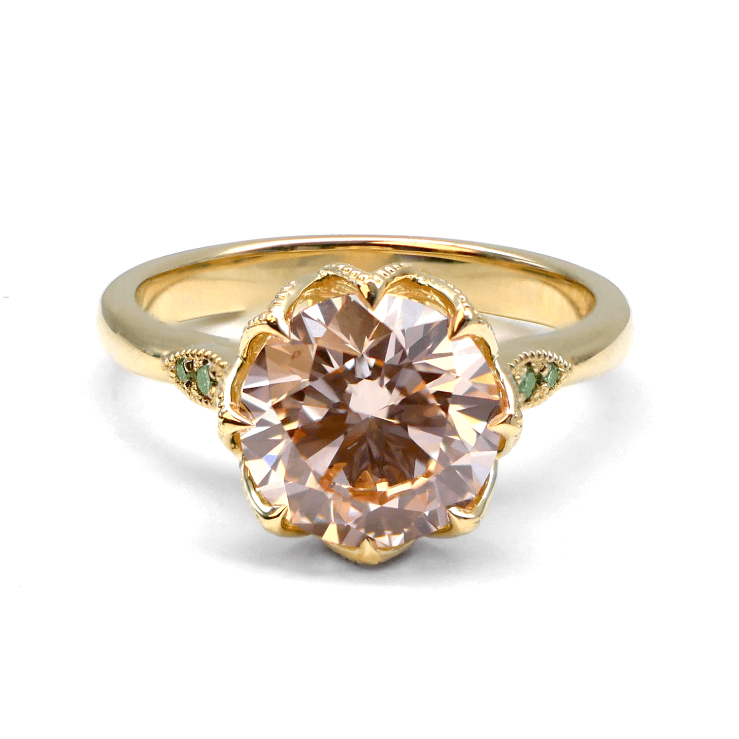 Highlighted by a beautiful approximate 2.25ct Fancy Intense Pink VS1 Ideal Cut lab grown diamond, this peony engagement ring is truly a one of a kind. Expertly designed, our master jeweler hand set six green lab grown diamonds and added hand engraved milgraining to complete this stunning piece. This is a fun, colorful and sparkling diamond peony ring that is sure to be enjoyed for generations.