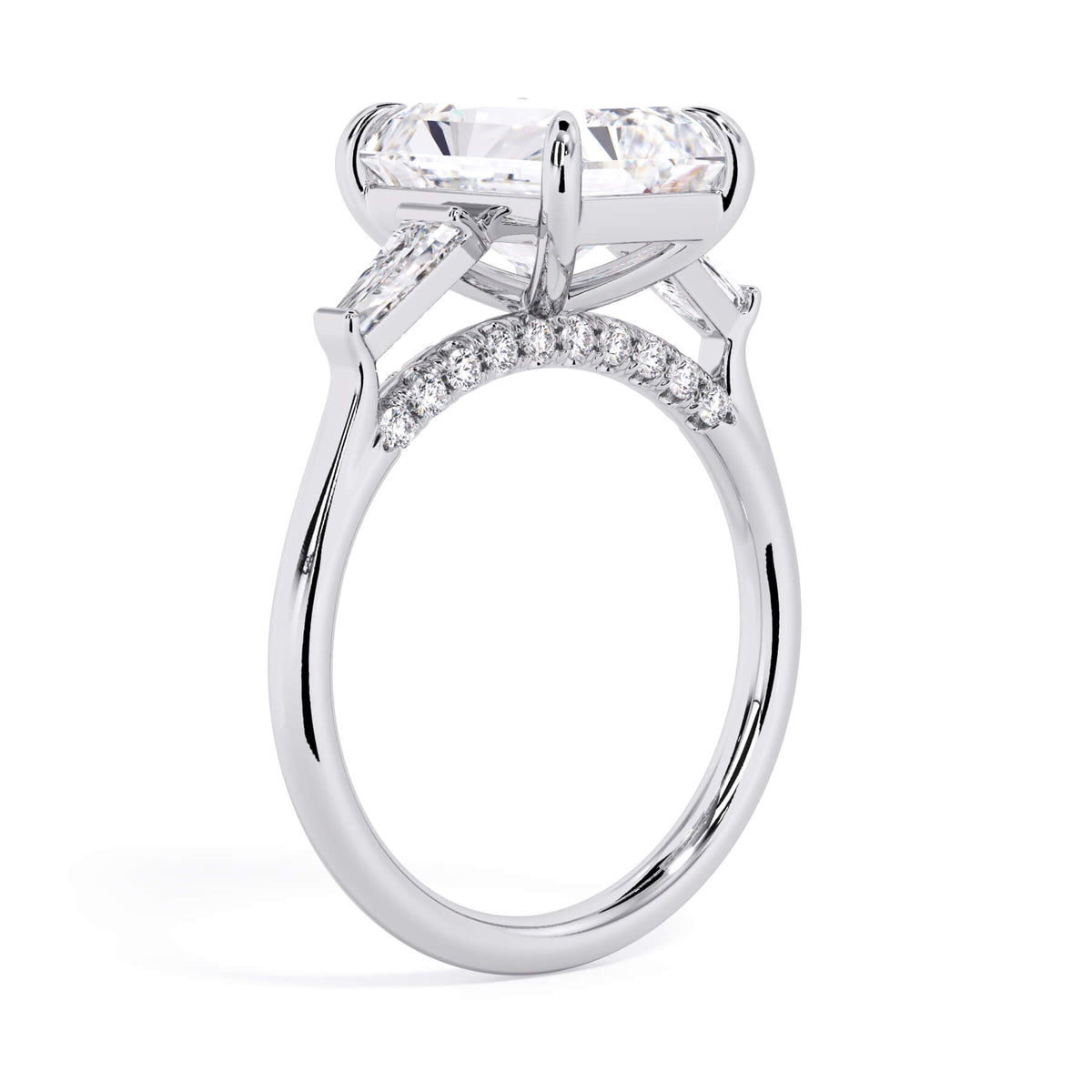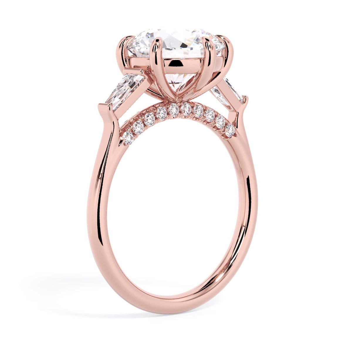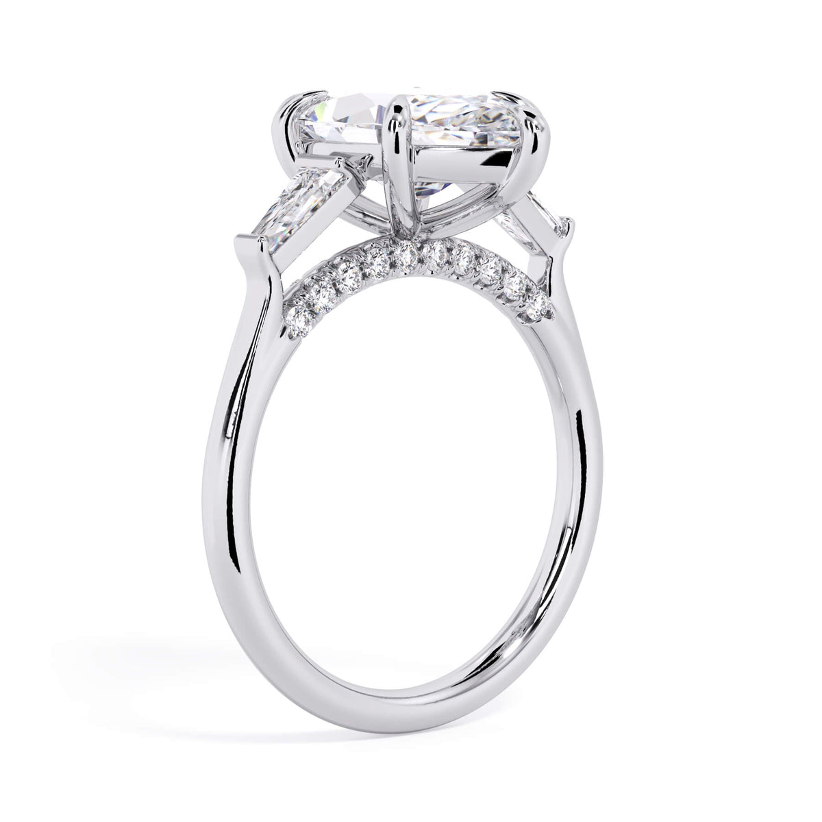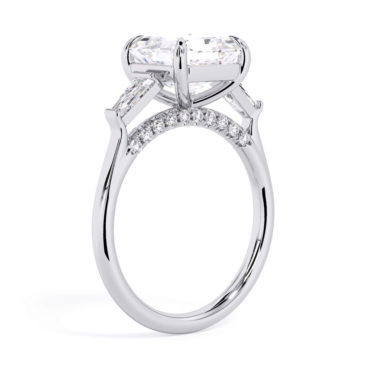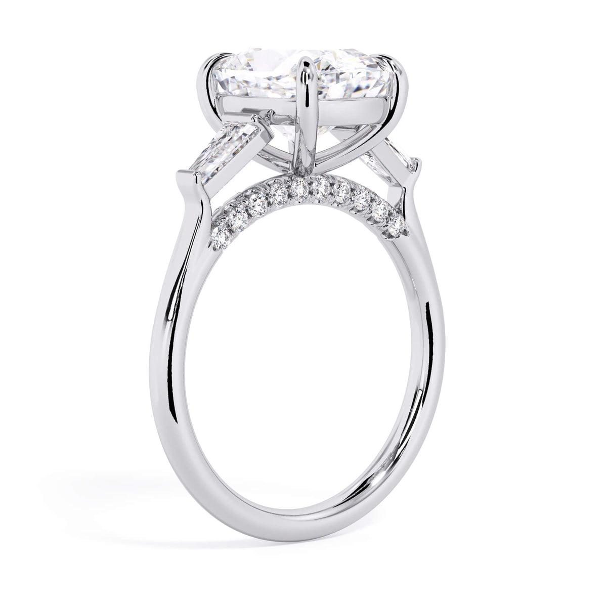 We added some extra sparkle with the 20 diamonds nestled on the shank below this traditional three stone engagement ring setting. Your chosen center stone rests beautifully between two matching baguette diamonds, and the diamonds on the shank give sparkle at every angle.