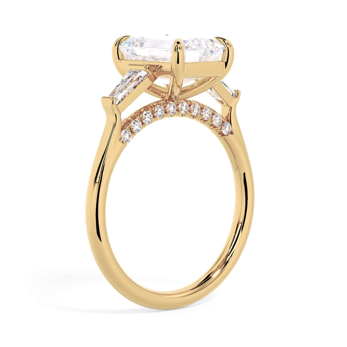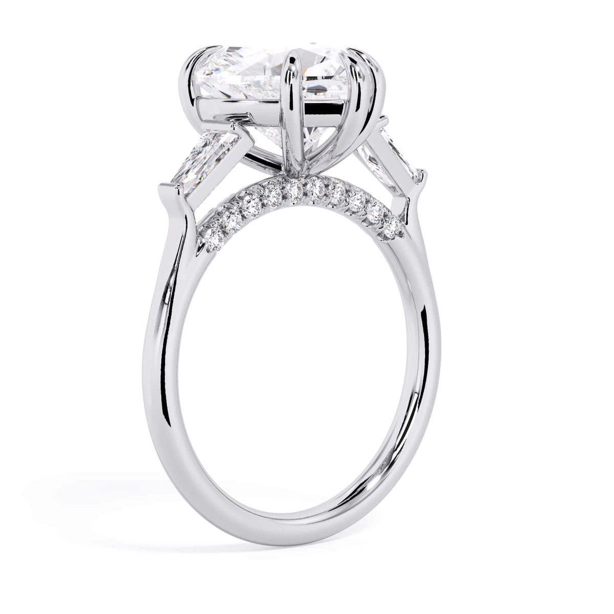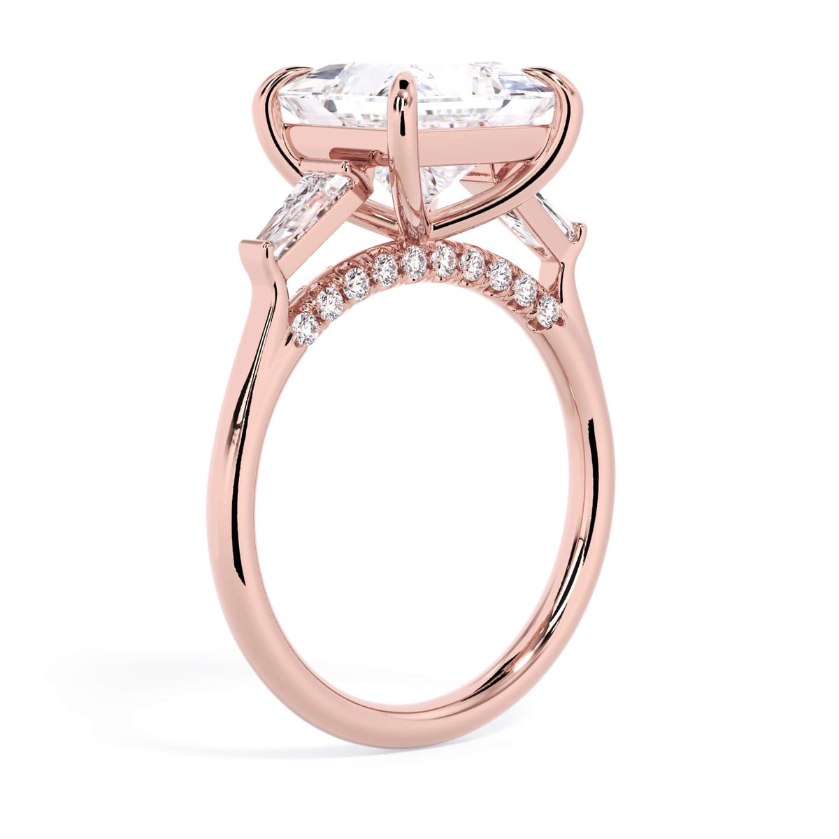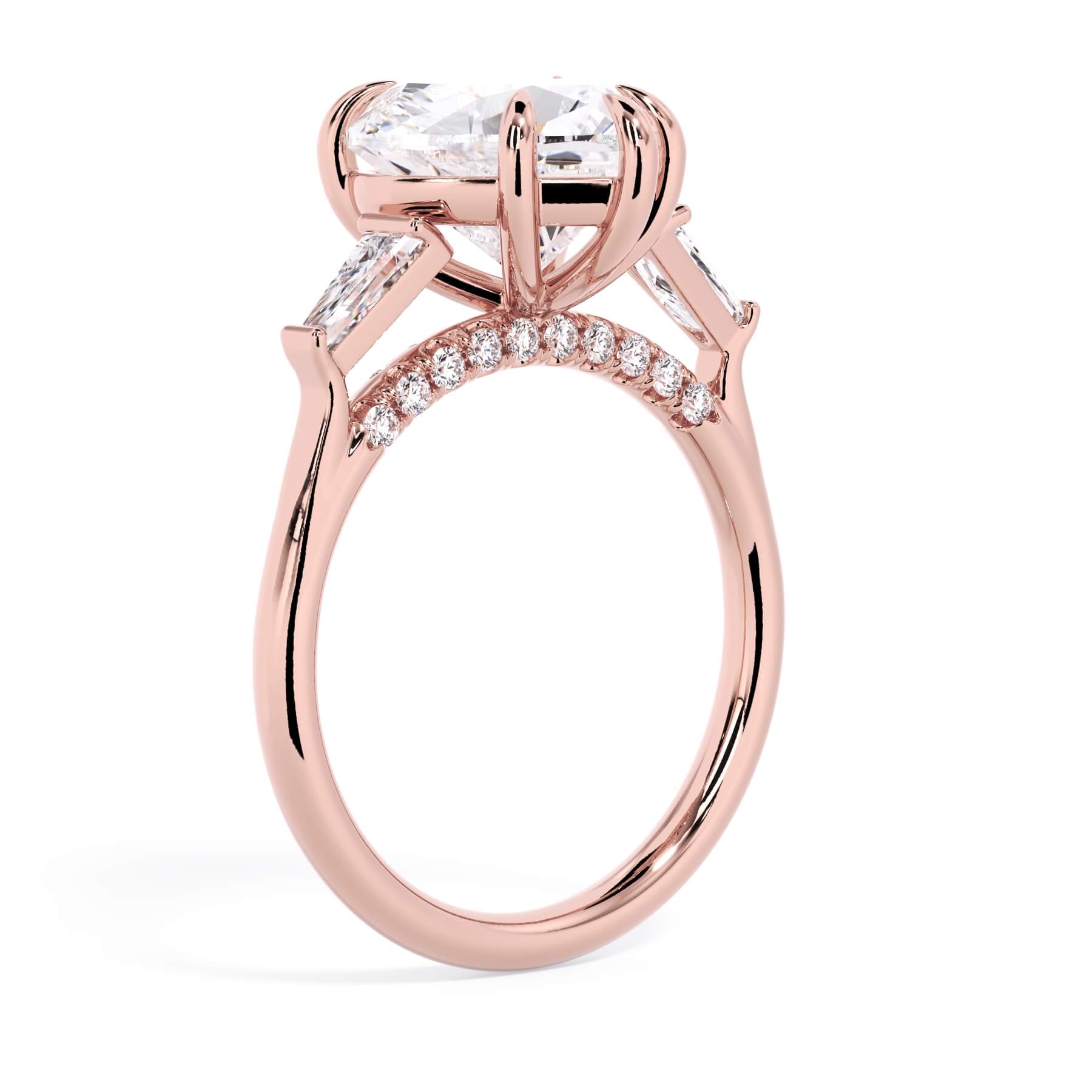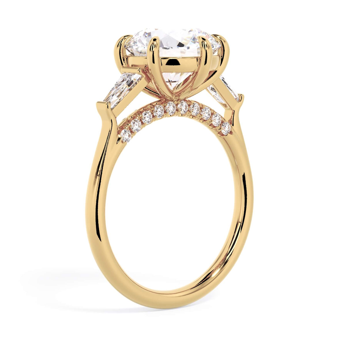 We added some extra sparkle with the 20 diamonds nestled on the shank below this traditional three stone engagement ring setting. Your chosen center stone rests beautifully between two matching baguette diamonds, and the diamonds on the shank give sparkle at every angle.