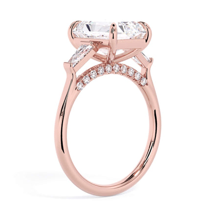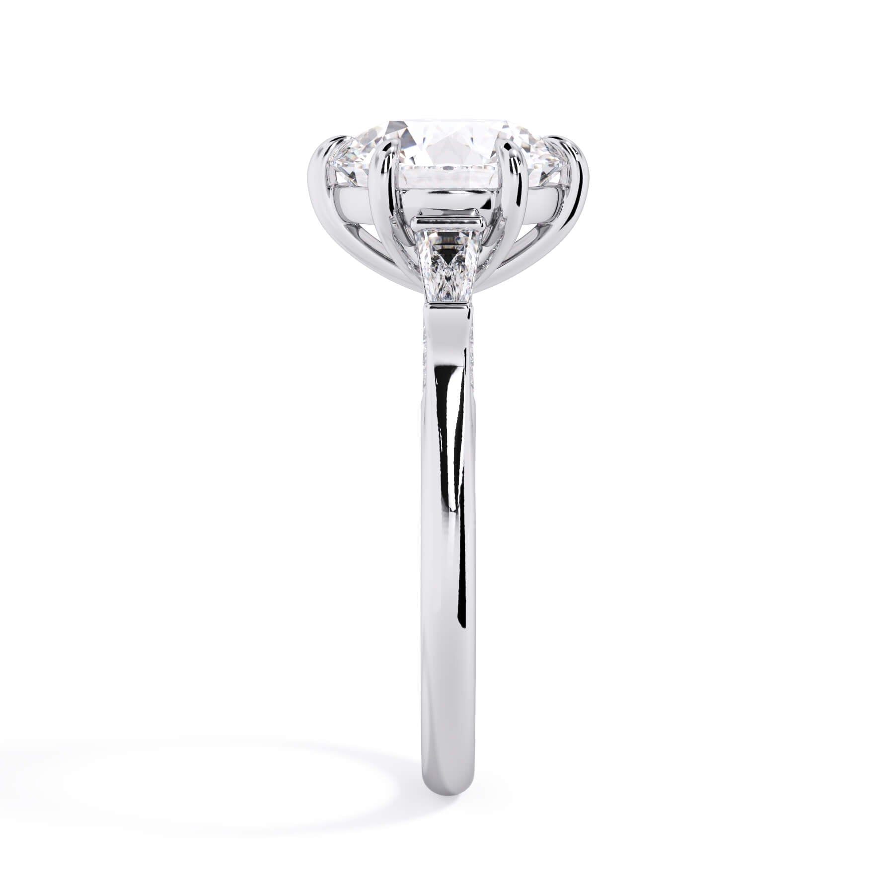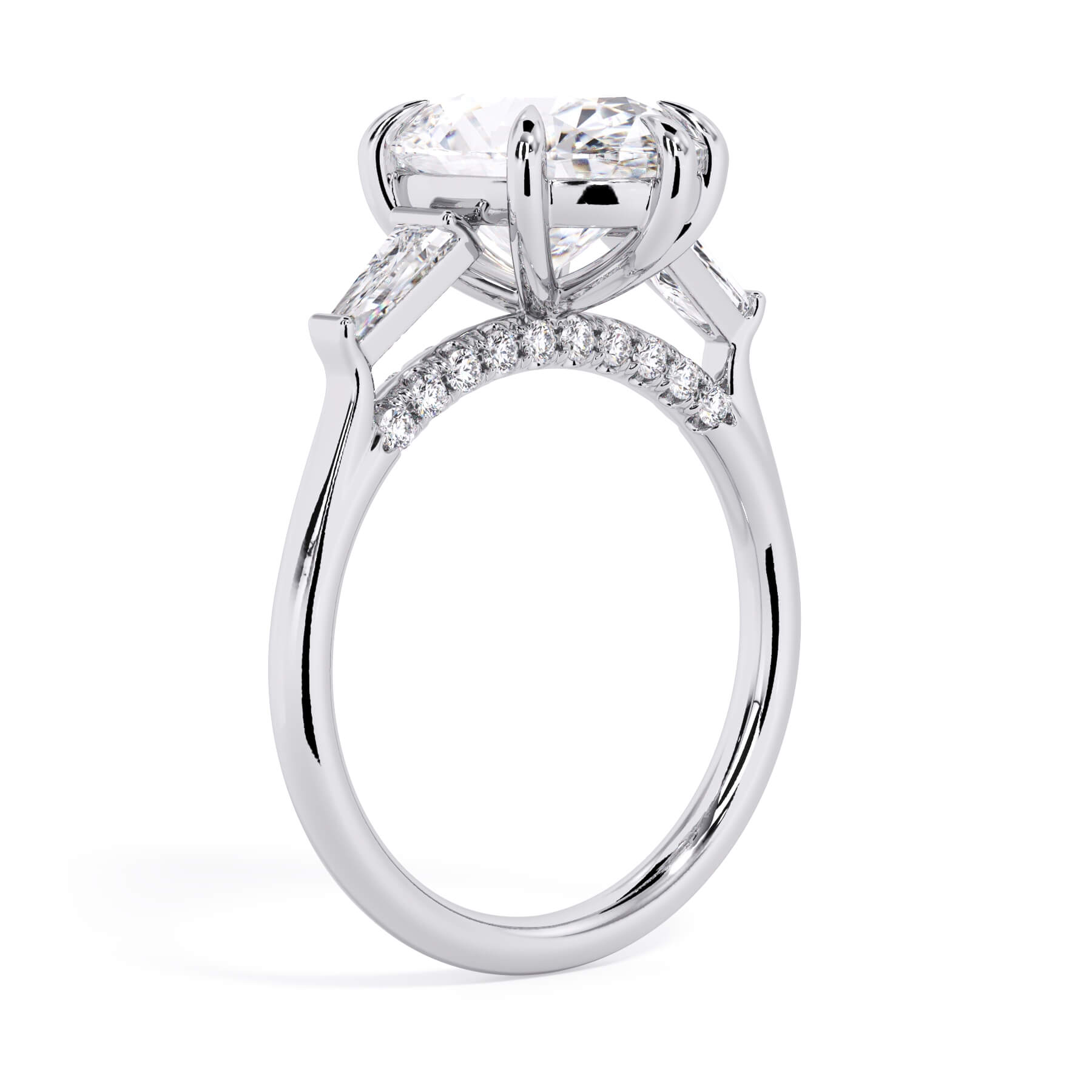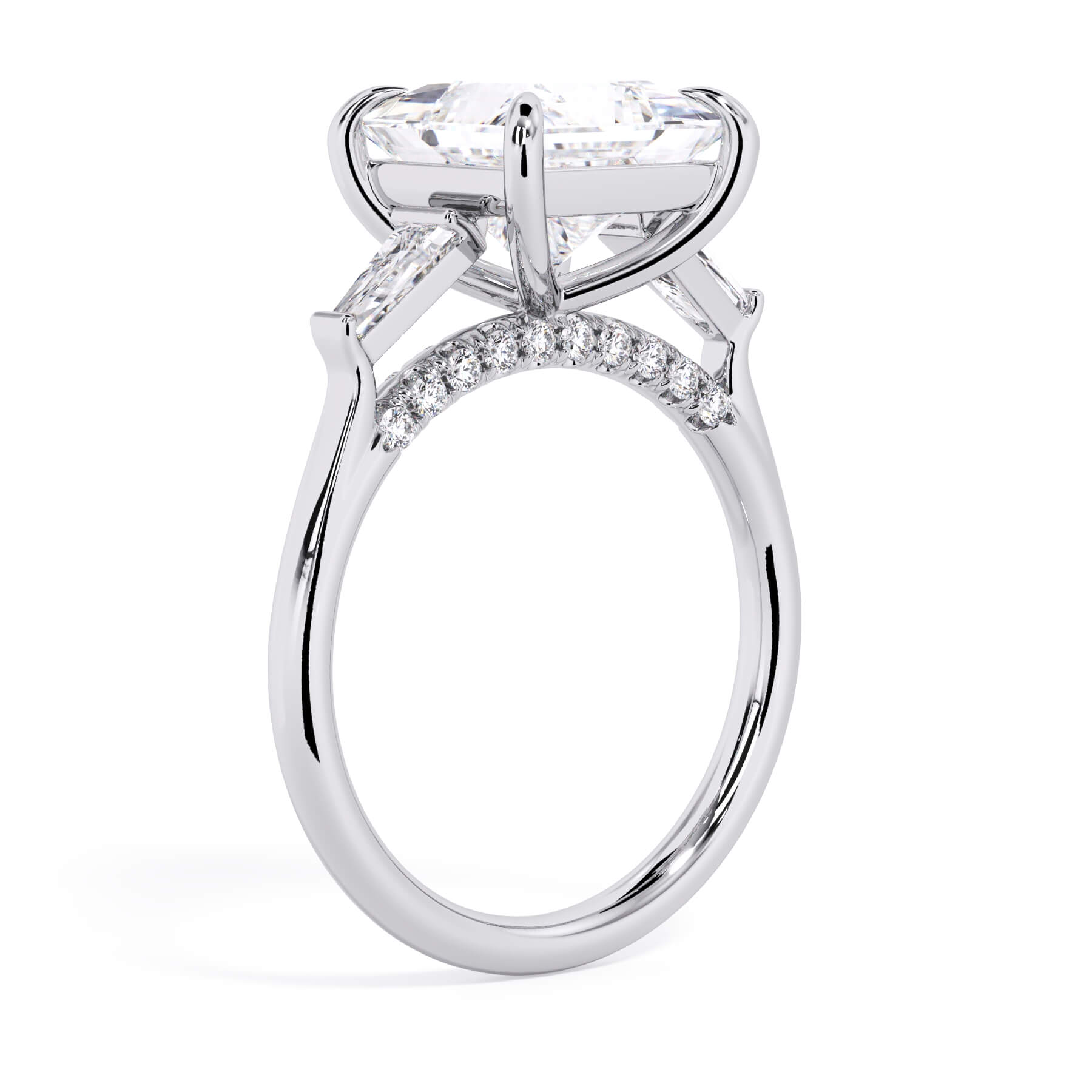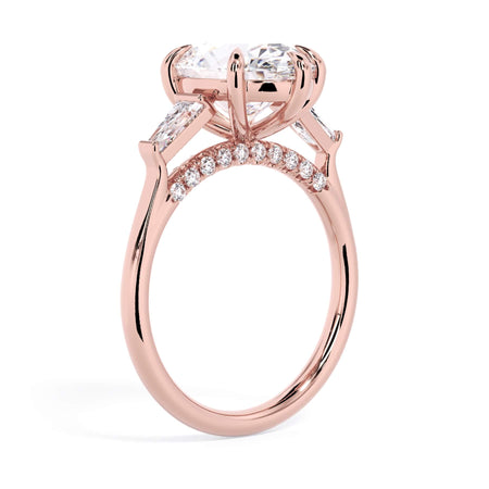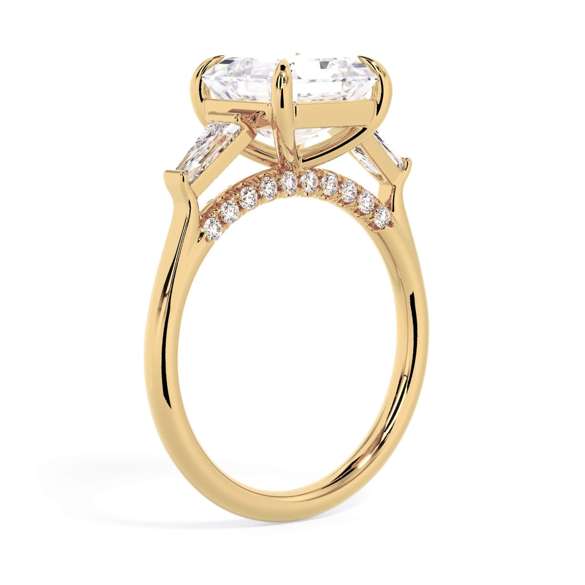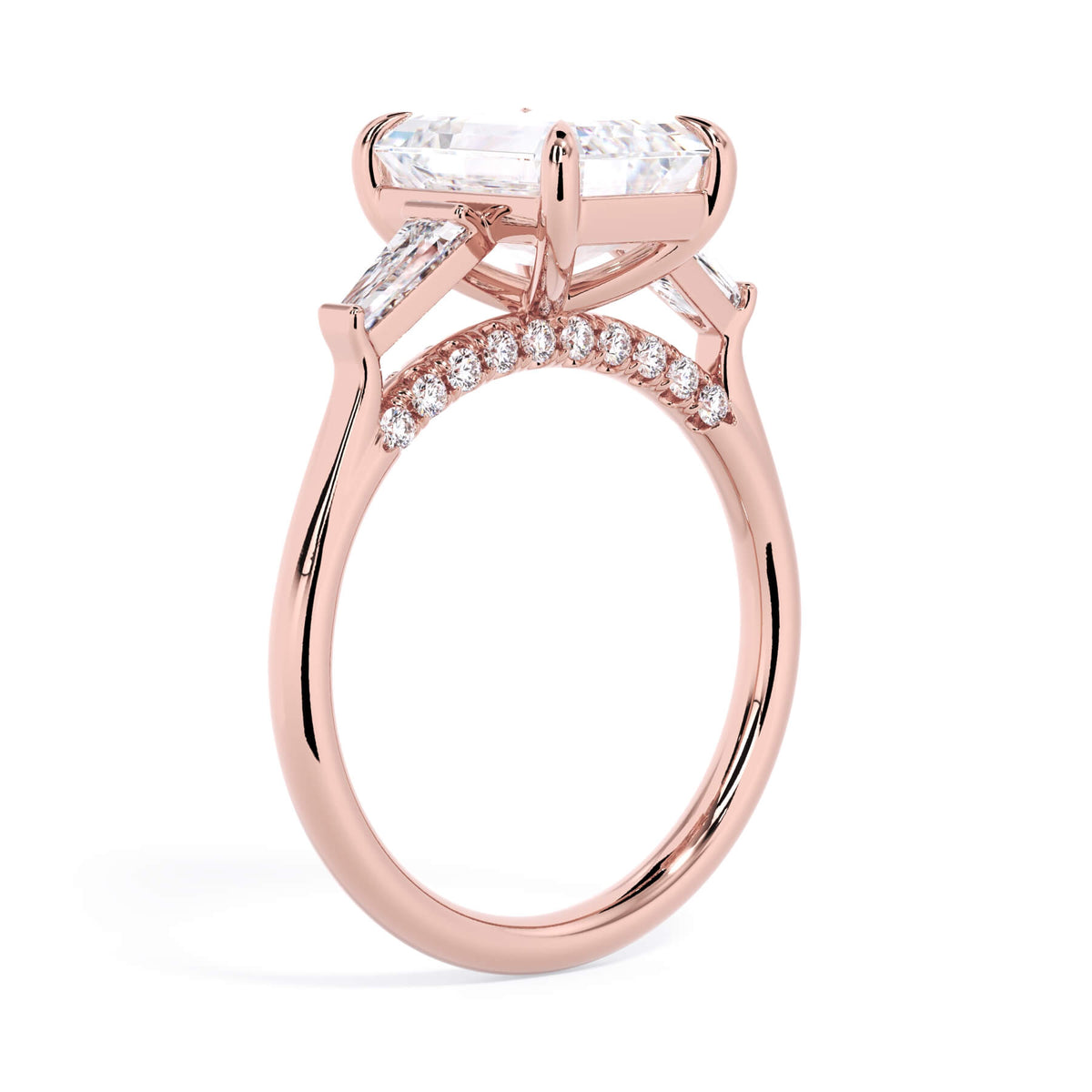 We added some extra sparkle with the 20 diamonds nestled on the shank below this traditional three stone engagement ring setting. Your chosen center stone rests beautifully between two matching baguette diamonds, and the diamonds on the shank give sparkle at every angle.