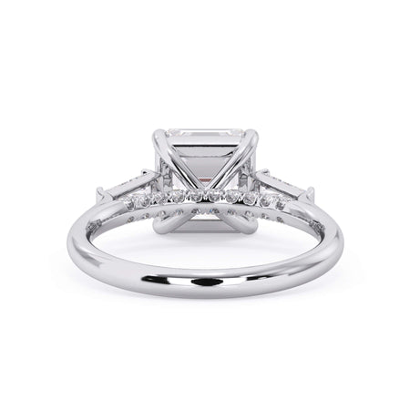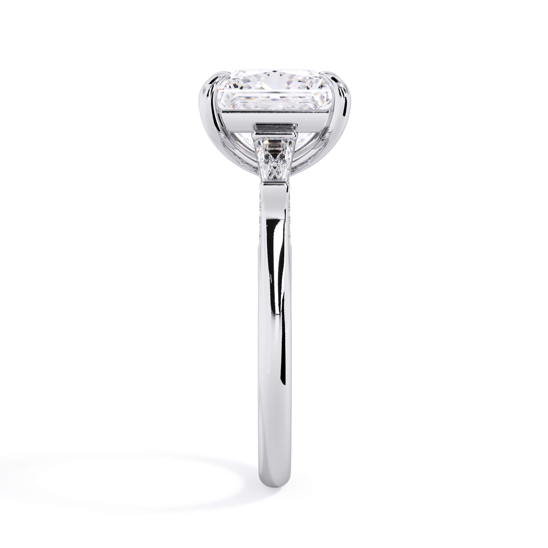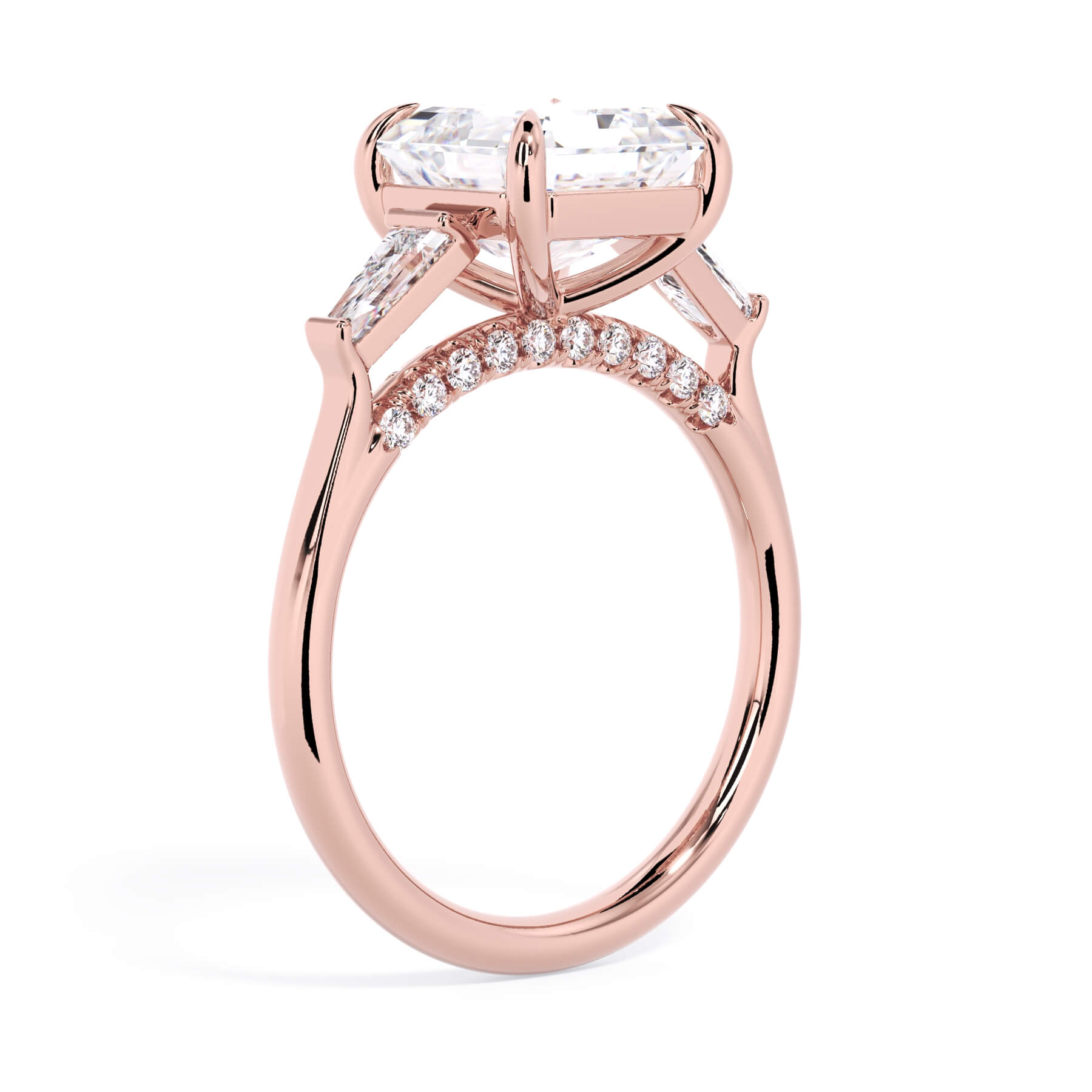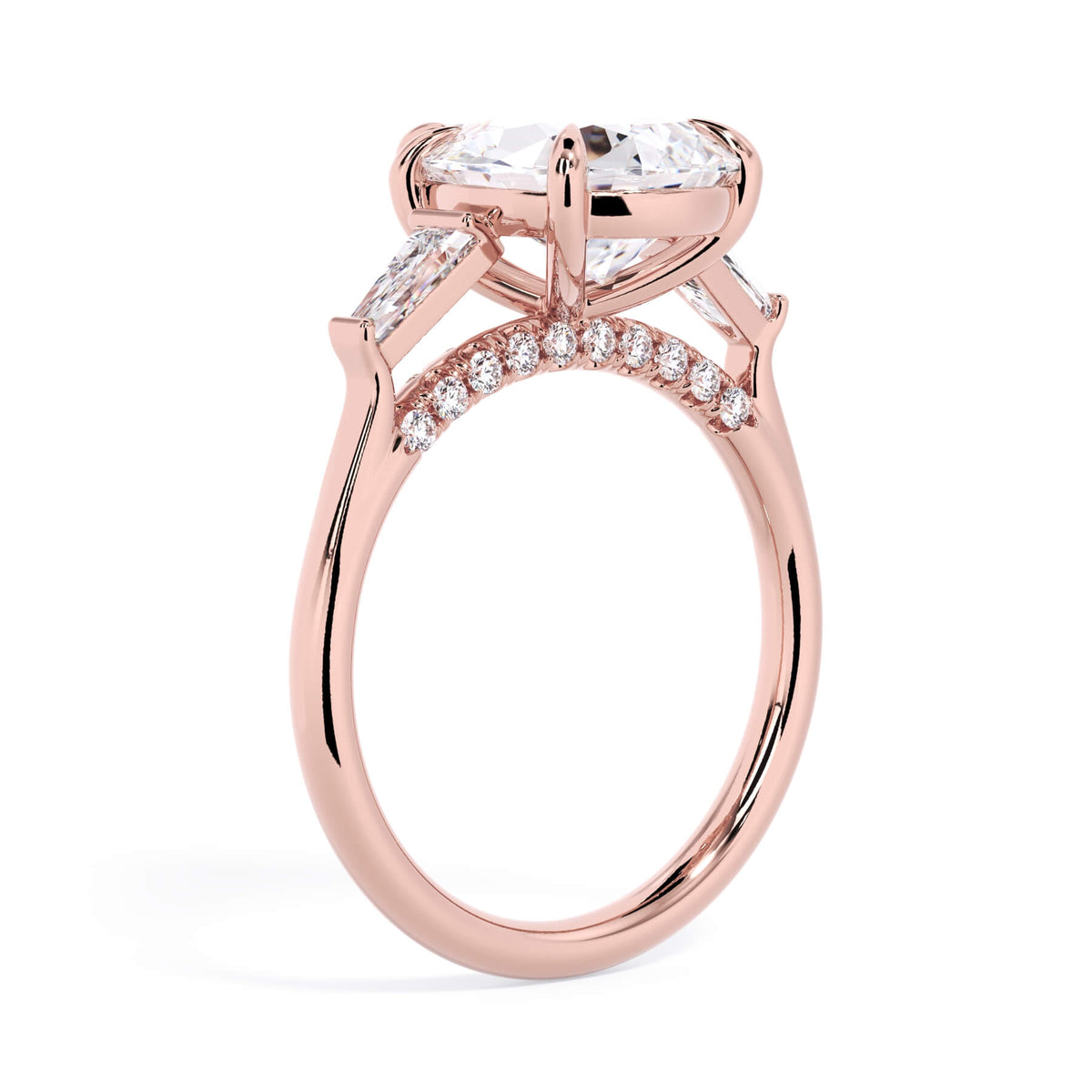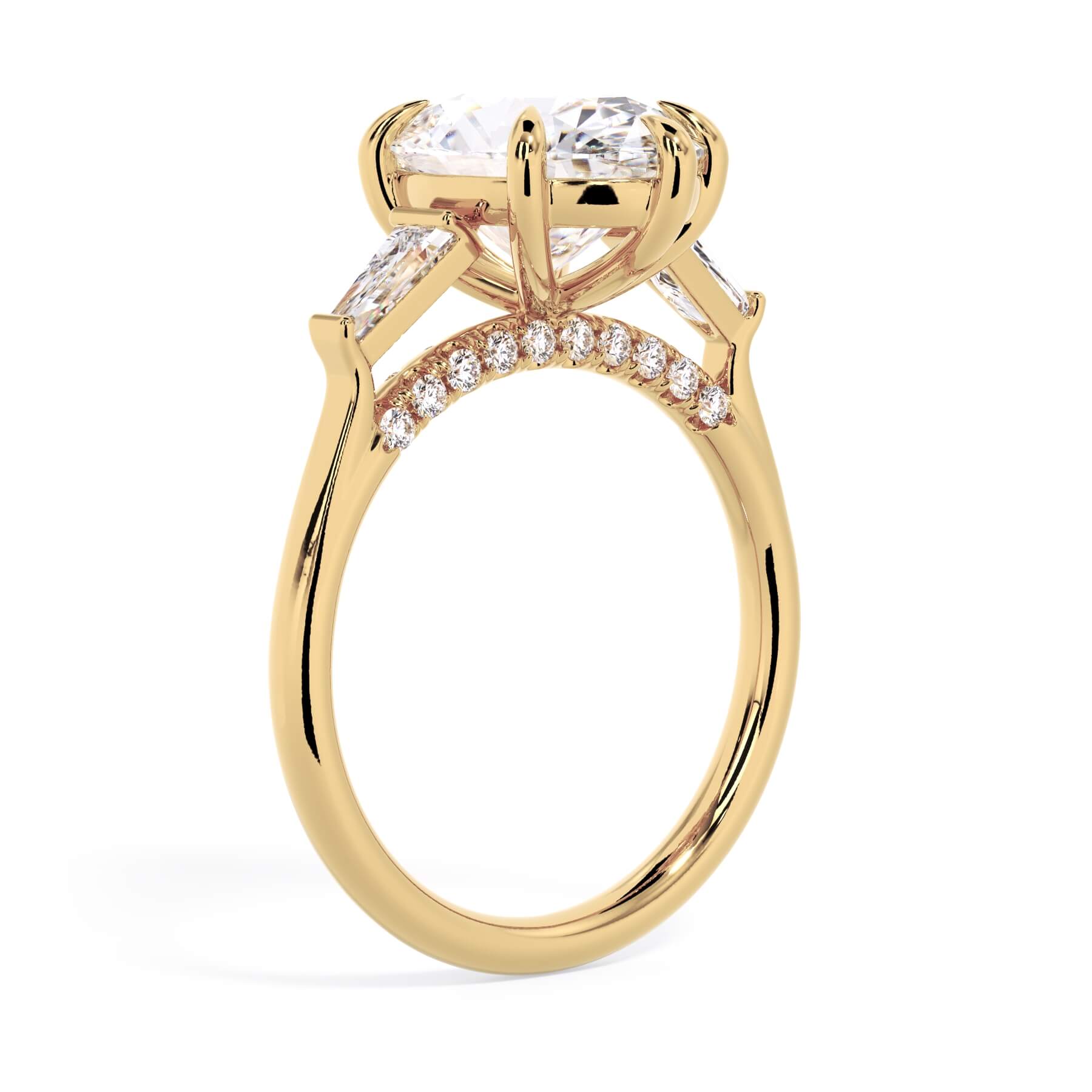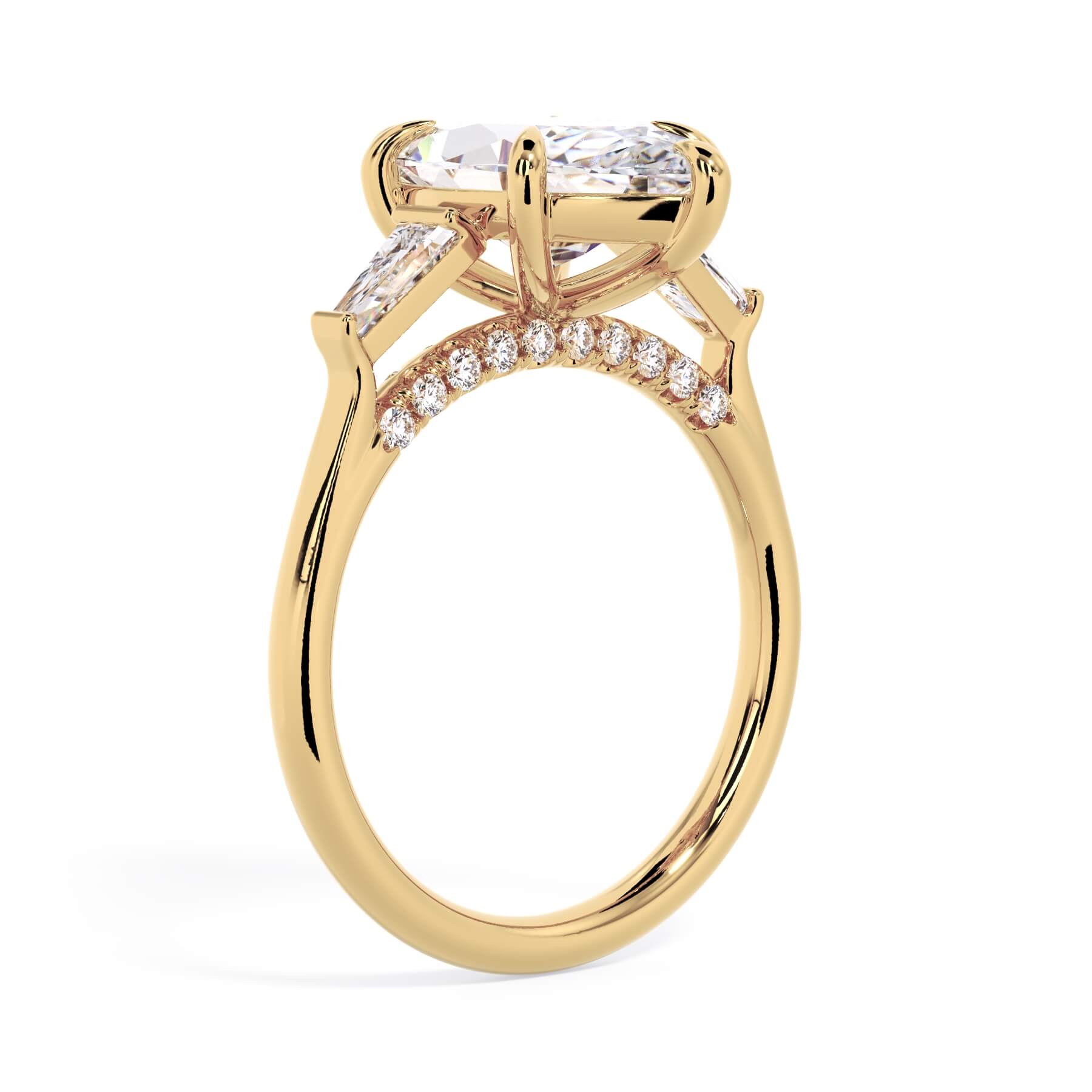 We added some extra sparkle with the 20 diamonds nestled on the shank below this traditional three stone engagement ring setting. Your chosen center stone rests beautifully between two matching baguette diamonds, and the diamonds on the shank give sparkle at every angle.