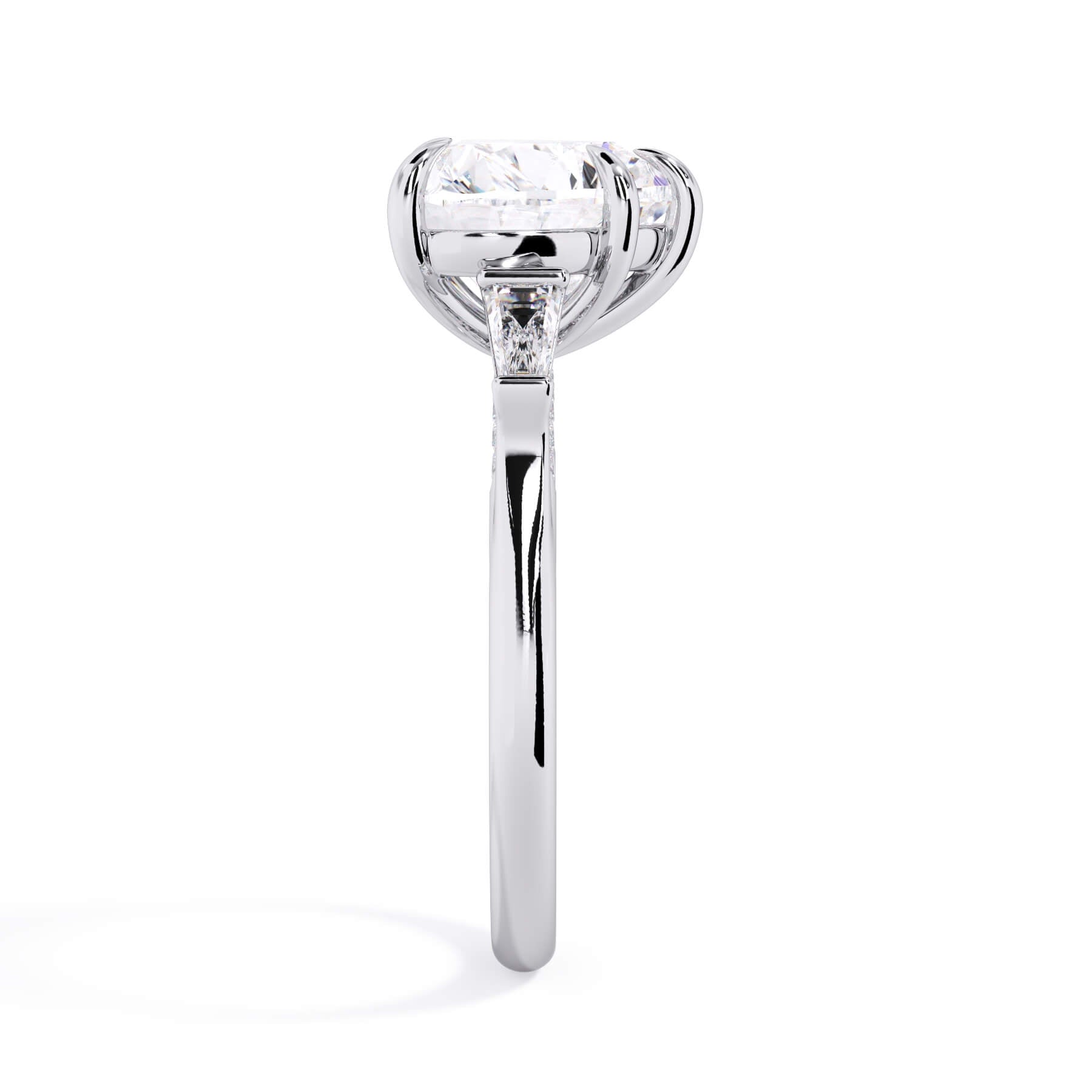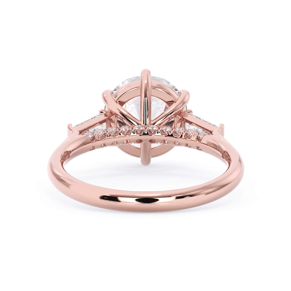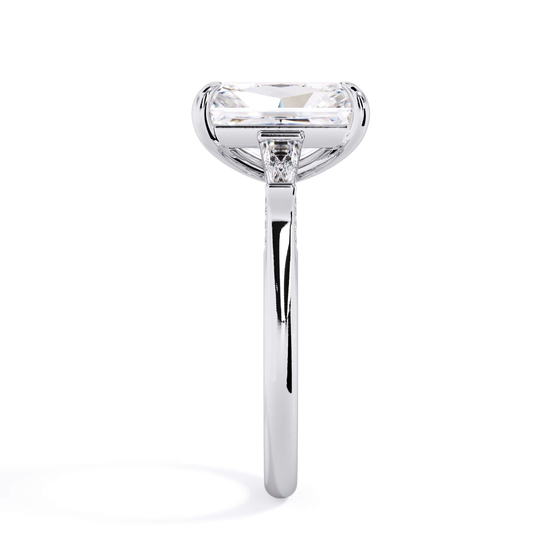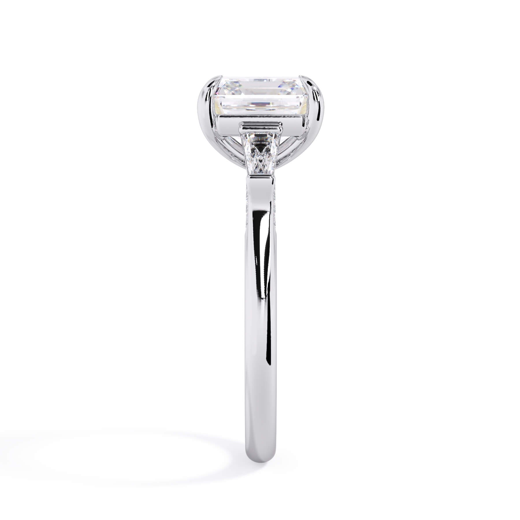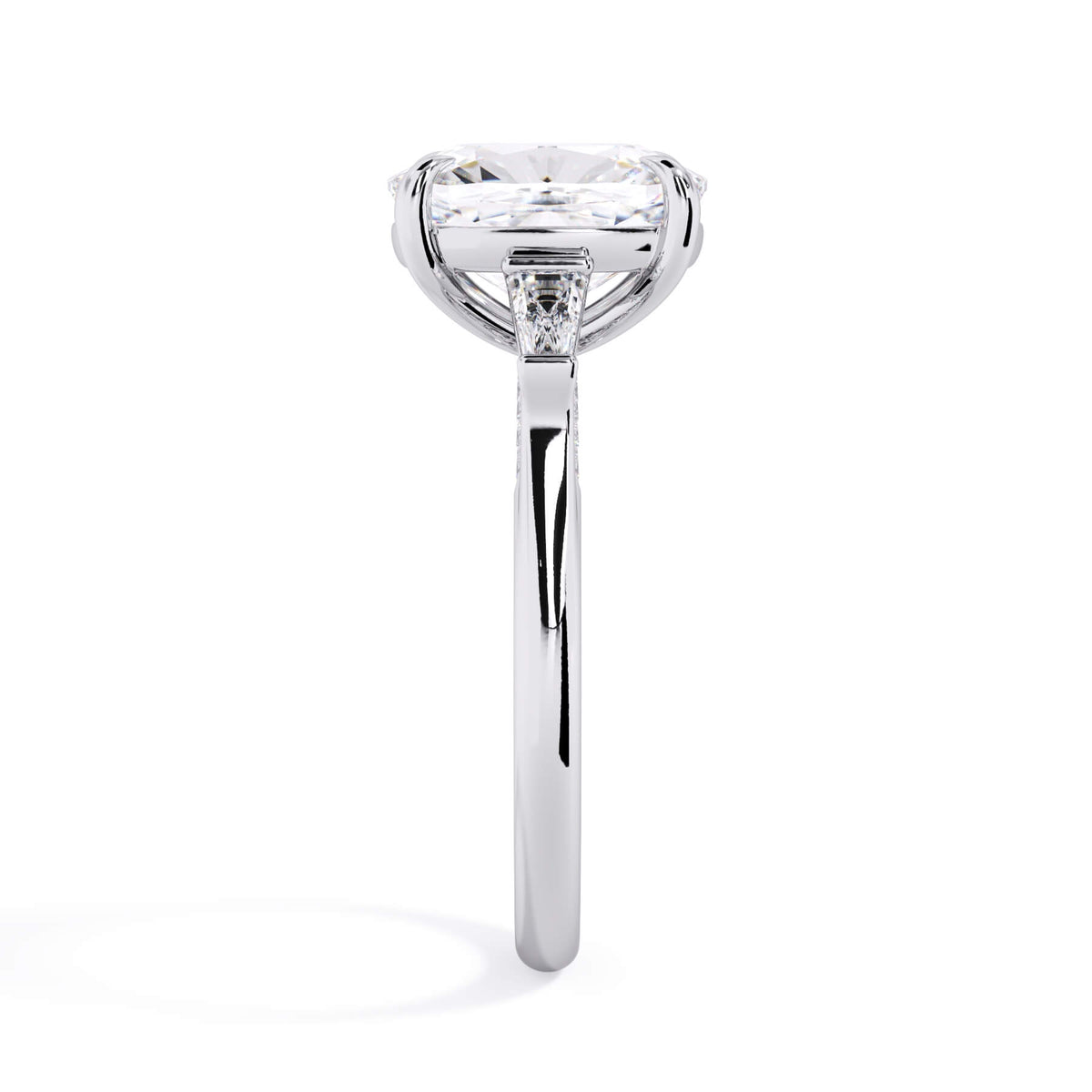 We added some extra sparkle with the 20 diamonds nestled on the shank below this traditional three stone engagement ring setting. Your chosen center stone rests beautifully between two matching baguette diamonds, and the diamonds on the shank give sparkle at every angle.