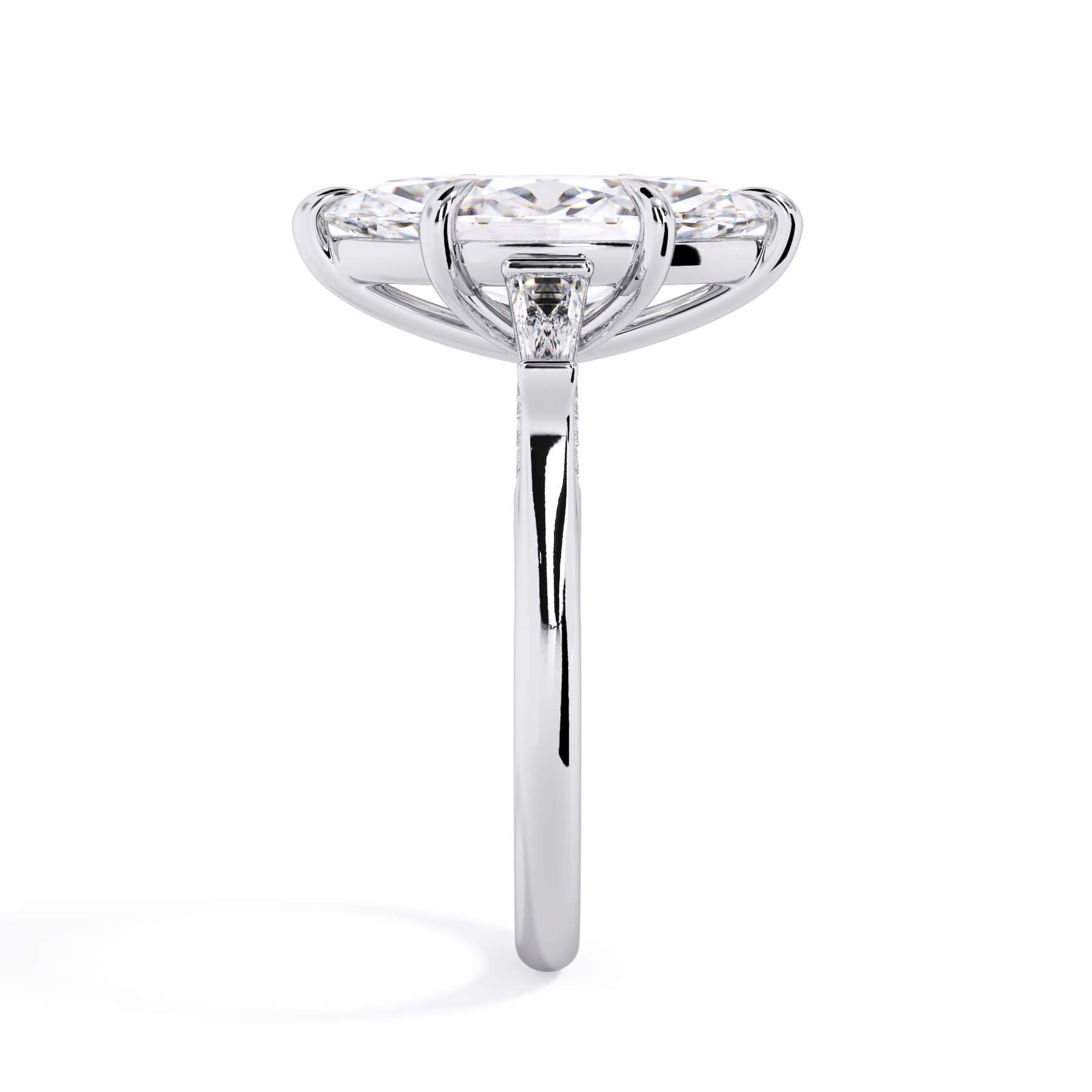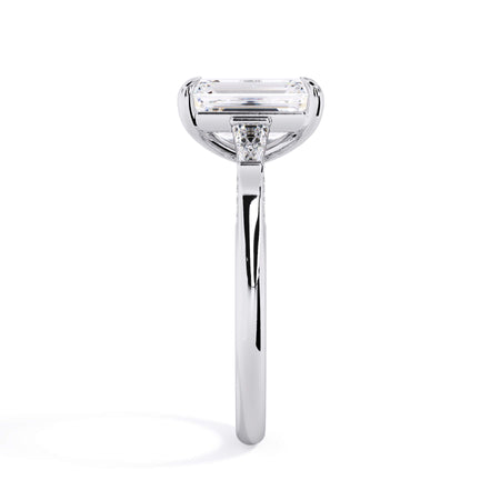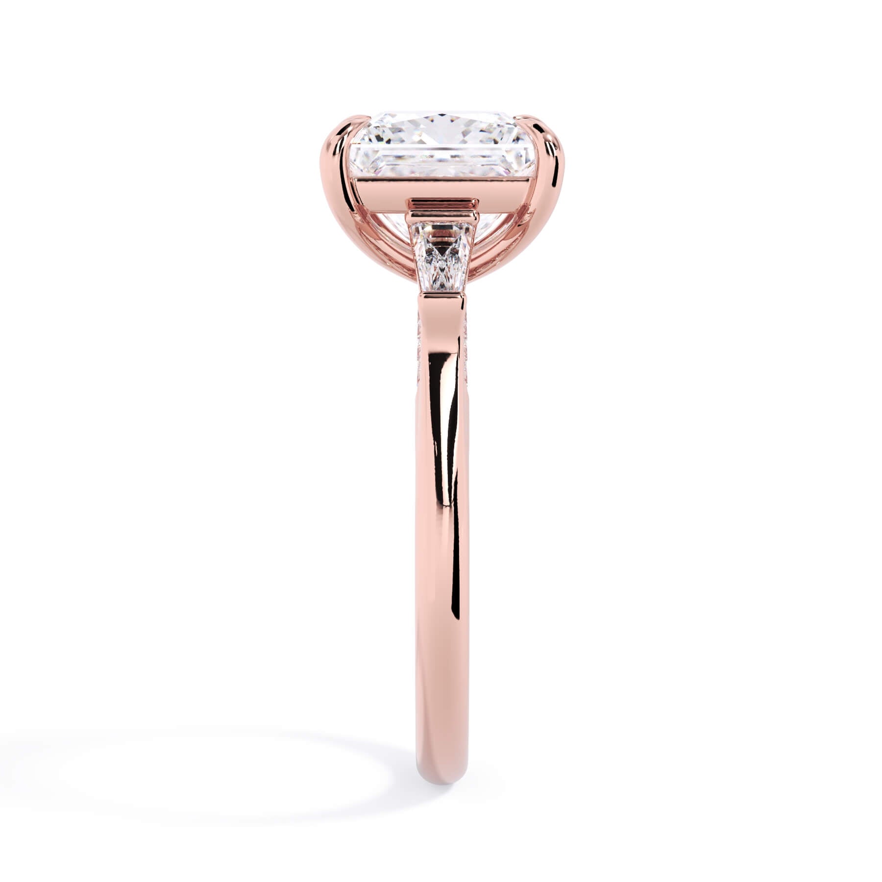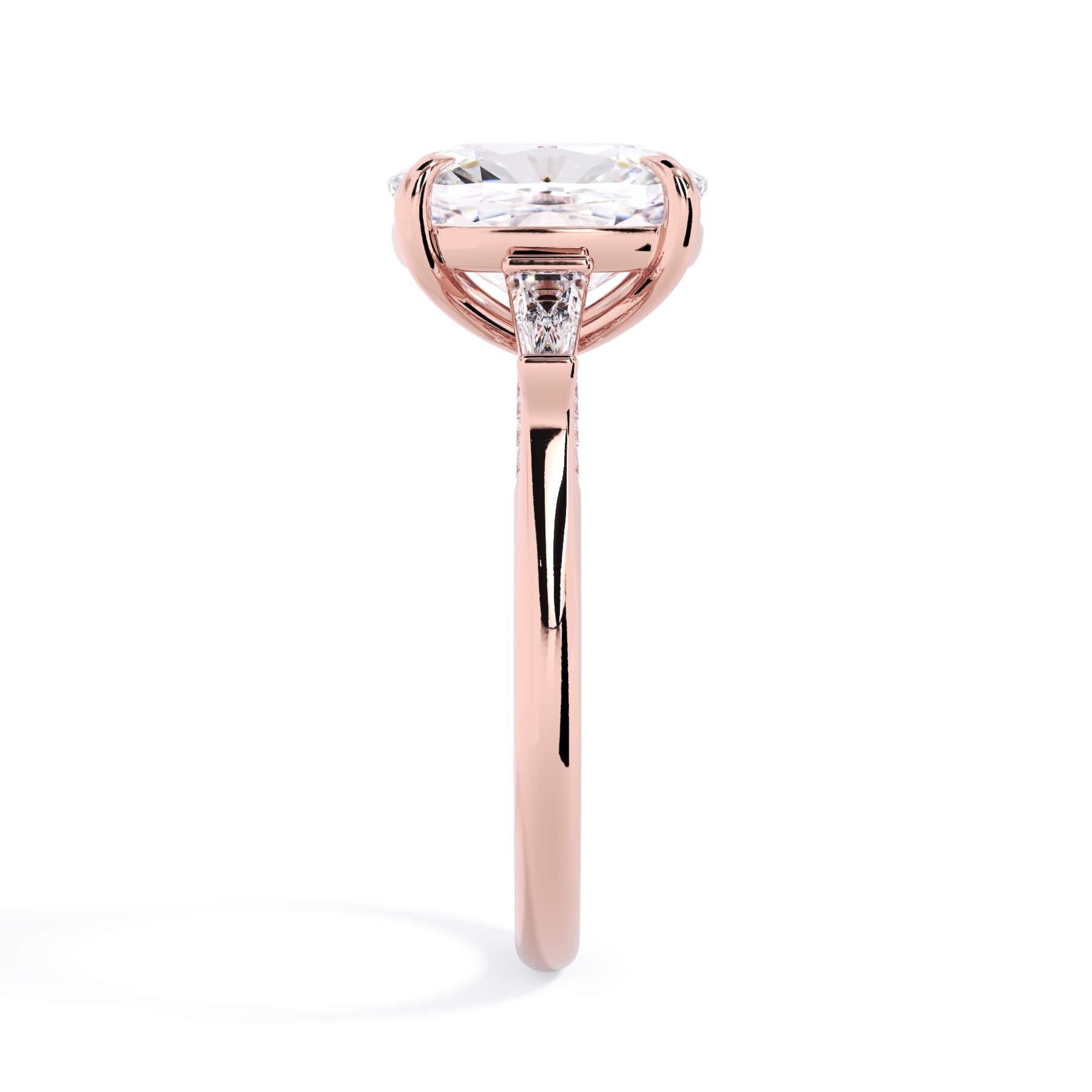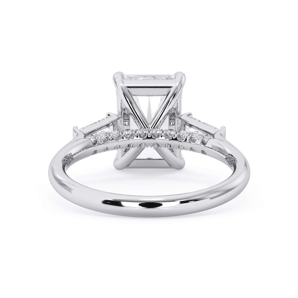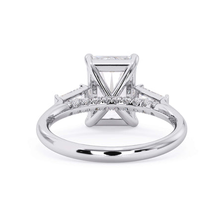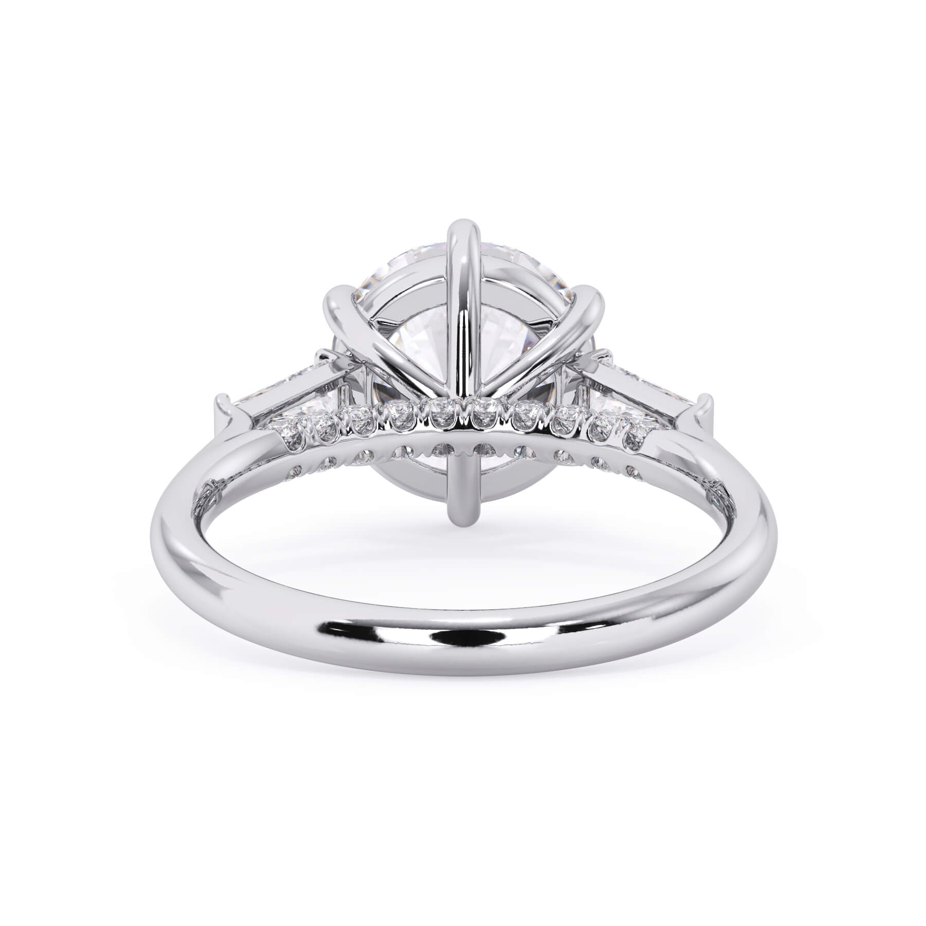 We added some extra sparkle with the 20 diamonds nestled on the shank below this traditional three stone engagement ring setting. Your chosen center stone rests beautifully between two matching baguette diamonds, and the diamonds on the shank give sparkle at every angle.