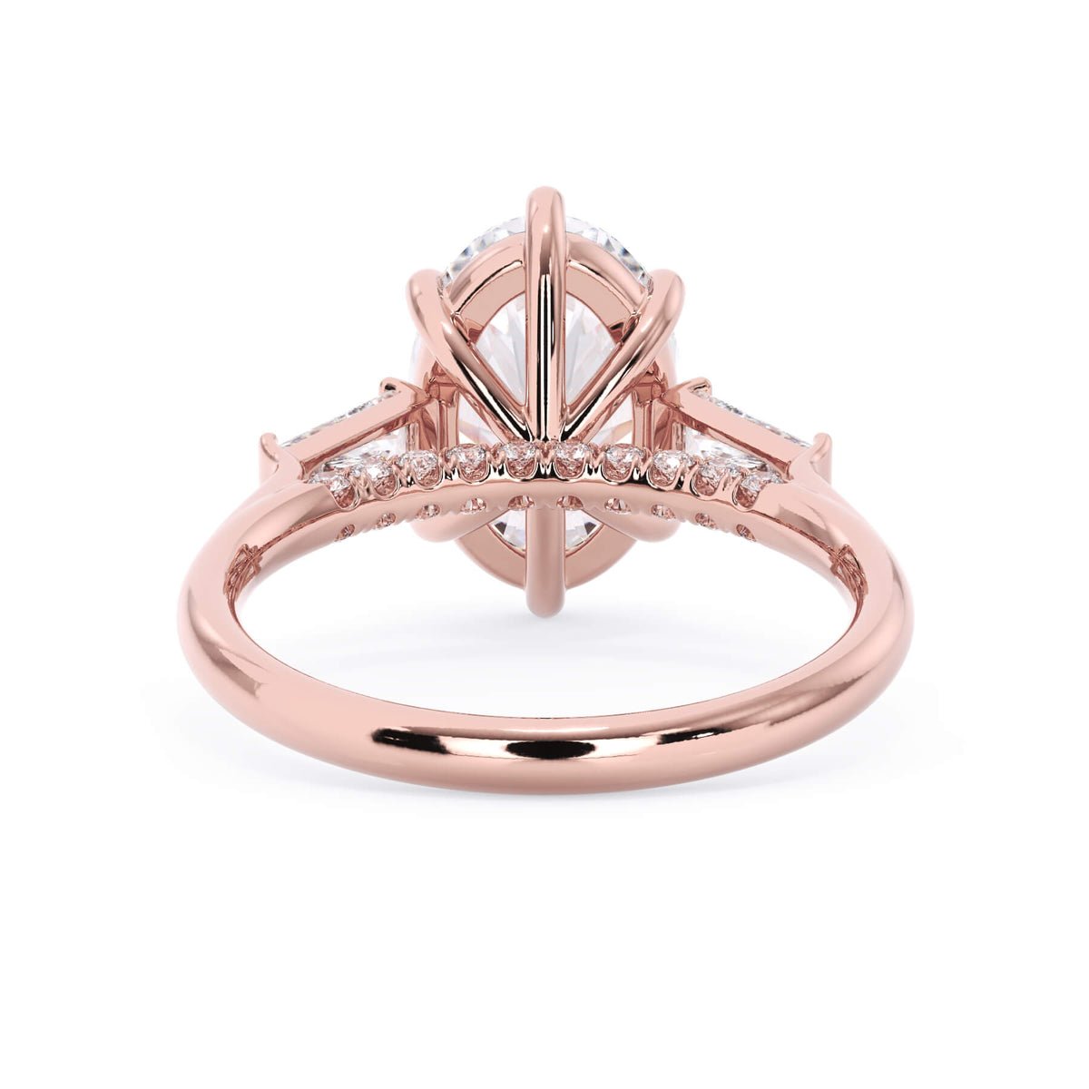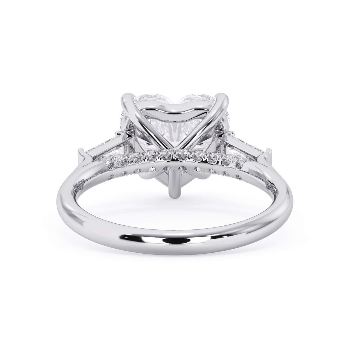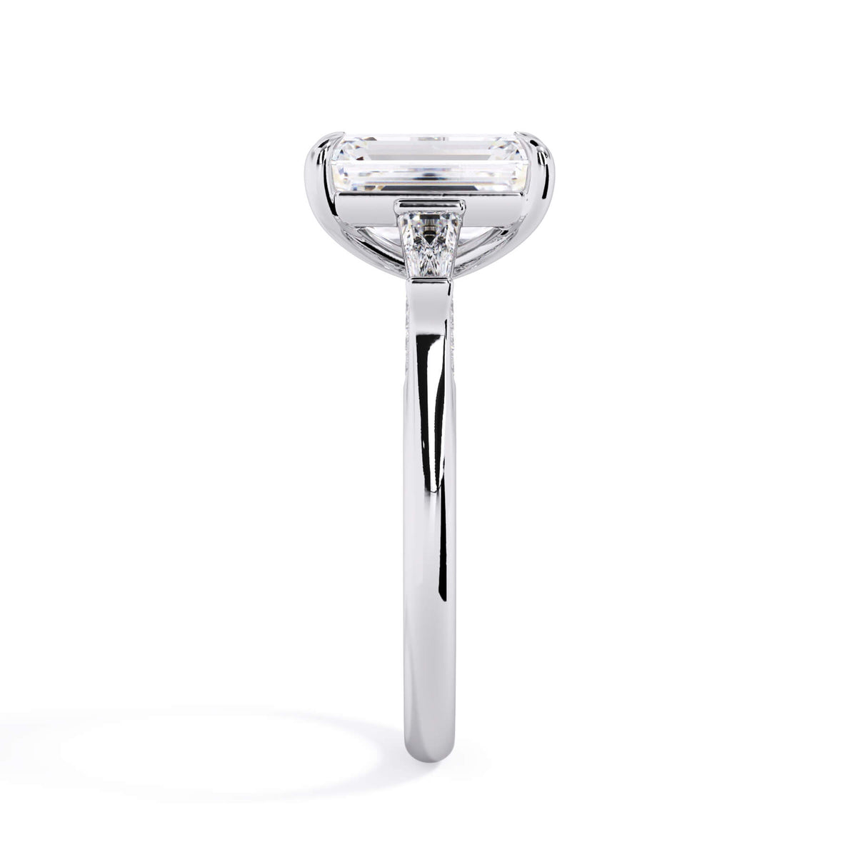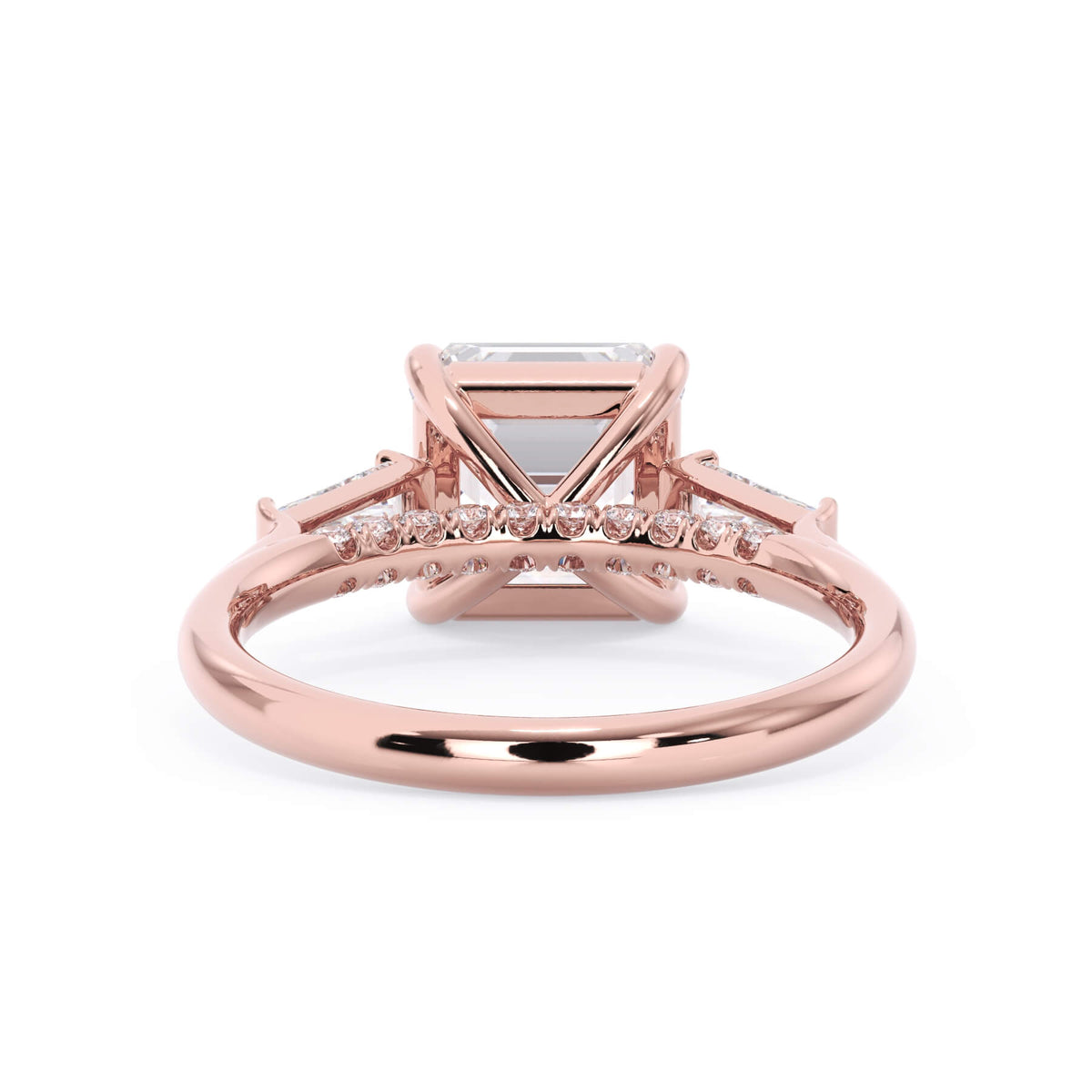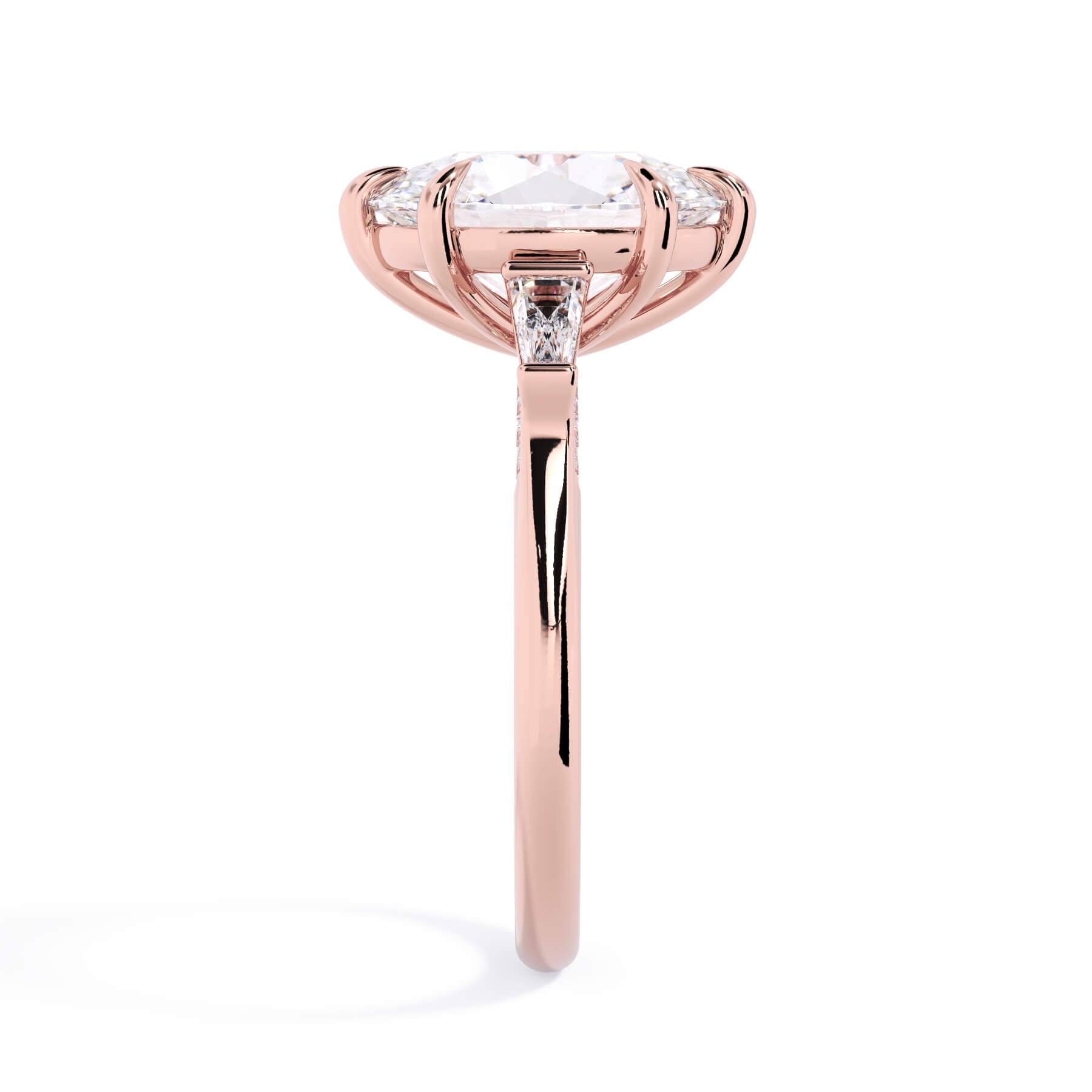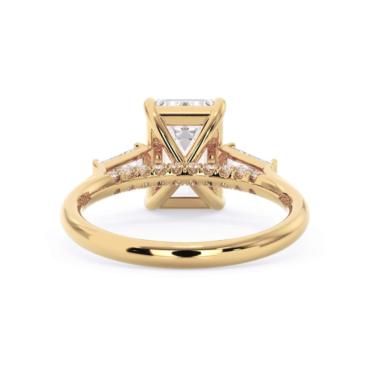 We added some extra sparkle with the 20 diamonds nestled on the shank below this traditional three stone engagement ring setting. Your chosen center stone rests beautifully between two matching baguette diamonds, and the diamonds on the shank give sparkle at every angle.