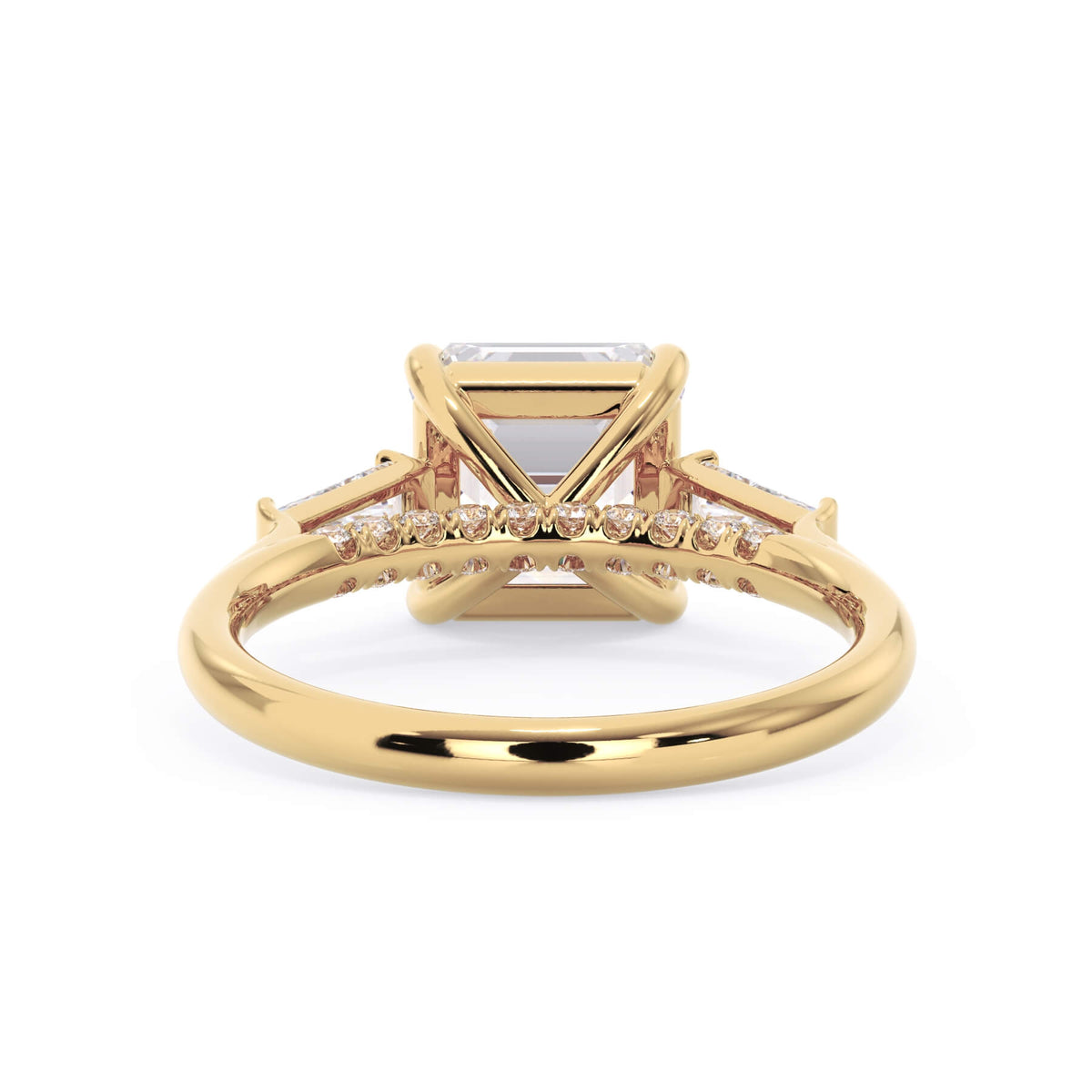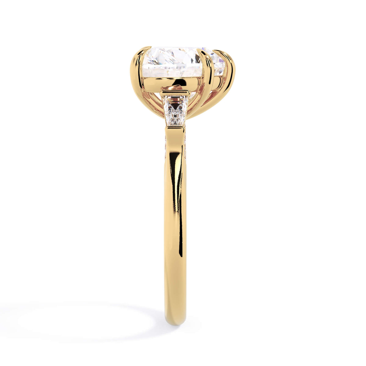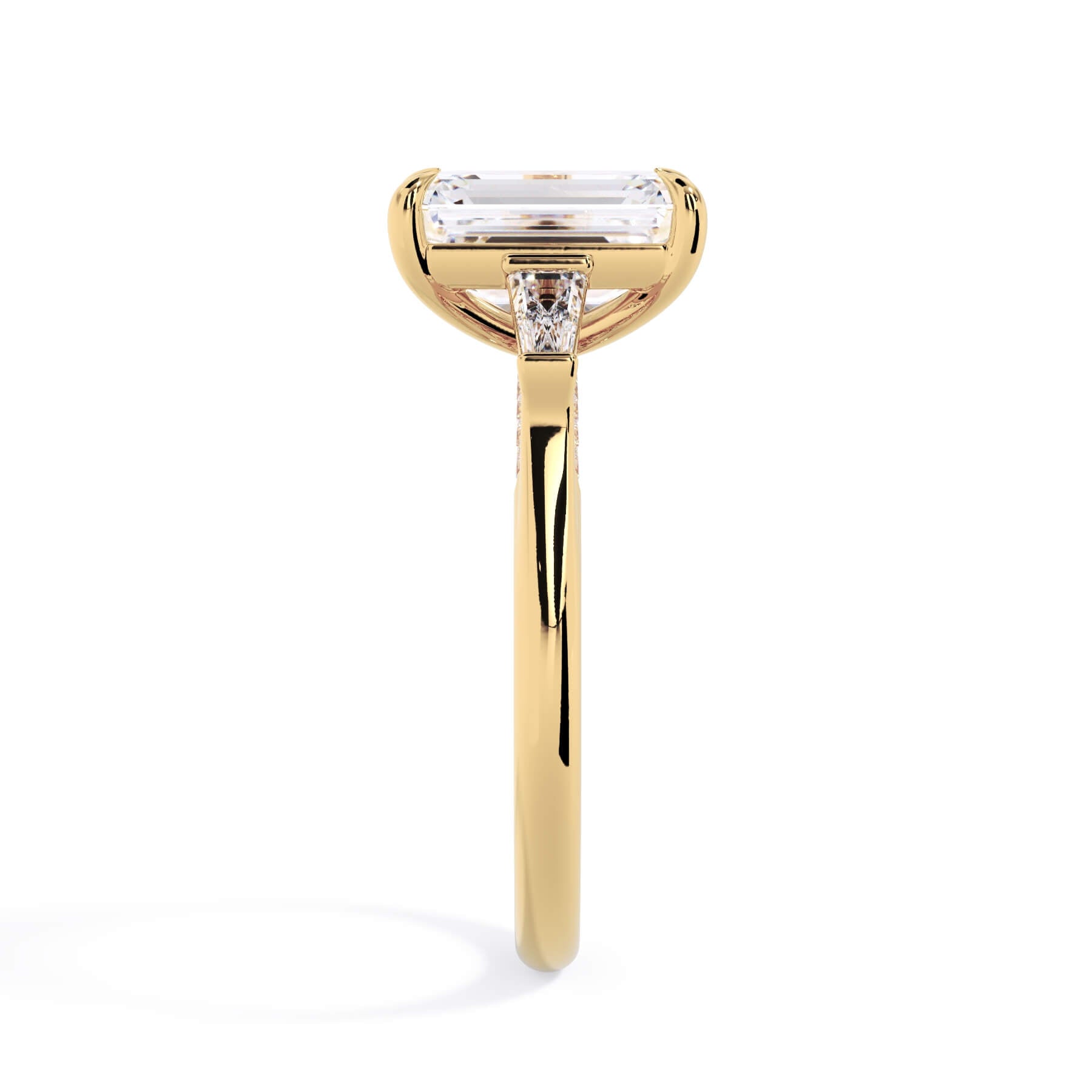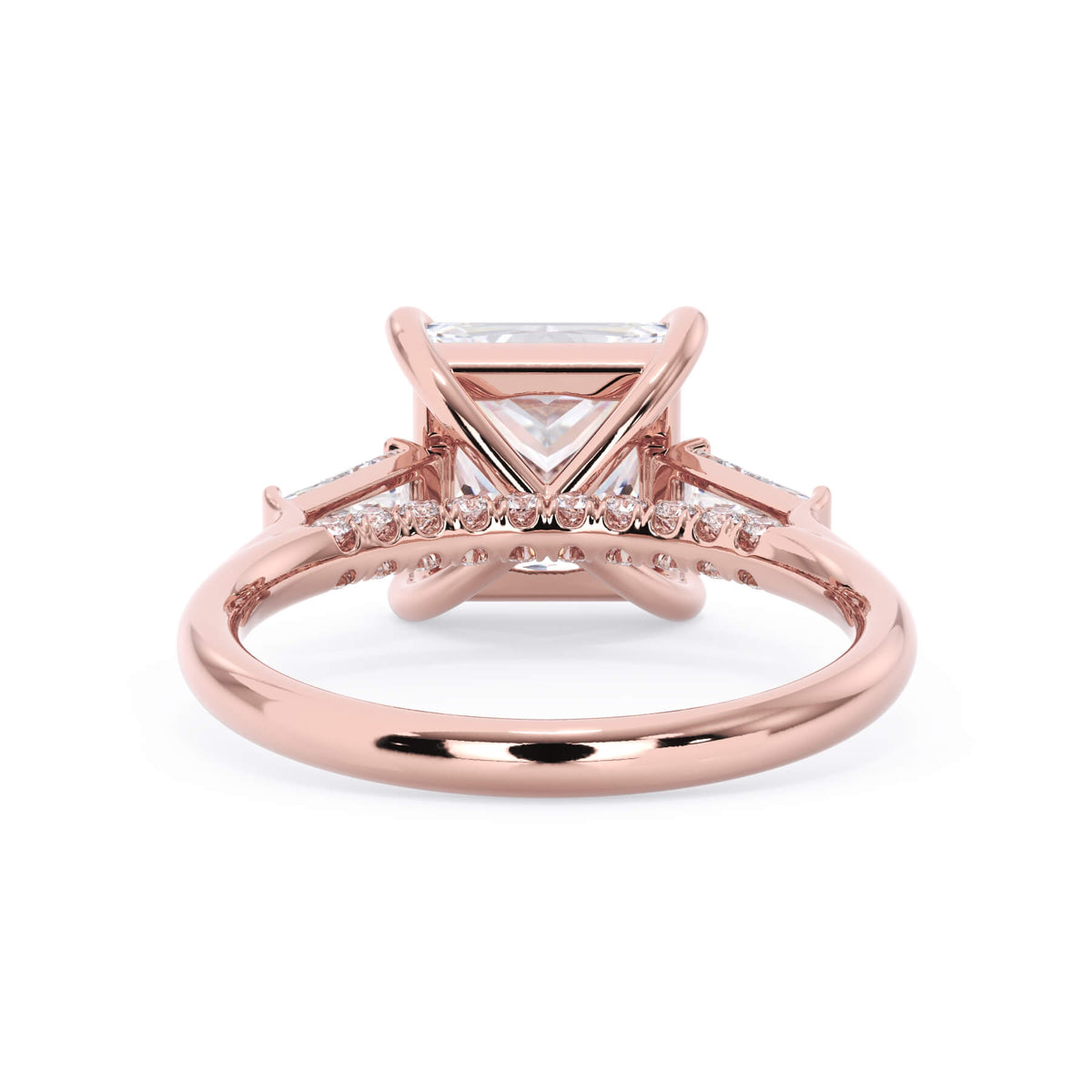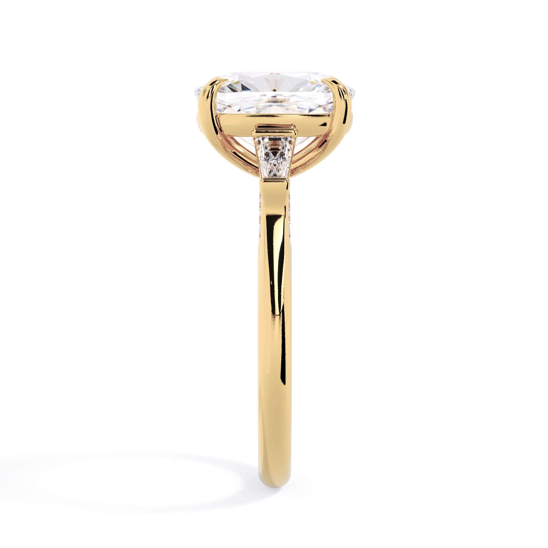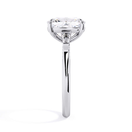 We added some extra sparkle with the 20 diamonds nestled on the shank below this traditional three stone engagement ring setting. Your chosen center stone rests beautifully between two matching baguette diamonds, and the diamonds on the shank give sparkle at every angle.