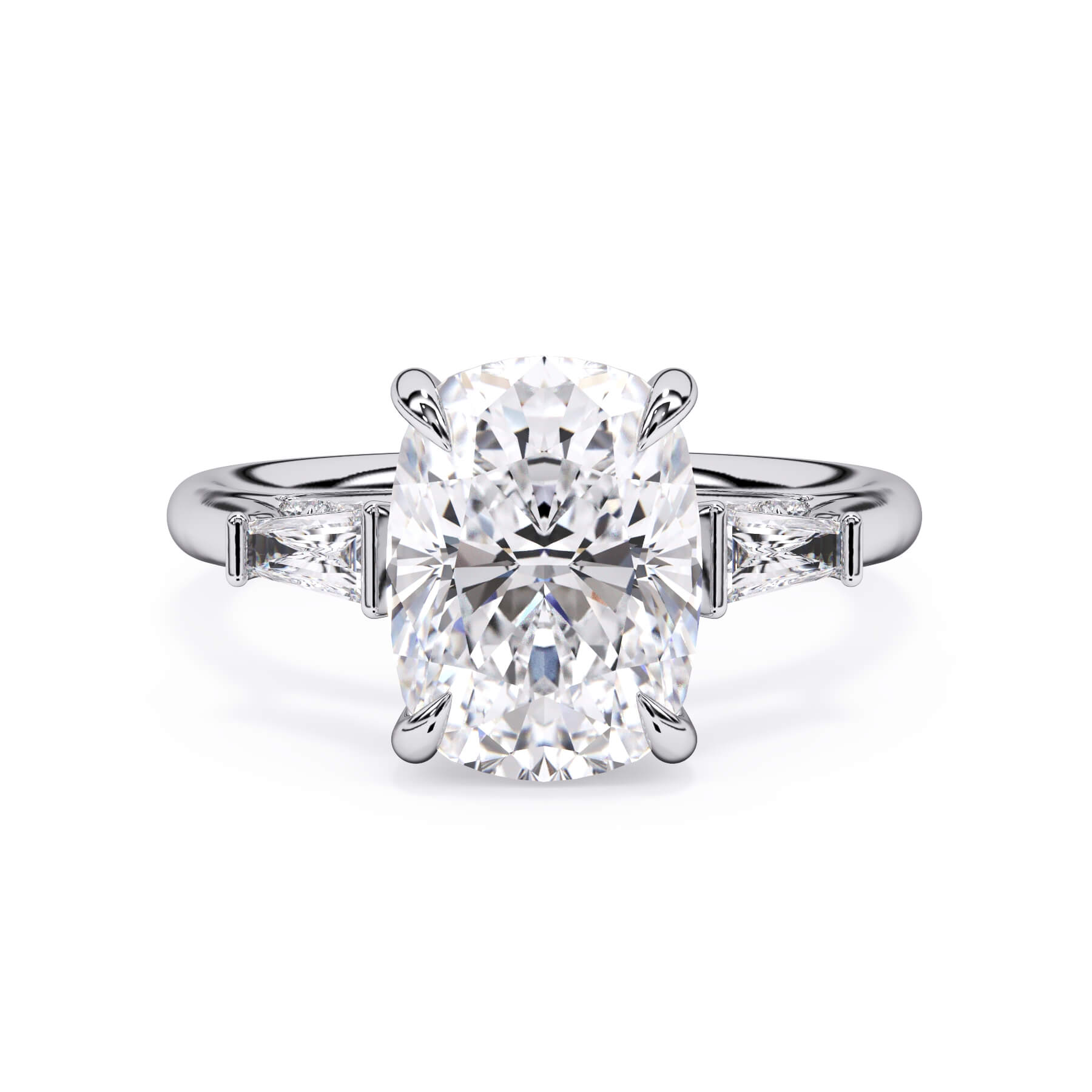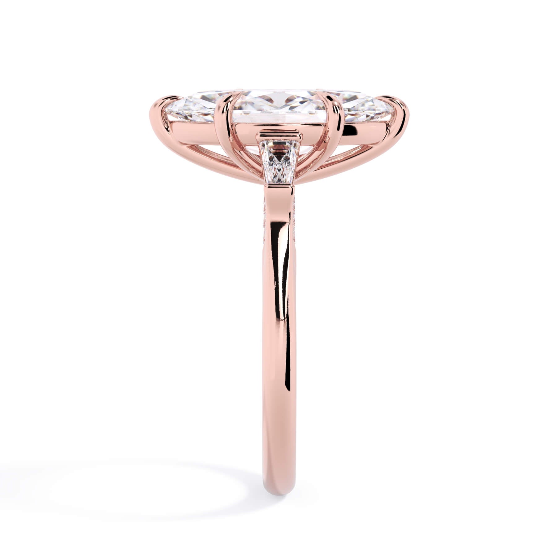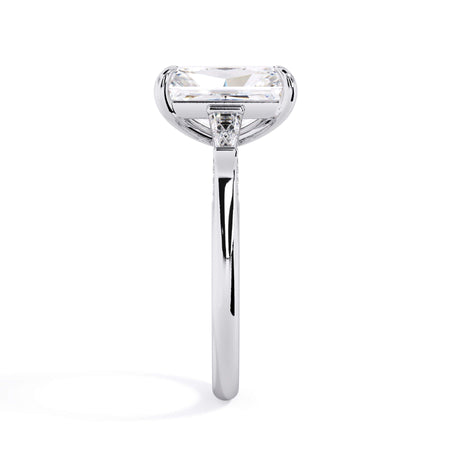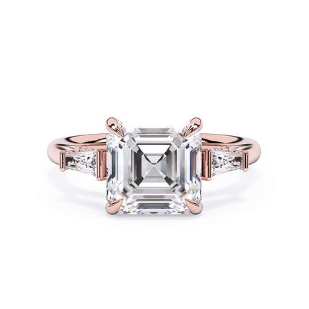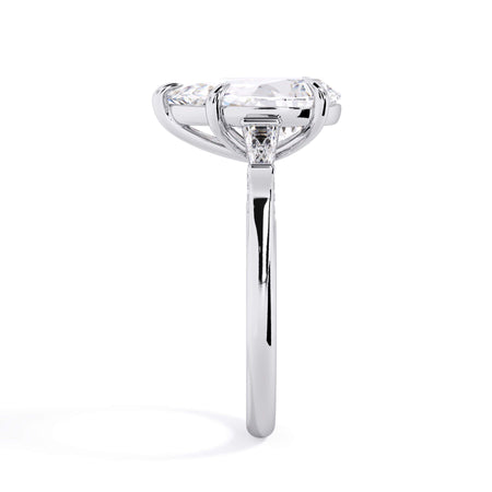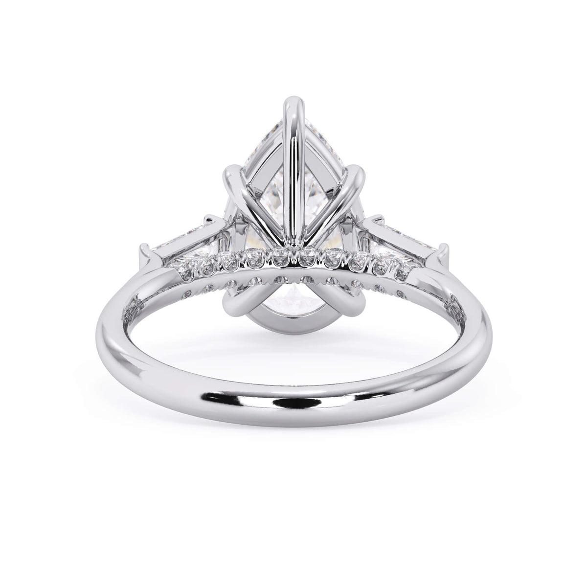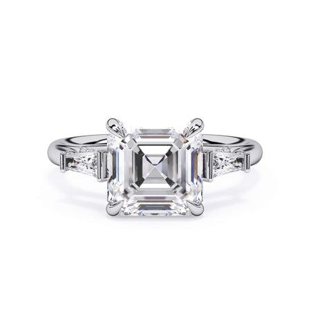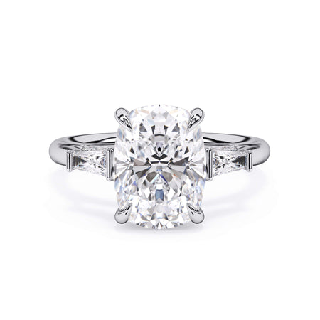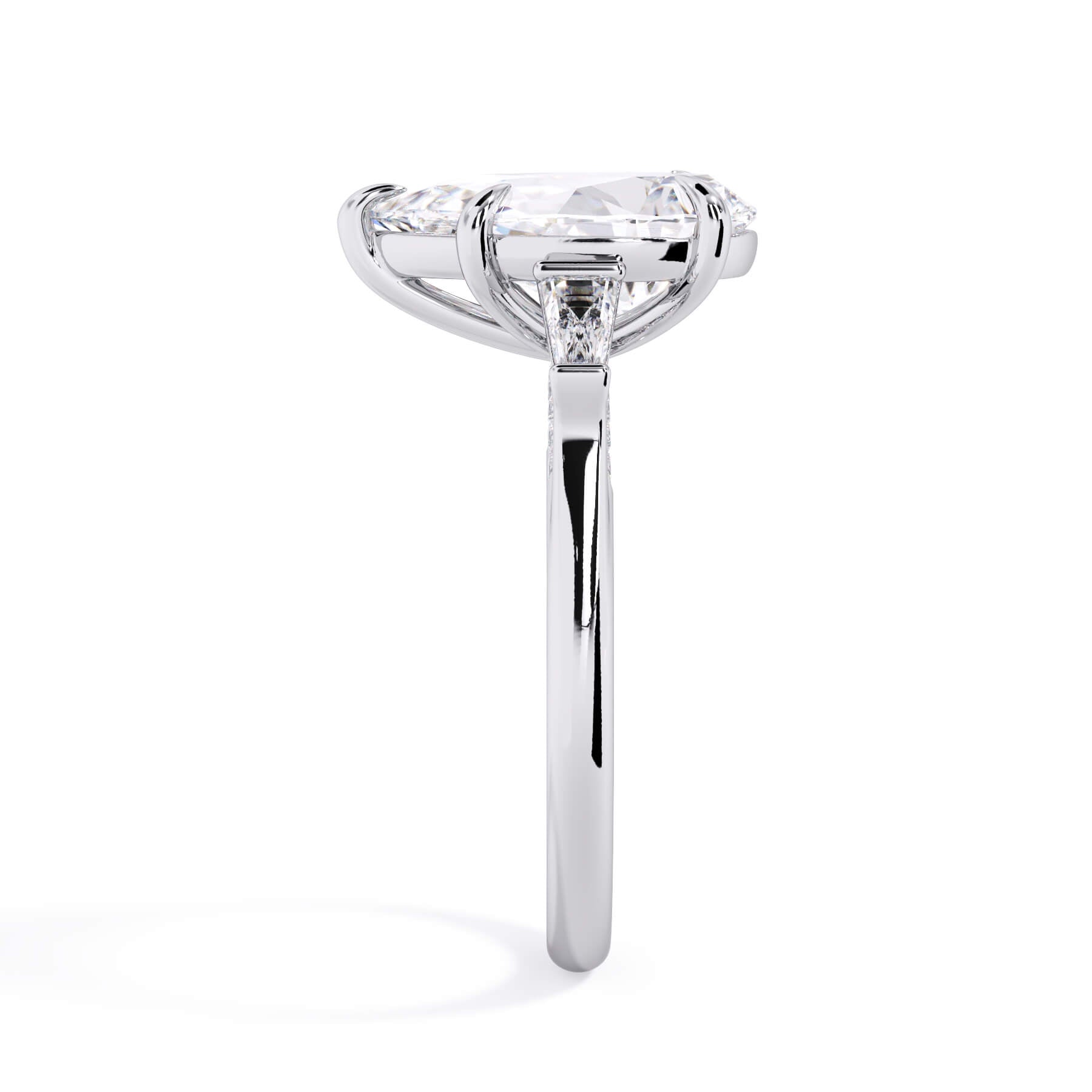 We added some extra sparkle with the 20 diamonds nestled on the shank below this traditional three stone engagement ring setting. Your chosen center stone rests beautifully between two matching baguette diamonds, and the diamonds on the shank give sparkle at every angle.