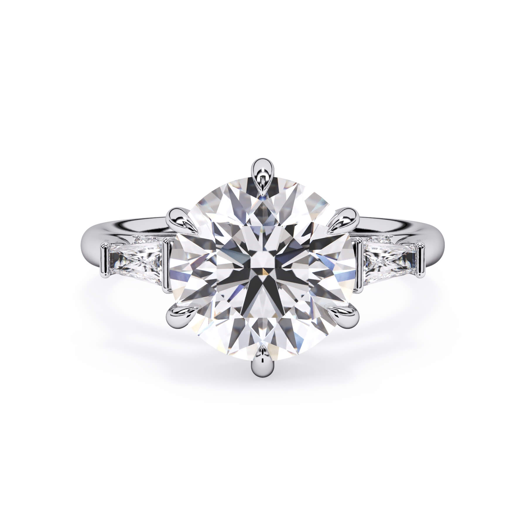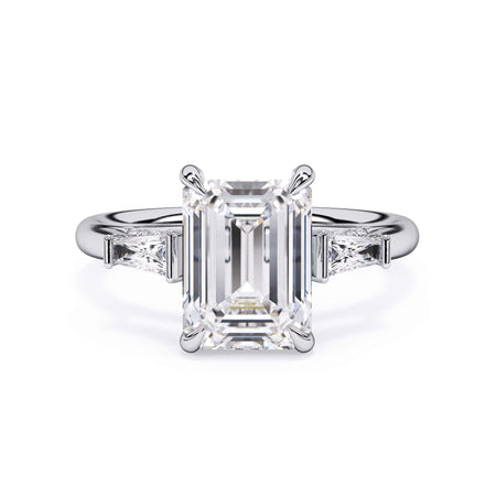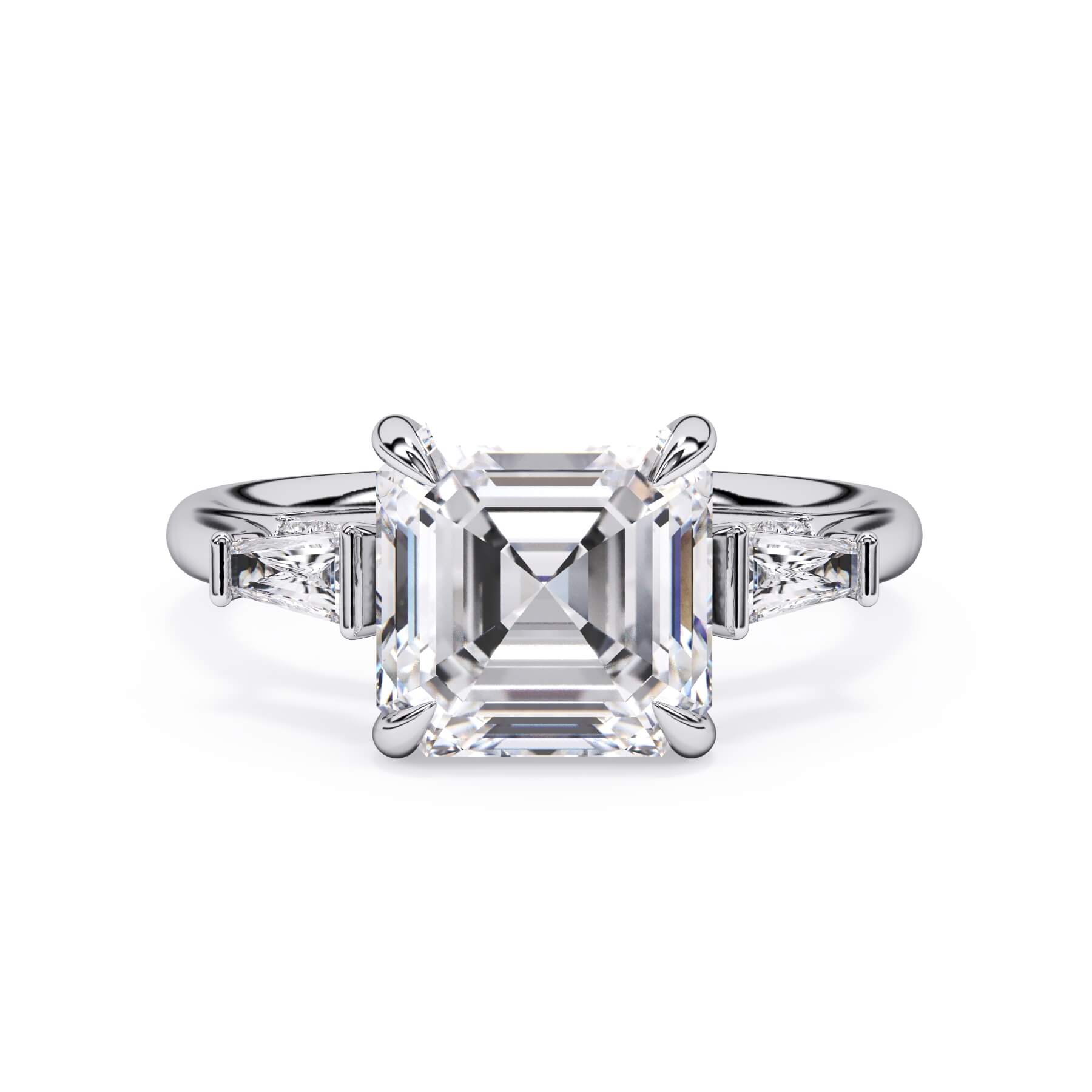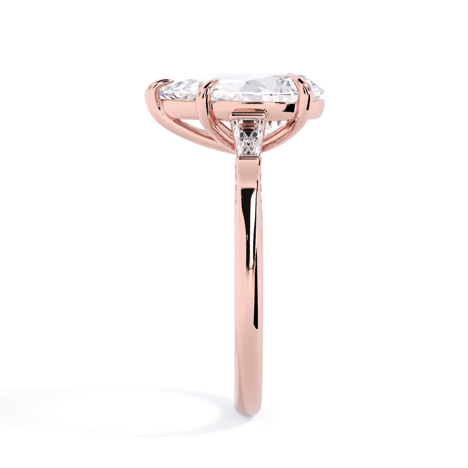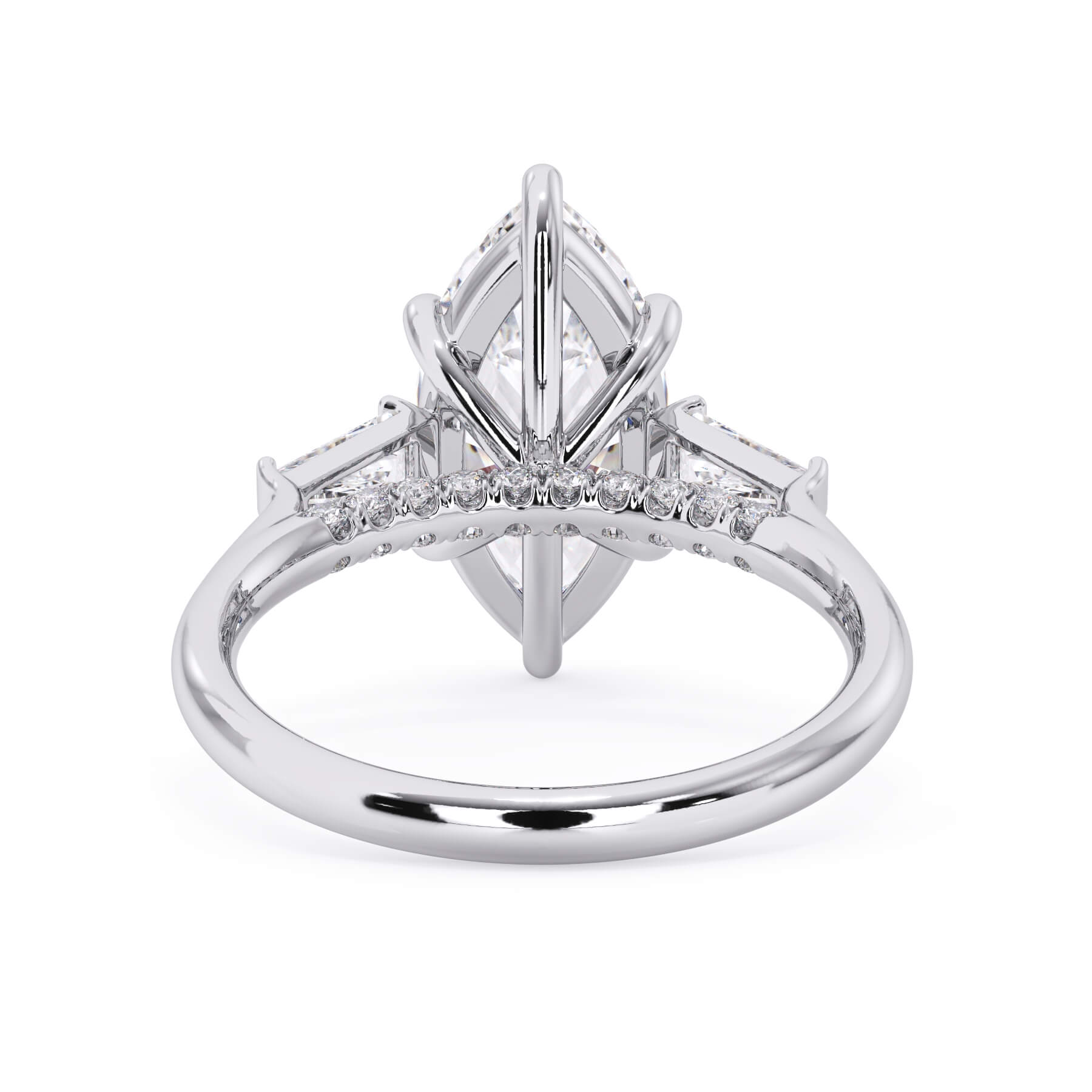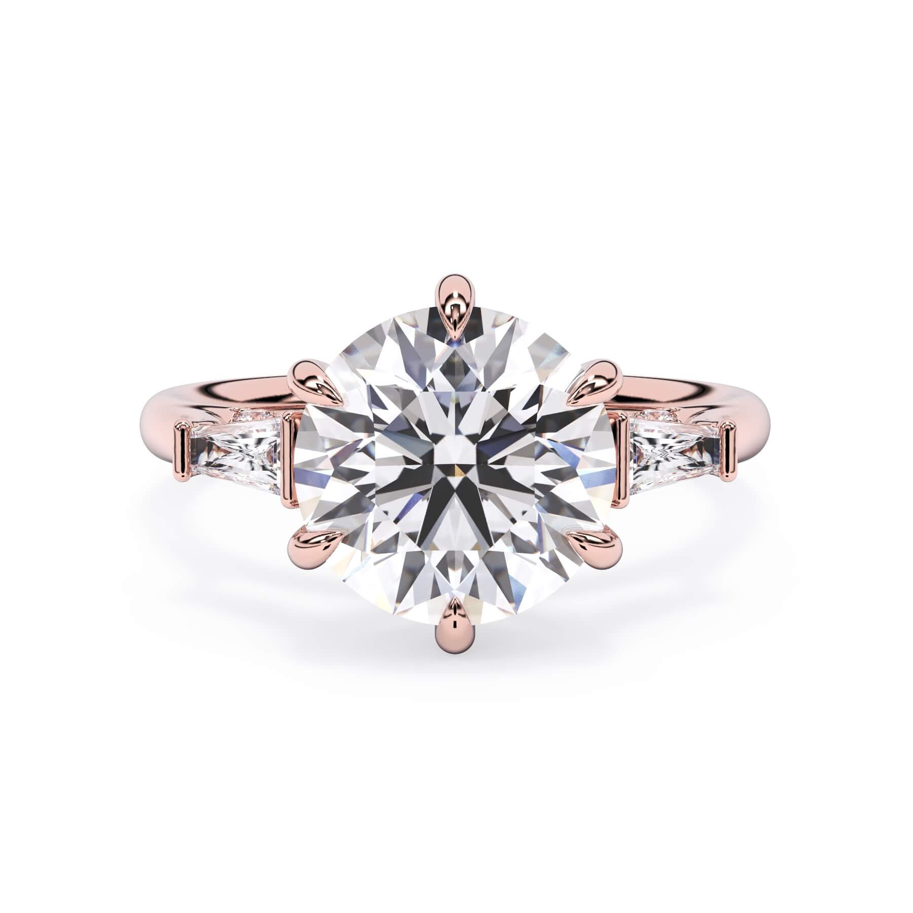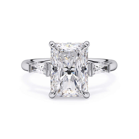 We added some extra sparkle with the 20 diamonds nestled on the shank below this traditional three stone engagement ring setting. Your chosen center stone rests beautifully between two matching baguette diamonds, and the diamonds on the shank give sparkle at every angle.