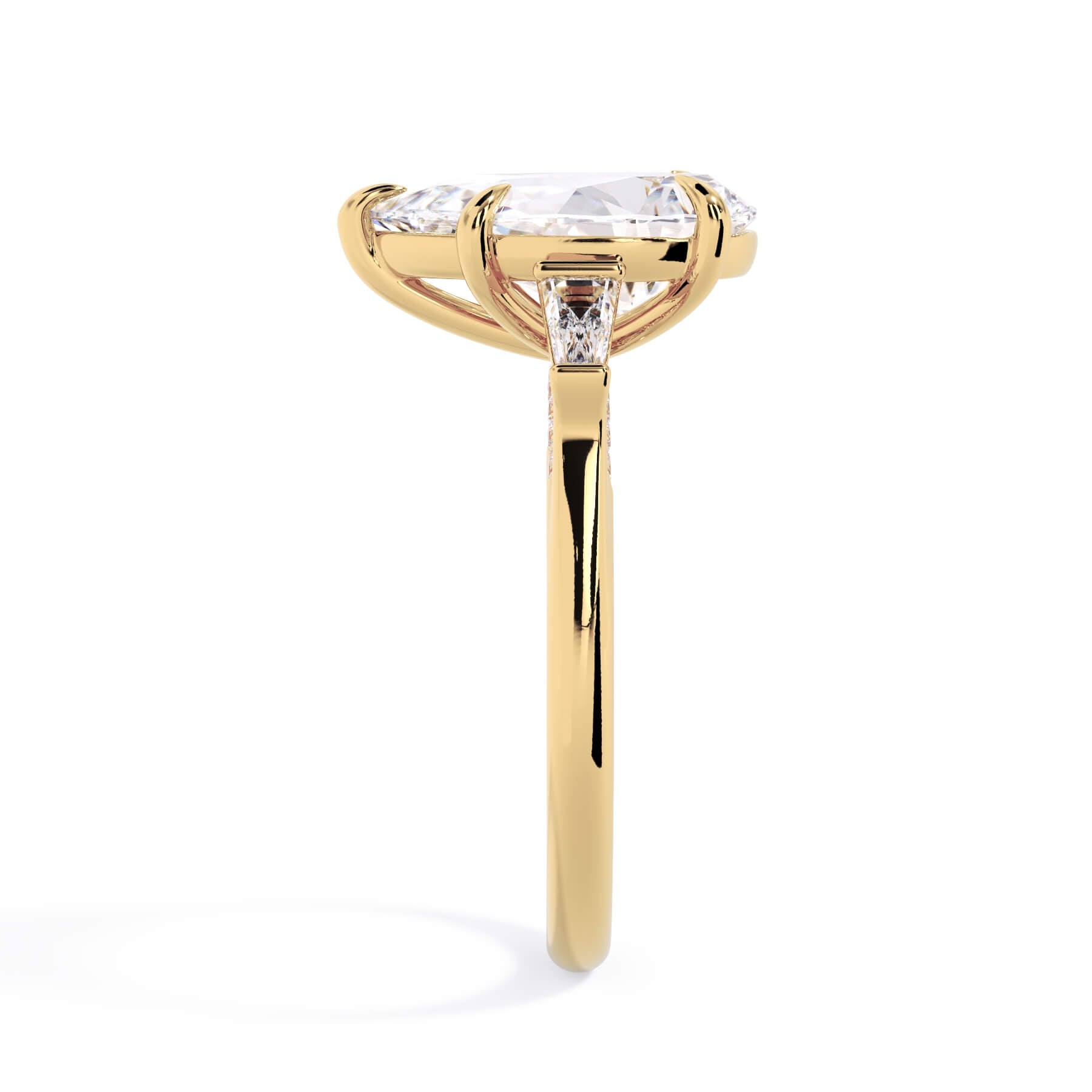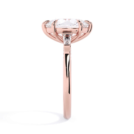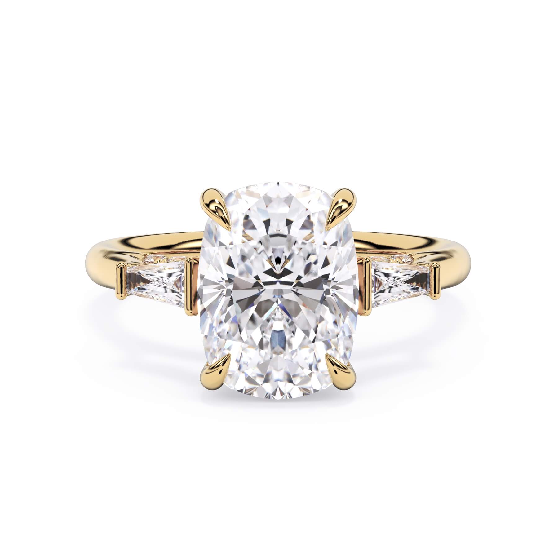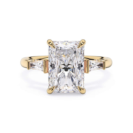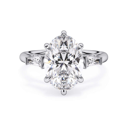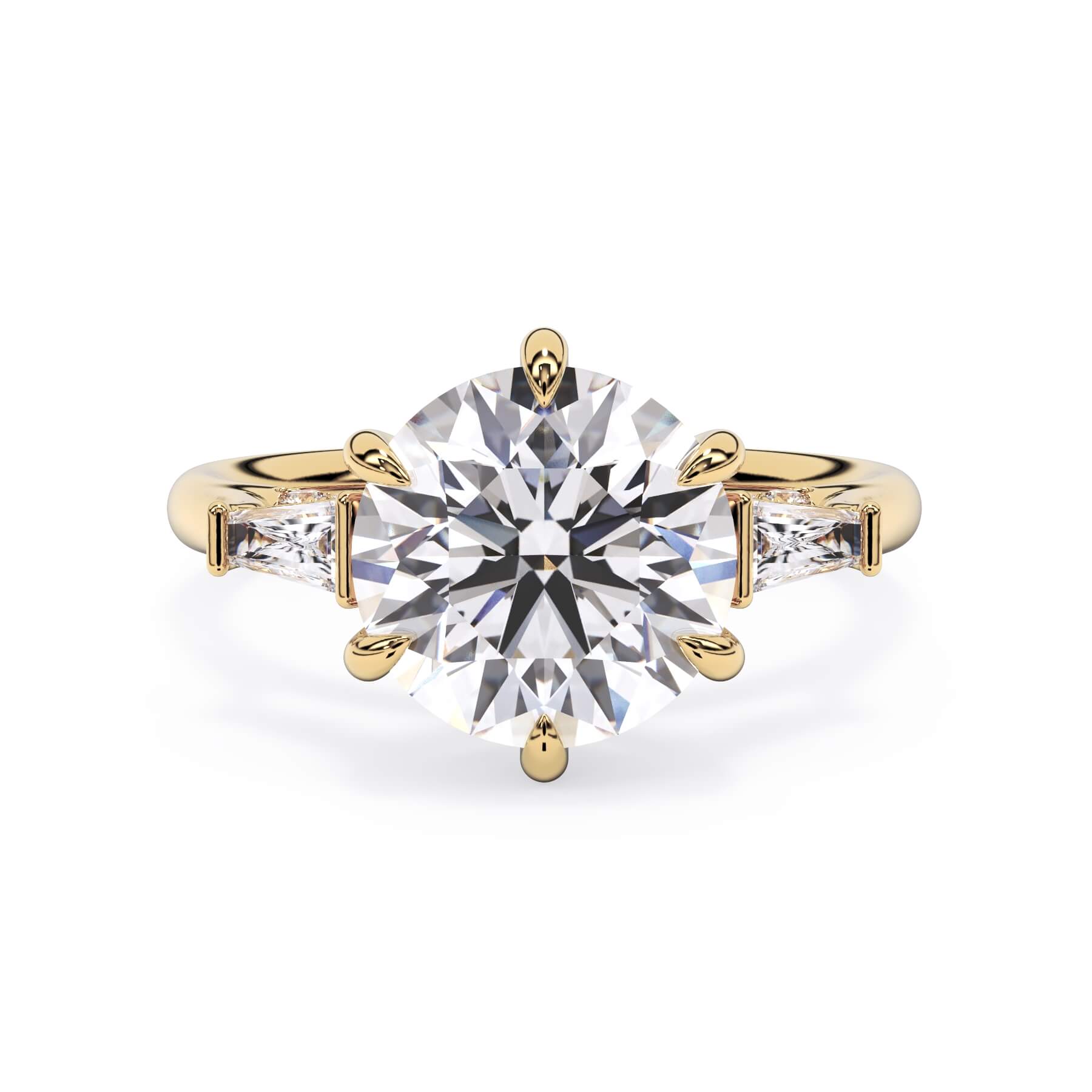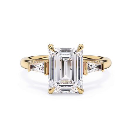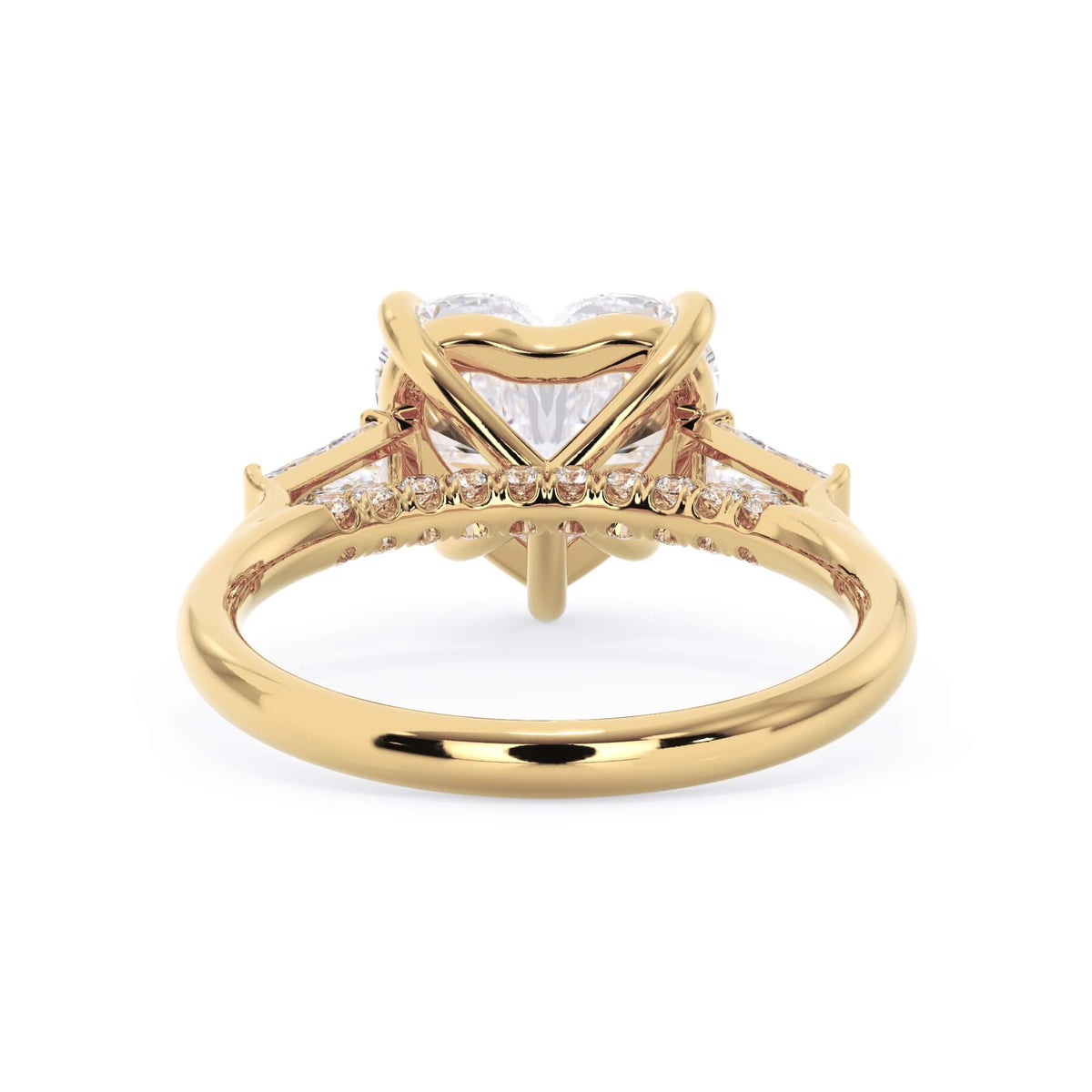 We added some extra sparkle with the 20 diamonds nestled on the shank below this traditional three stone engagement ring setting. Your chosen center stone rests beautifully between two matching baguette diamonds, and the diamonds on the shank give sparkle at every angle.