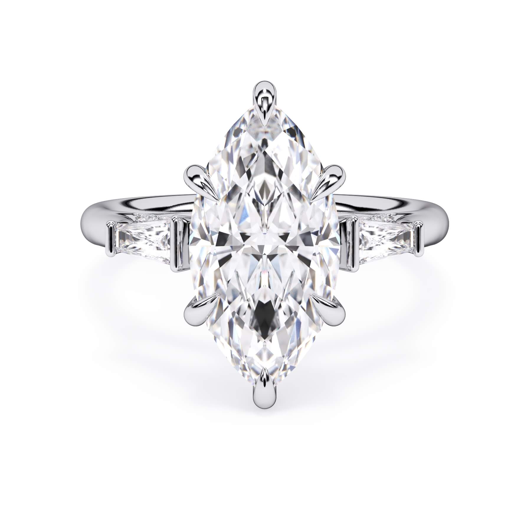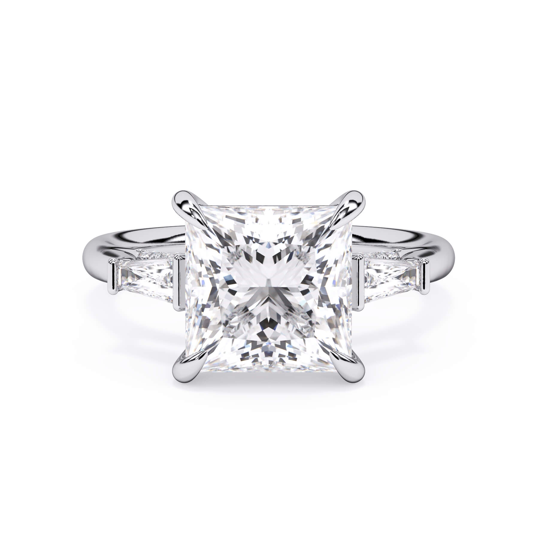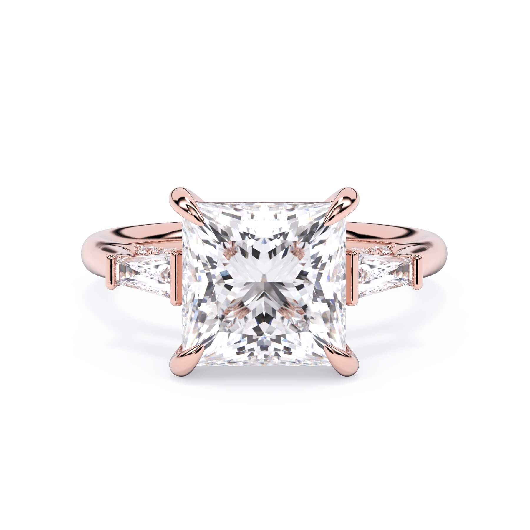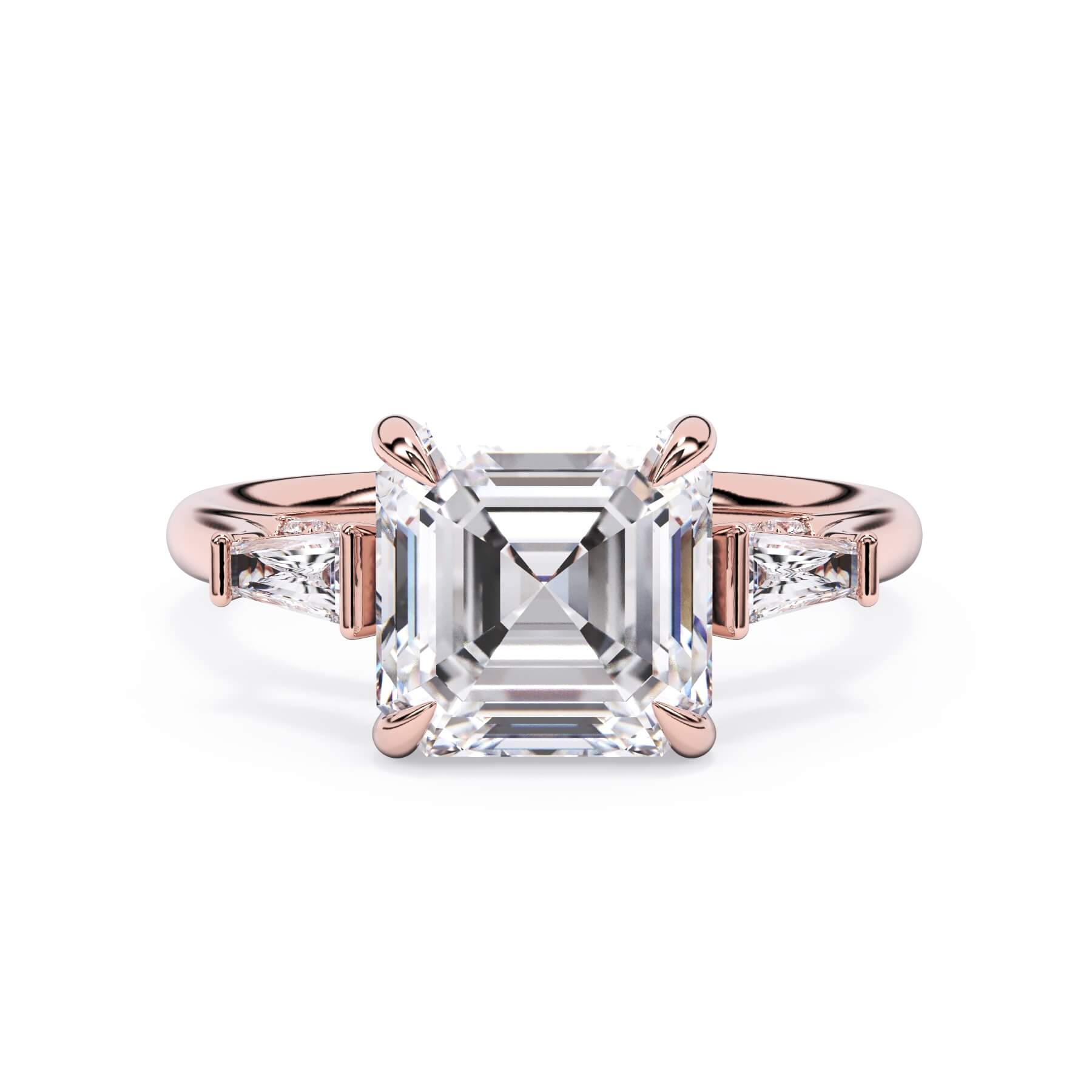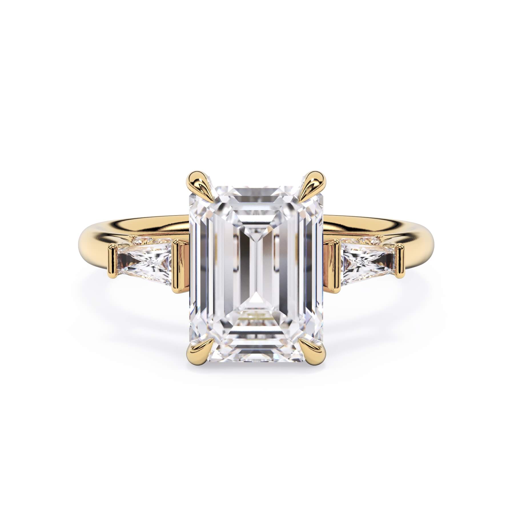 We added some extra sparkle with the 20 diamonds nestled on the shank below this traditional three stone engagement ring setting. Your chosen center stone rests beautifully between two matching baguette diamonds, and the diamonds on the shank give sparkle at every angle.