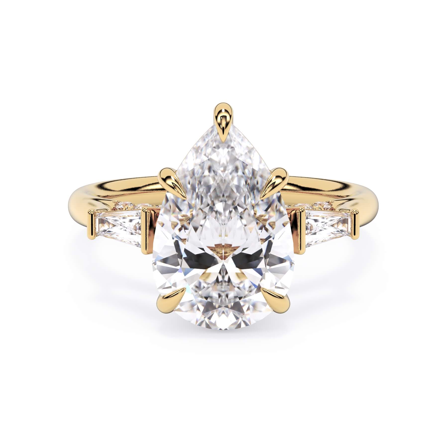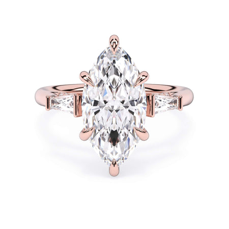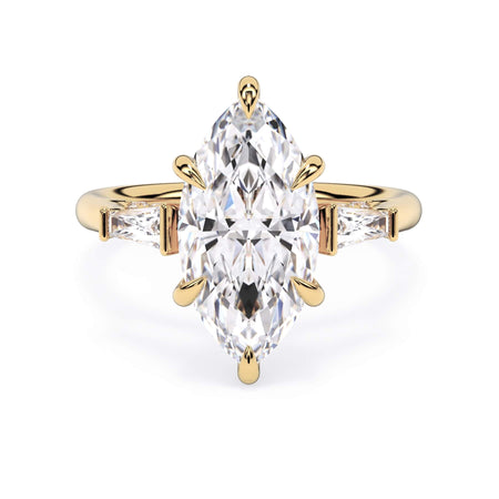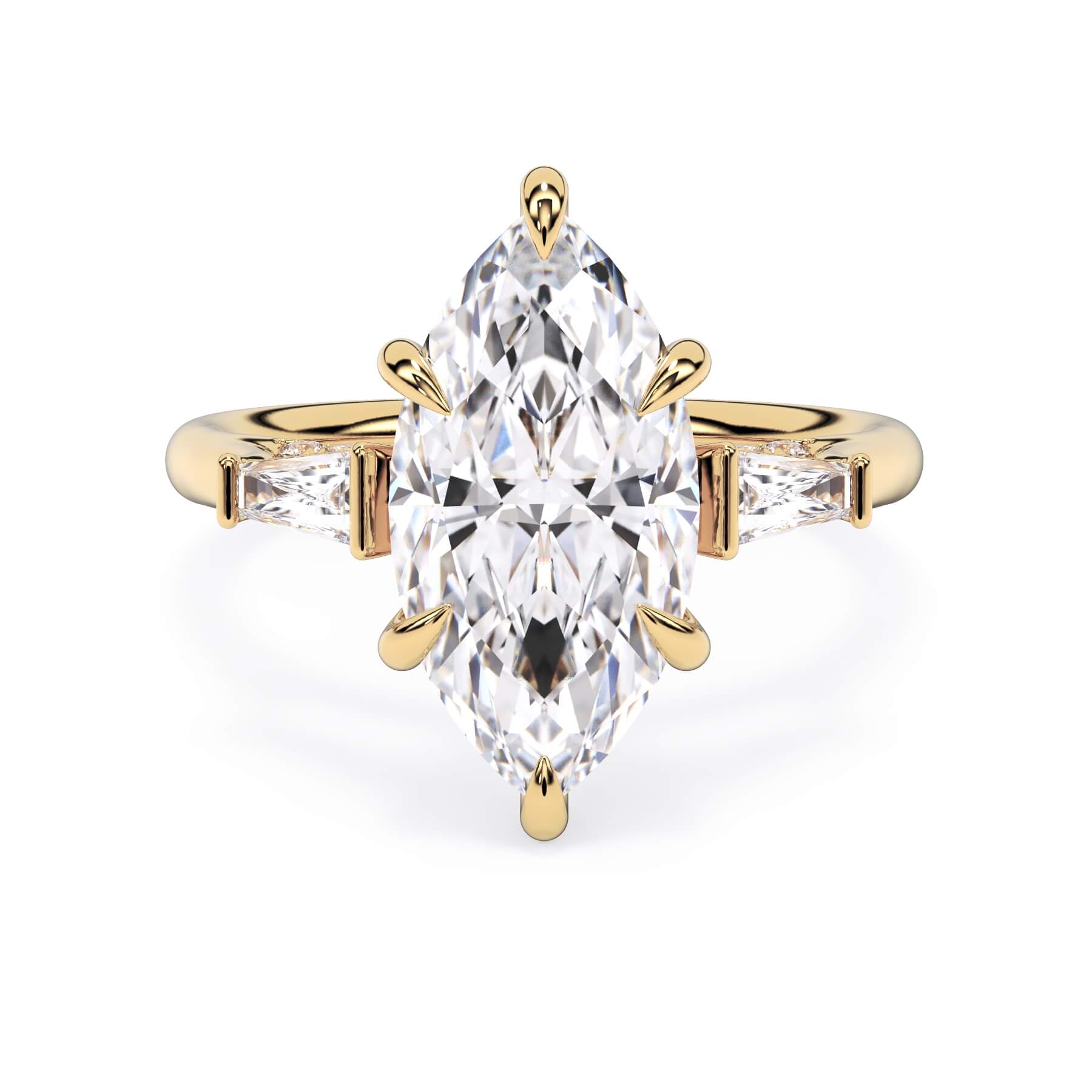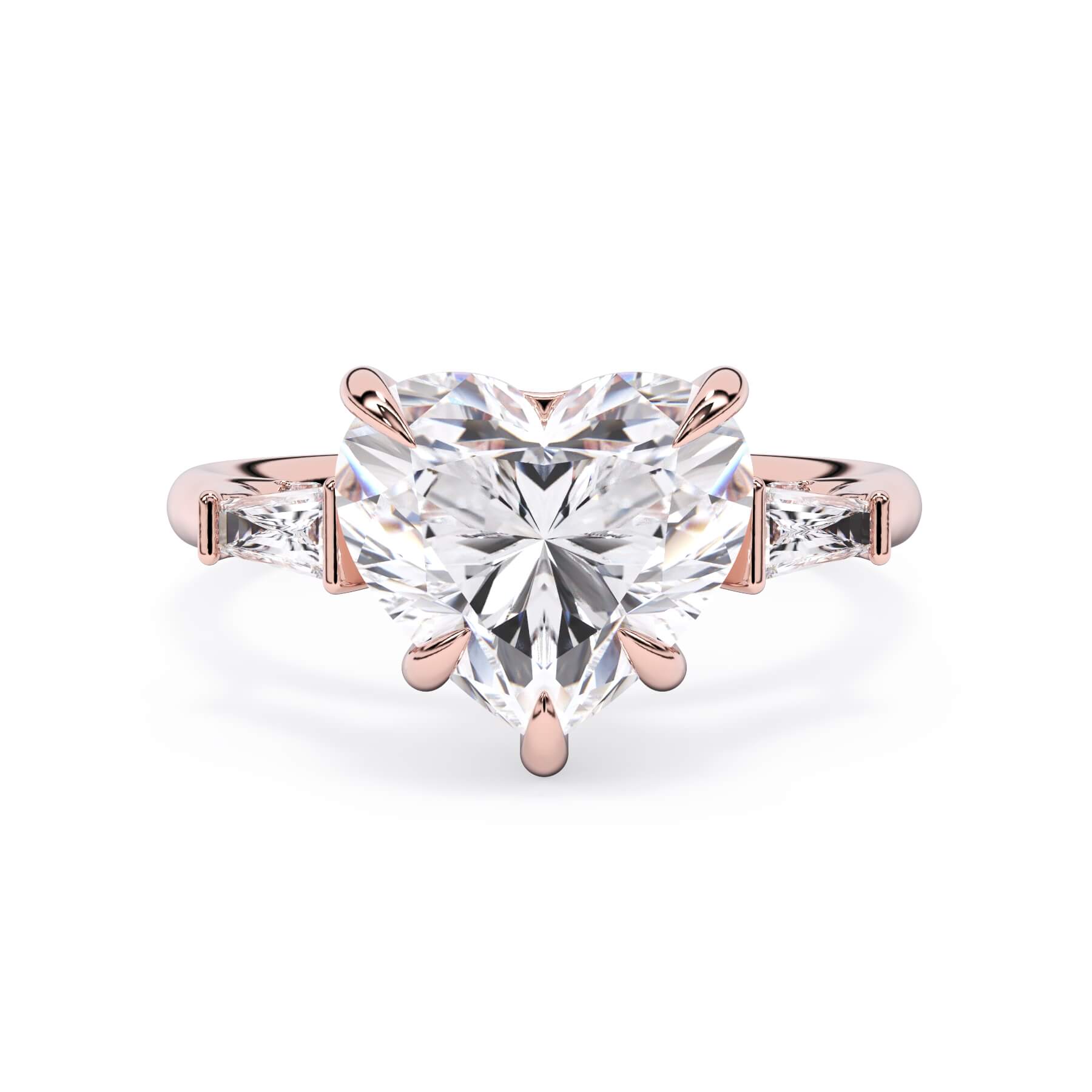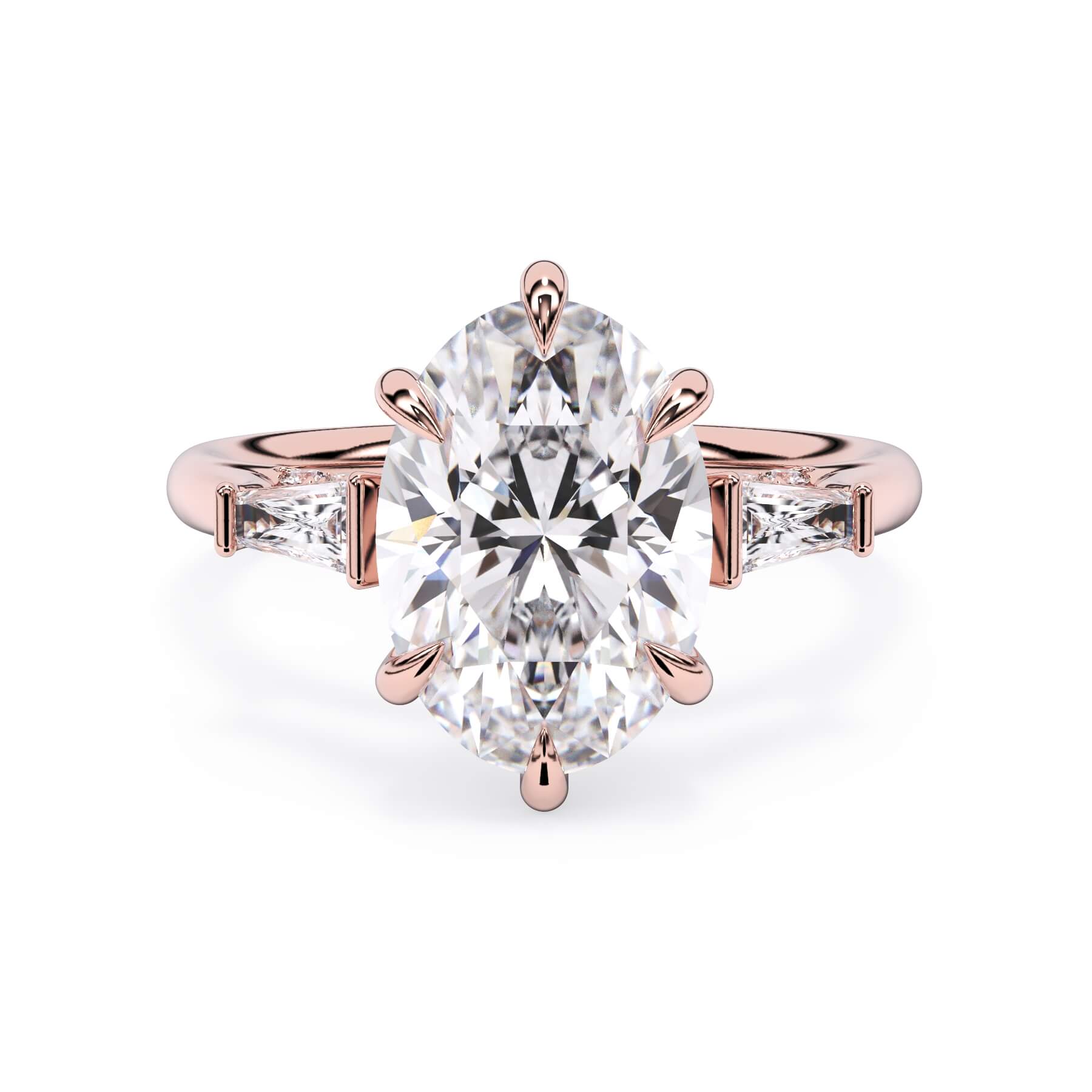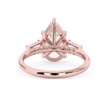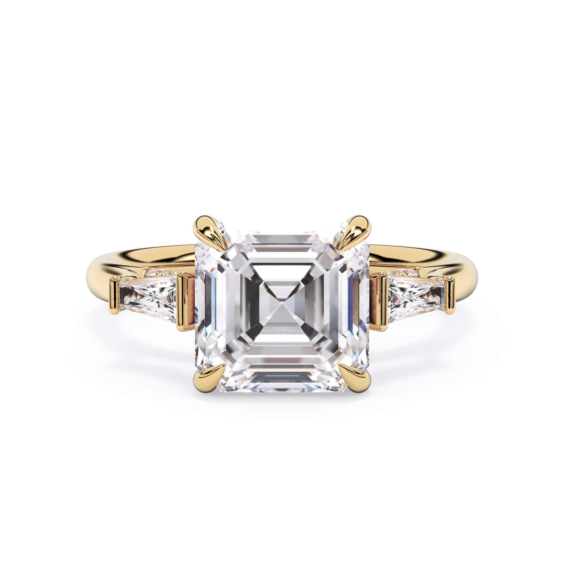 We added some extra sparkle with the 20 diamonds nestled on the shank below this traditional three stone engagement ring setting. Your chosen center stone rests beautifully between two matching baguette diamonds, and the diamonds on the shank give sparkle at every angle.