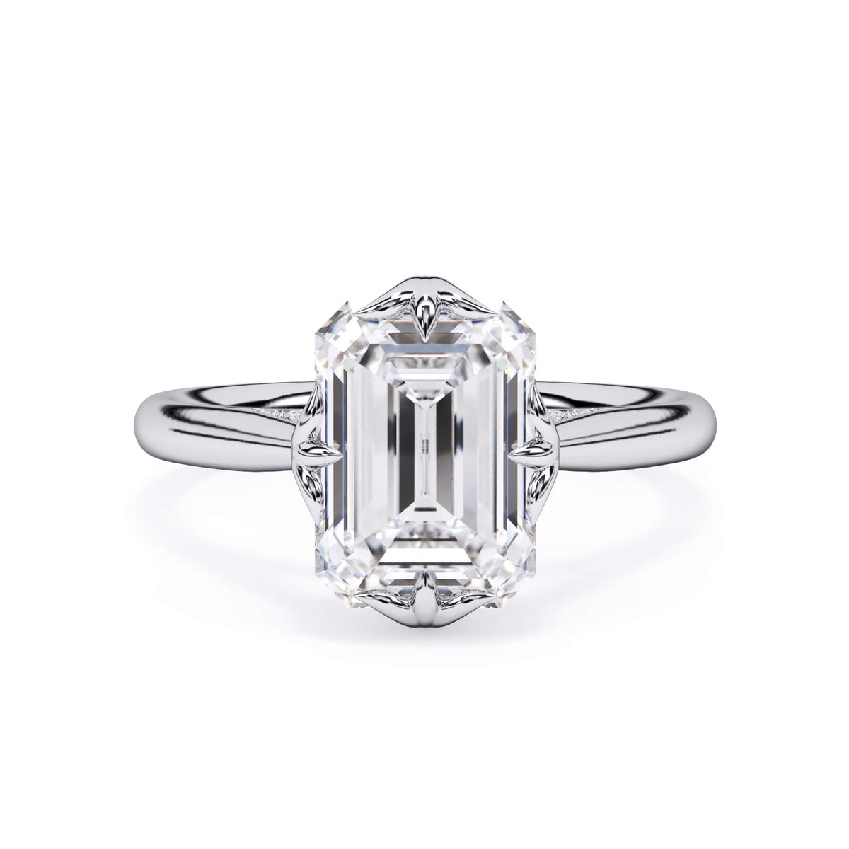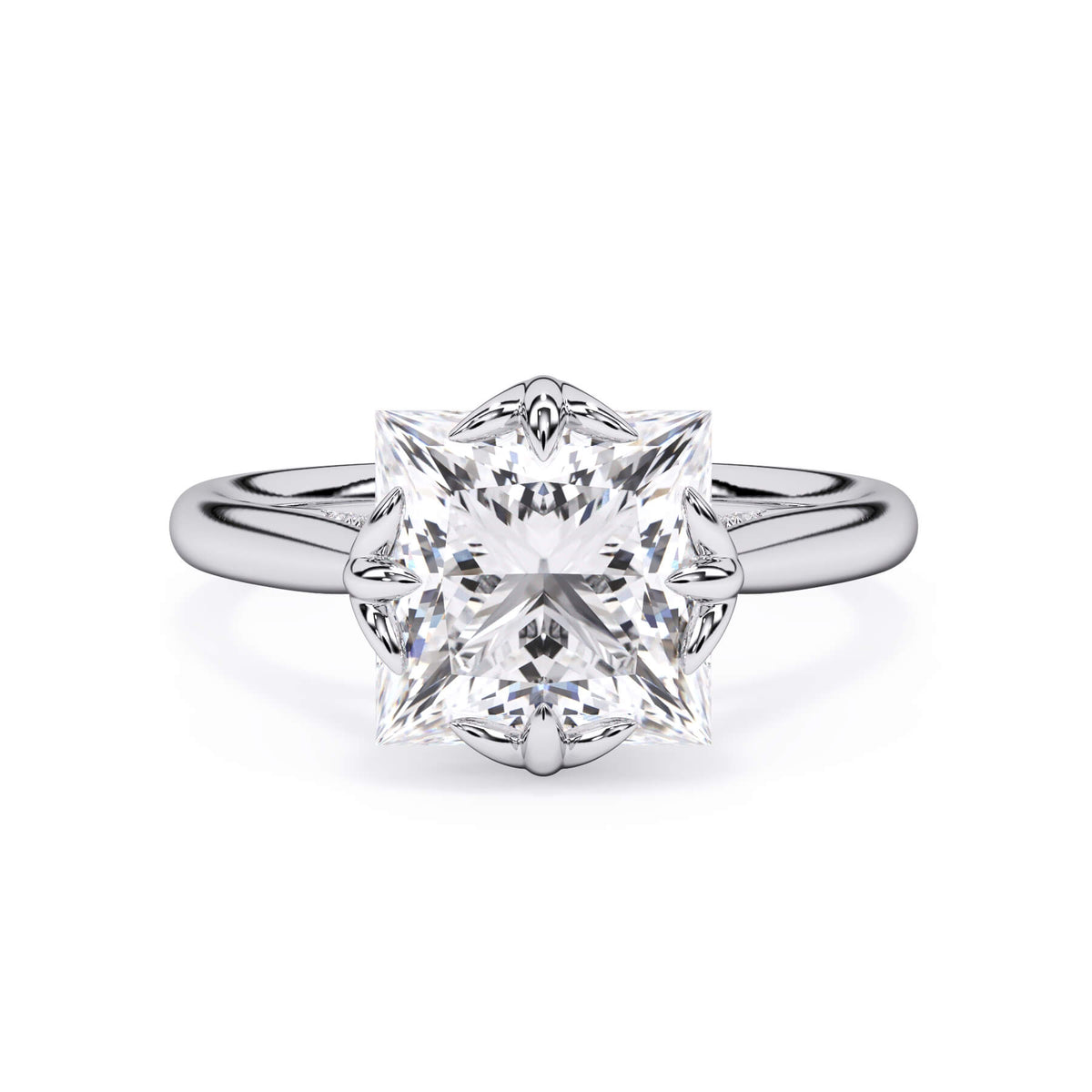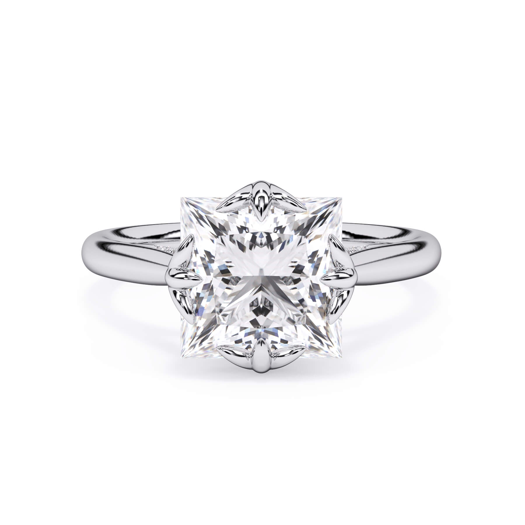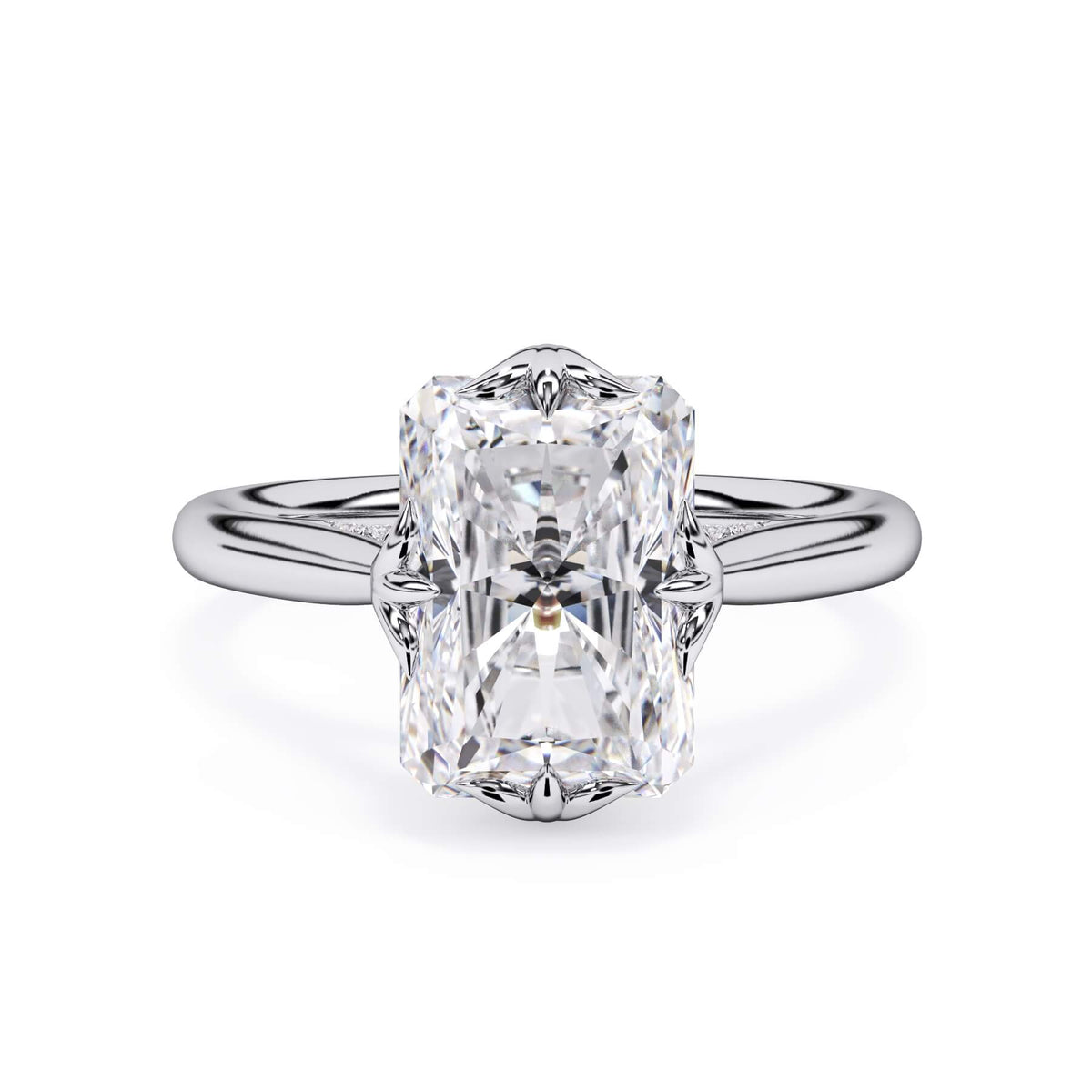 With the fanciful treble prongs, this ring also features an underhalo of sparkling diamonds along with diamonds underneath the cathedral style setting. This triple prong engagement ring evokes a natural, playful beauty that will enhance your center stone.