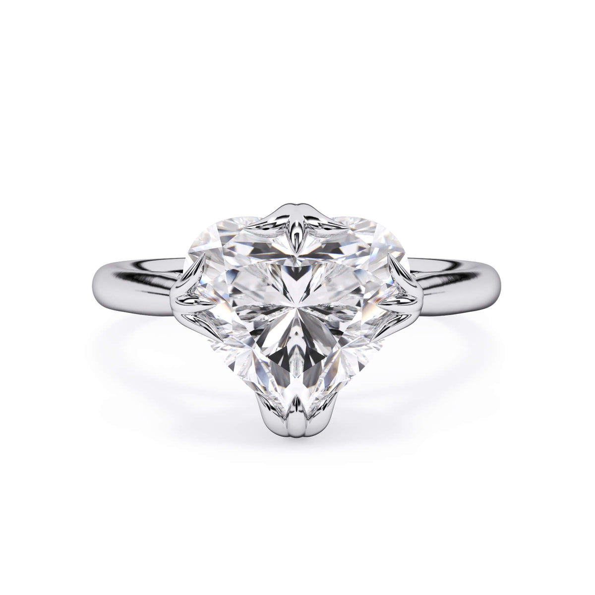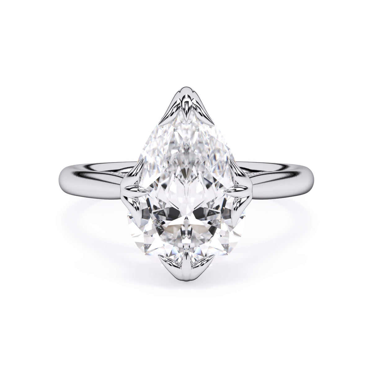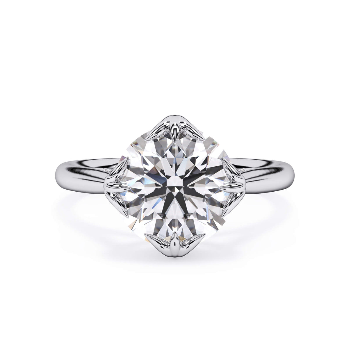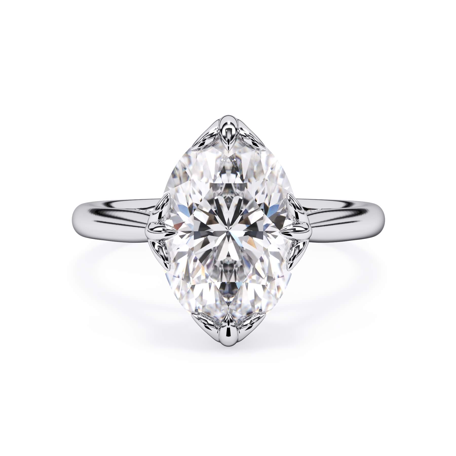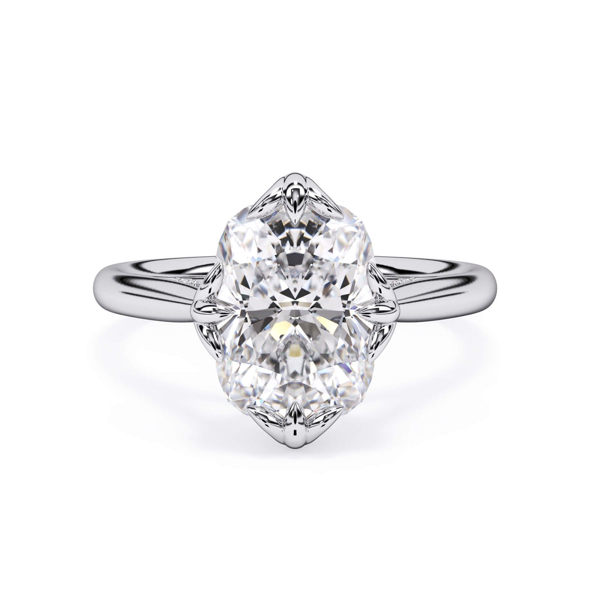 With the fanciful treble prongs, this ring also features an underhalo of sparkling diamonds along with diamonds underneath the cathedral style setting. This triple prong engagement ring evokes a natural, playful beauty that will enhance your center stone.