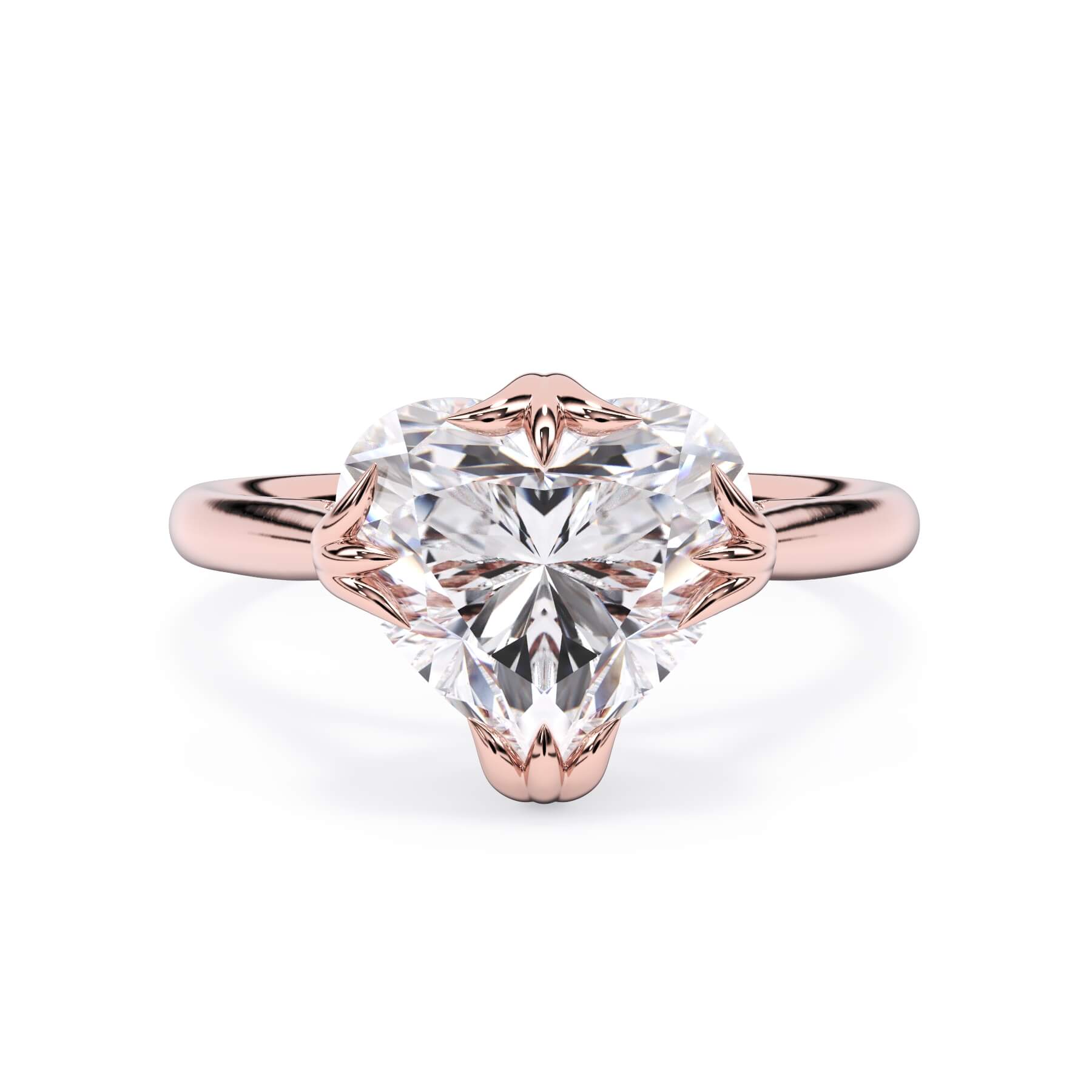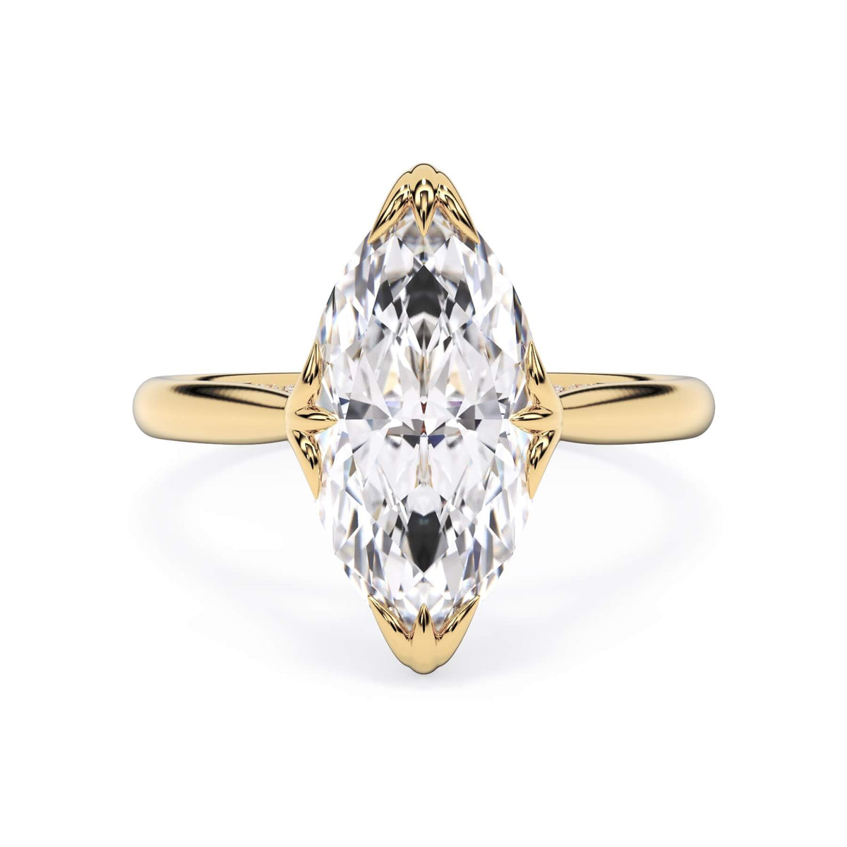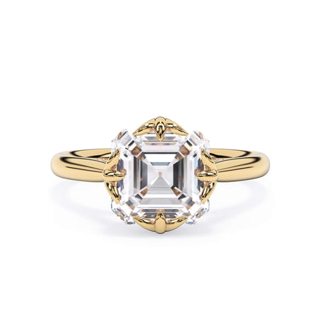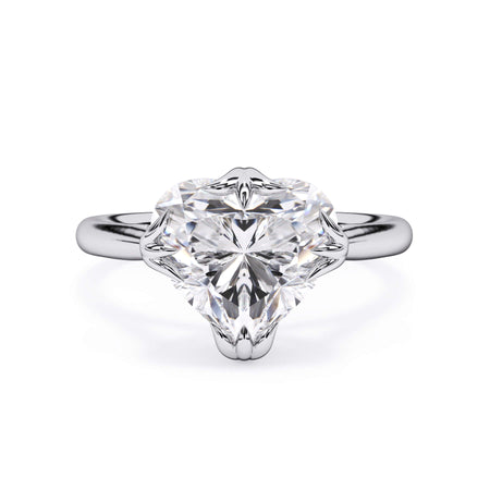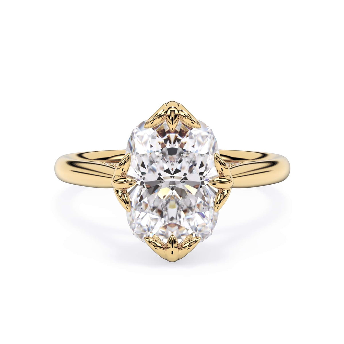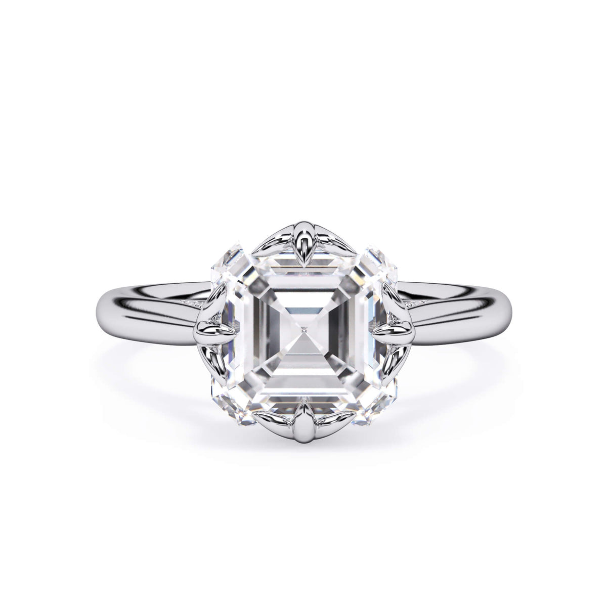 With the fanciful treble prongs, this ring also features an underhalo of sparkling diamonds along with diamonds underneath the cathedral style setting. This triple prong engagement ring evokes a natural, playful beauty that will enhance your center stone.