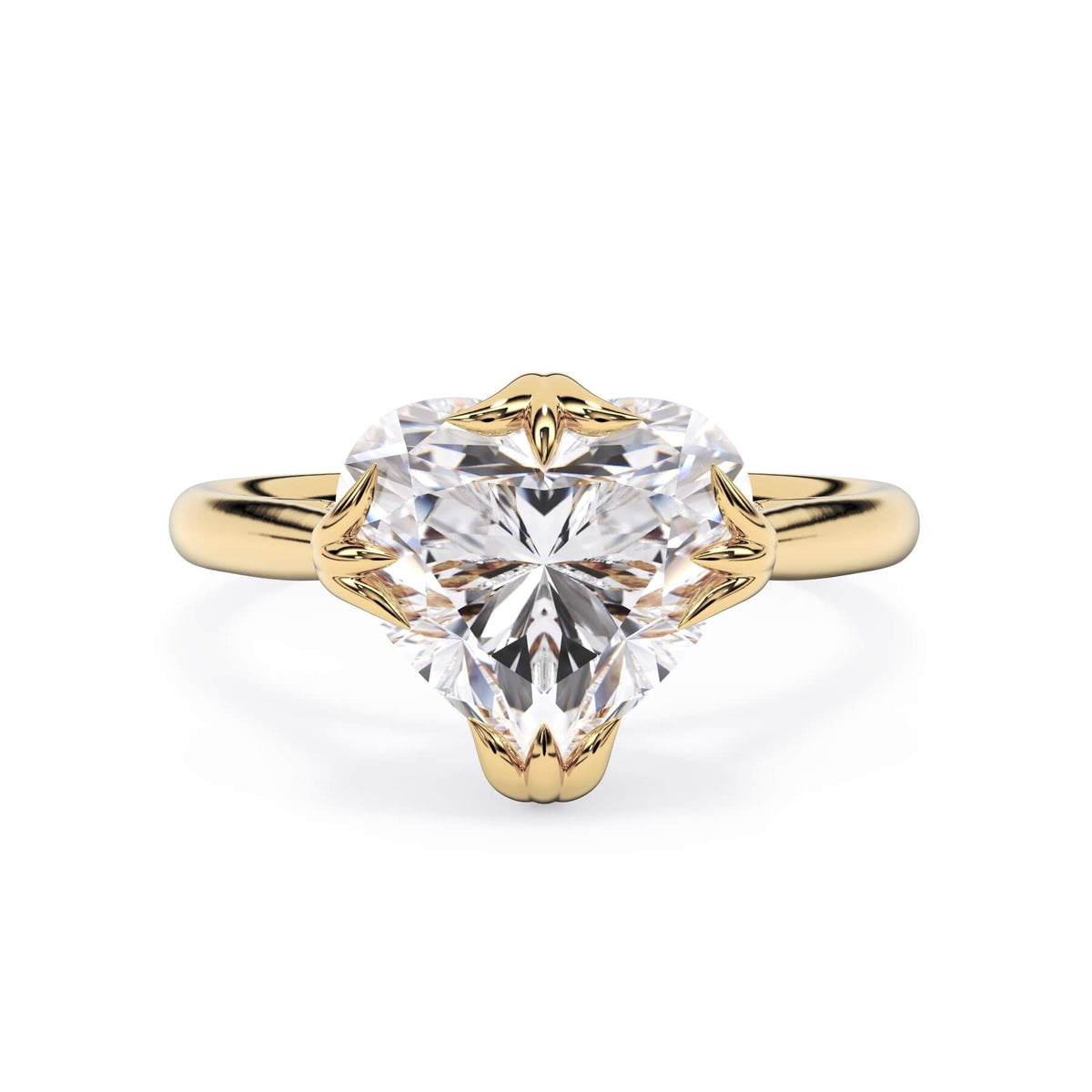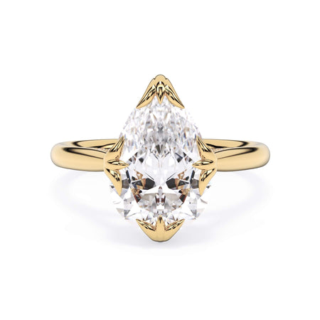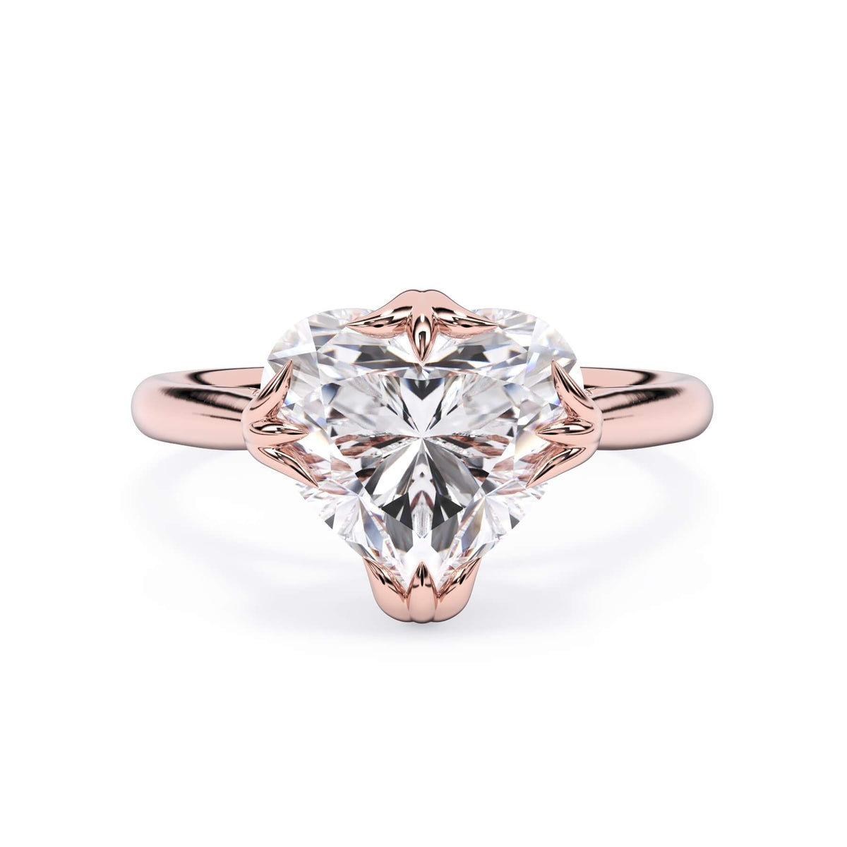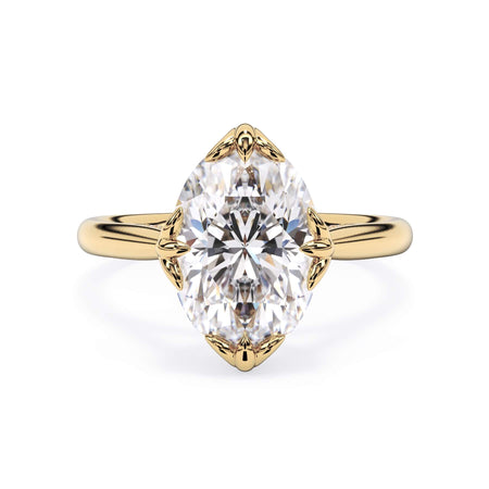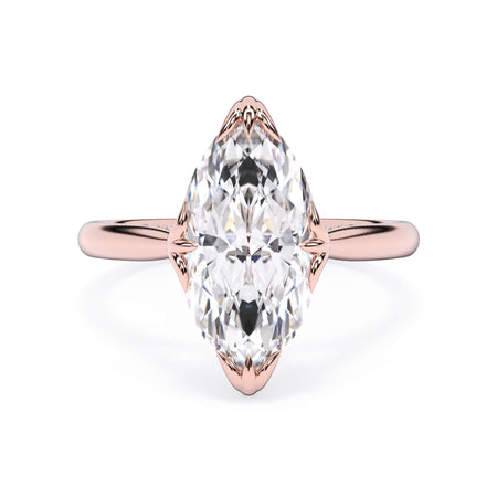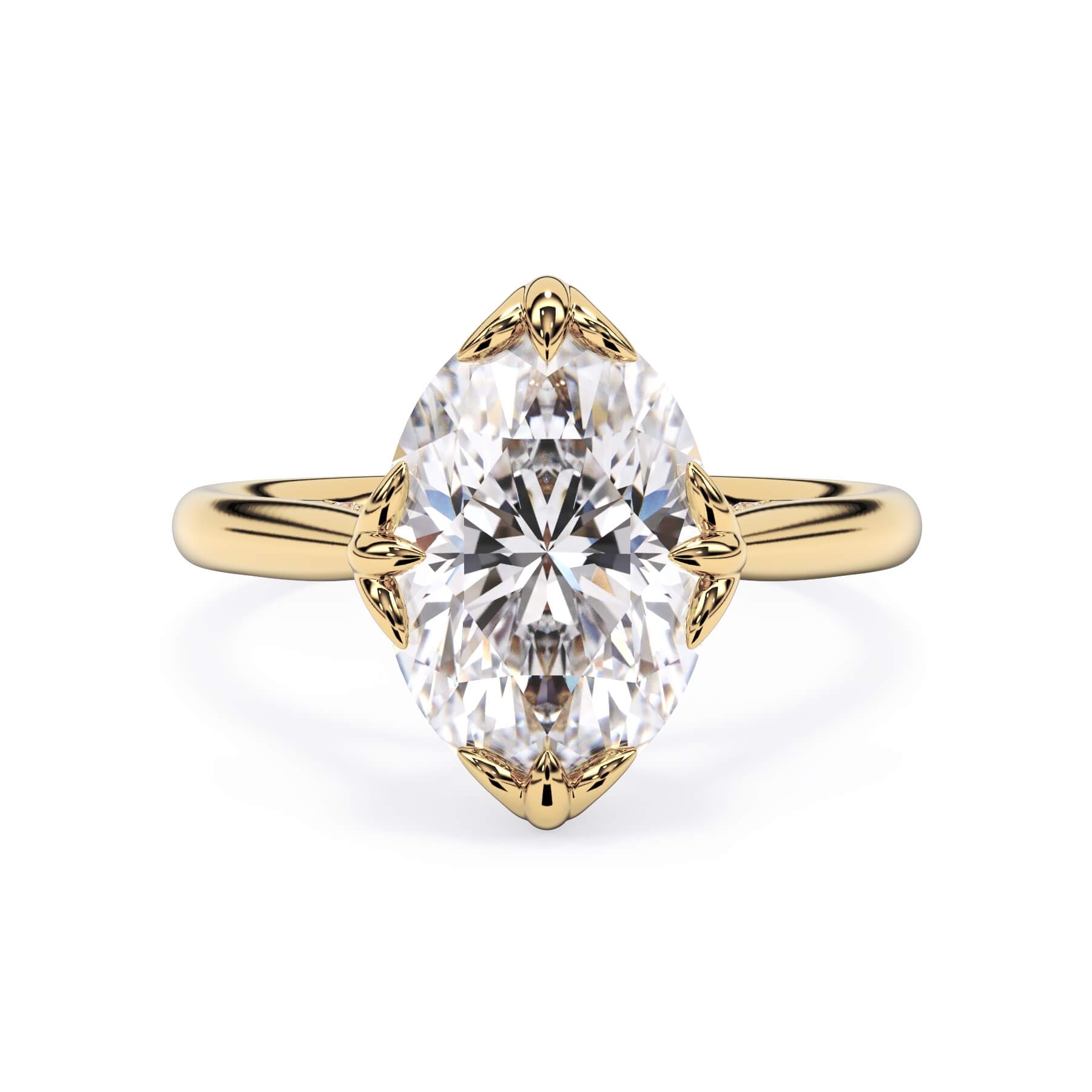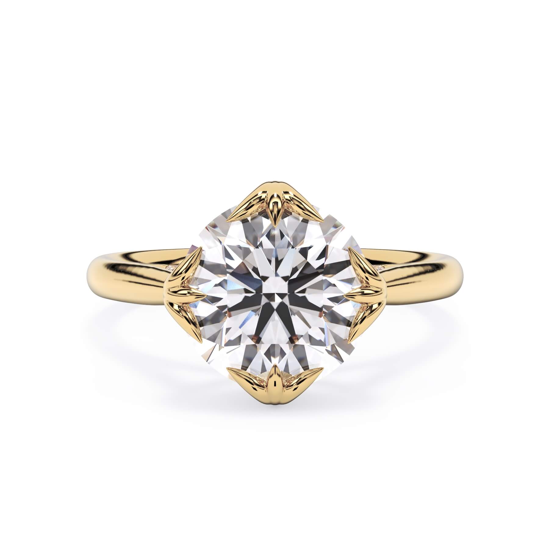 With the fanciful treble prongs, this ring also features an underhalo of sparkling diamonds along with diamonds underneath the cathedral style setting. This triple prong engagement ring evokes a natural, playful beauty that will enhance your center stone.